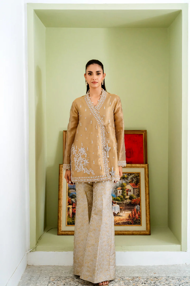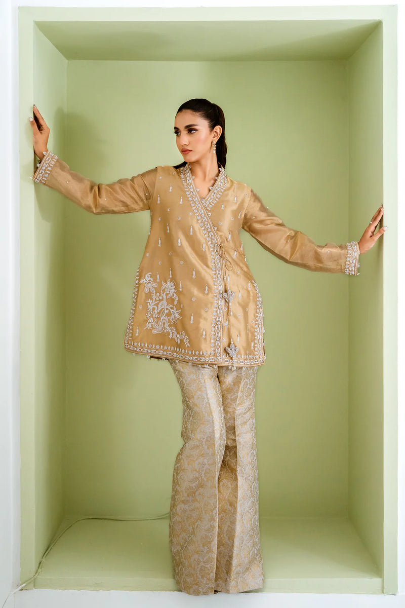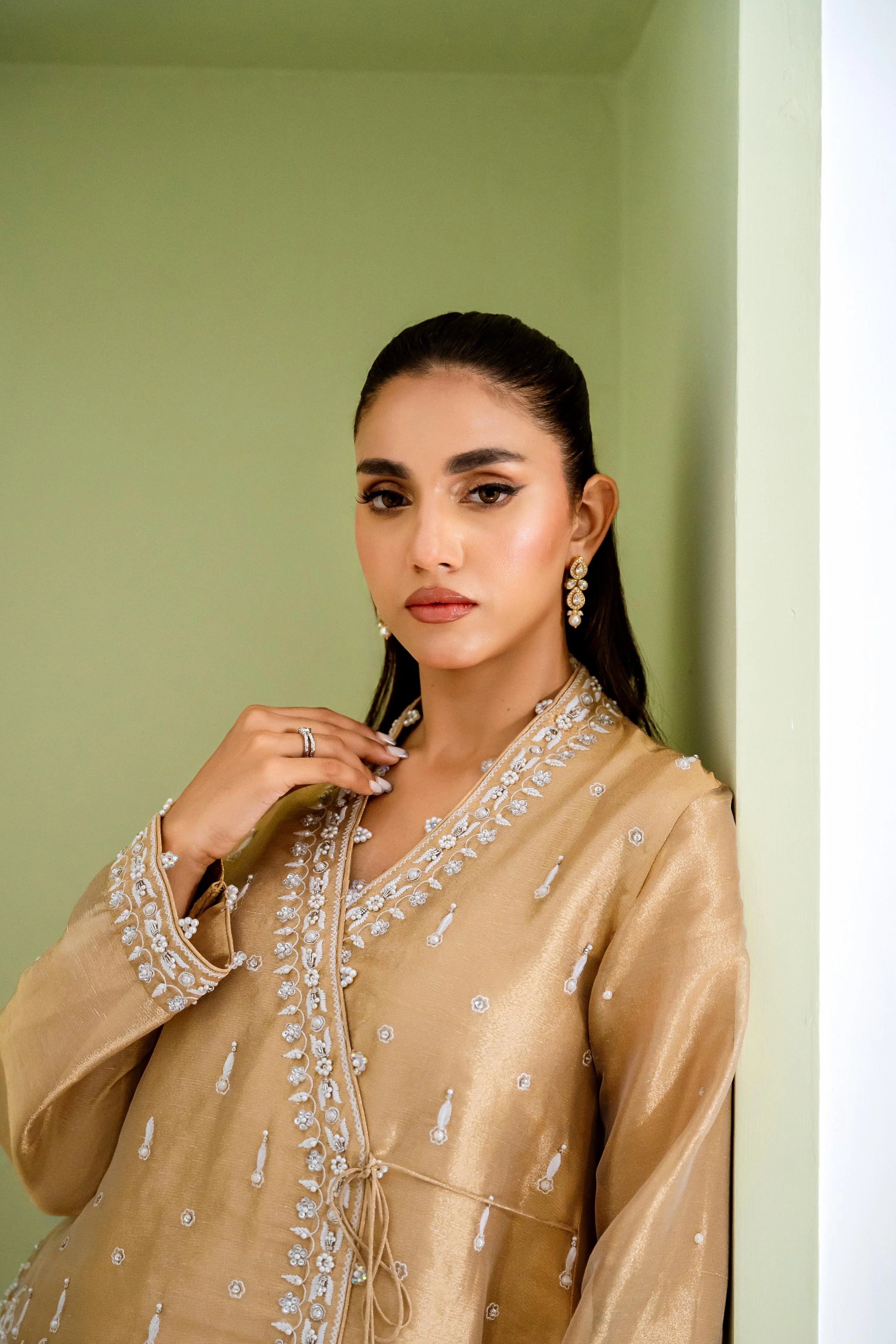 Dazzle in '24 Karat', a luxurious wrap top crafted from premium tissue. Exquisitely adorned with intricate pearl, ivory resham, and jewel-accented borders and motifs, this modern piece radiates opulence. Paired with flowing Banarsi silk pants, this stunning ensemble is perfect for making a glamorous entrance at any special occasion.