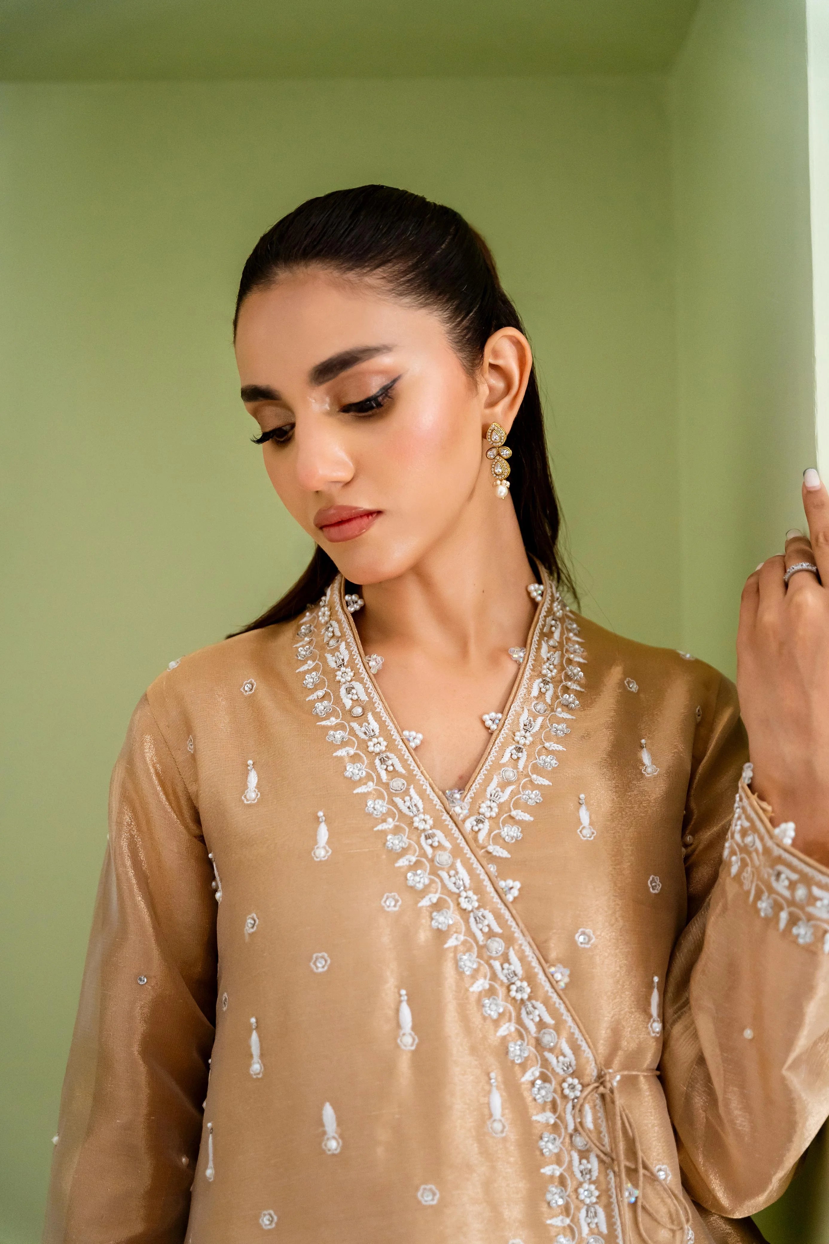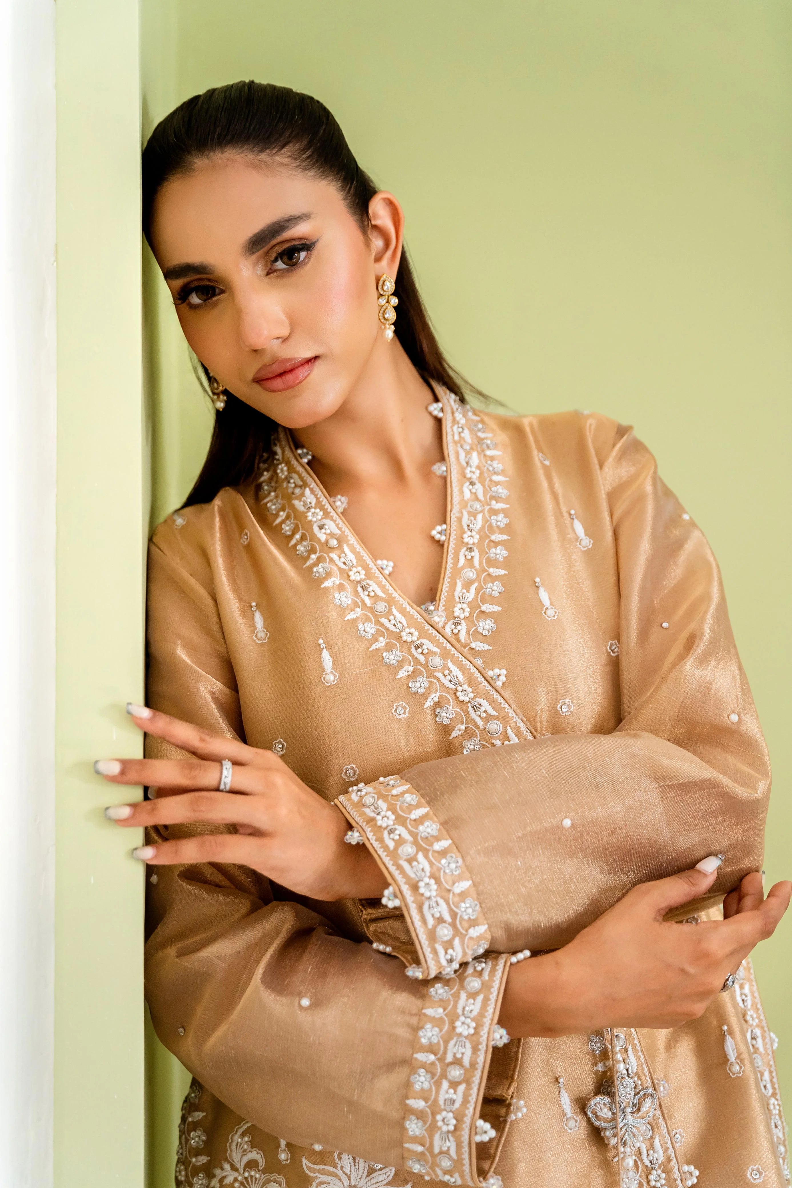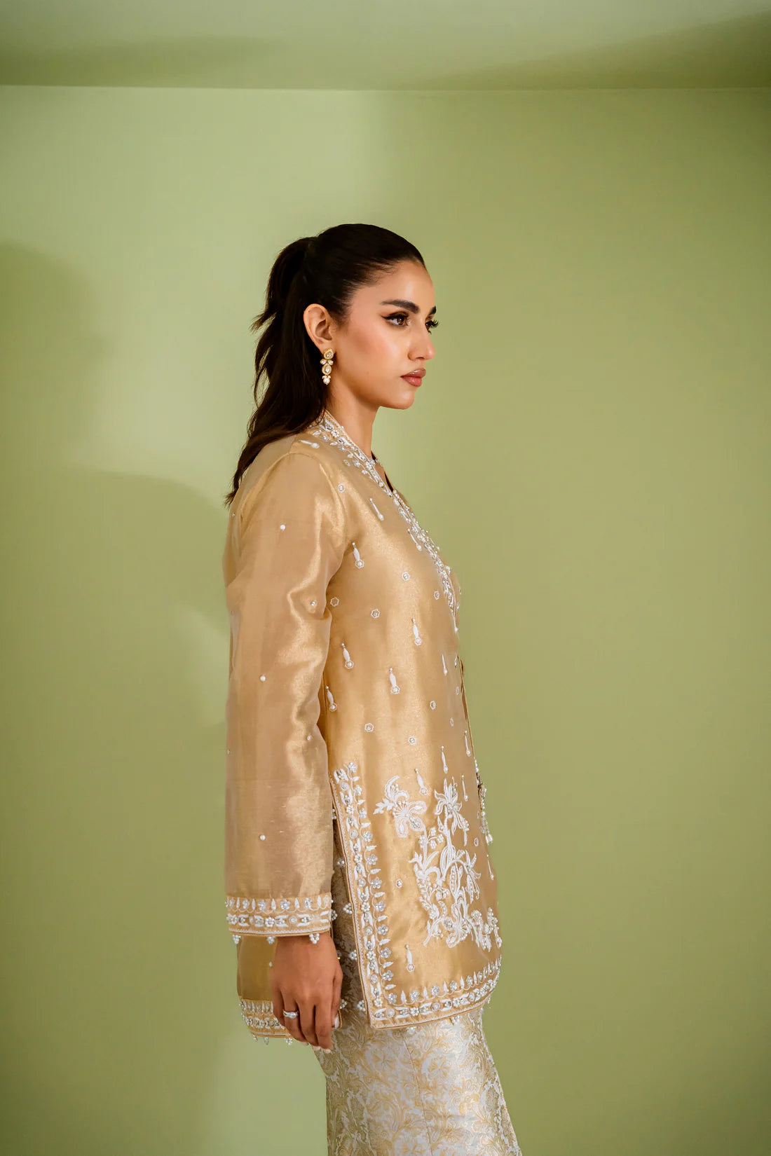 Dazzle in '24 Karat', a luxurious wrap top crafted from premium tissue. Exquisitely adorned with intricate pearl, ivory resham, and jewel-accented borders and motifs, this modern piece radiates opulence. Paired with flowing Banarsi silk pants, this stunning ensemble is perfect for making a glamorous entrance at any special occasion.