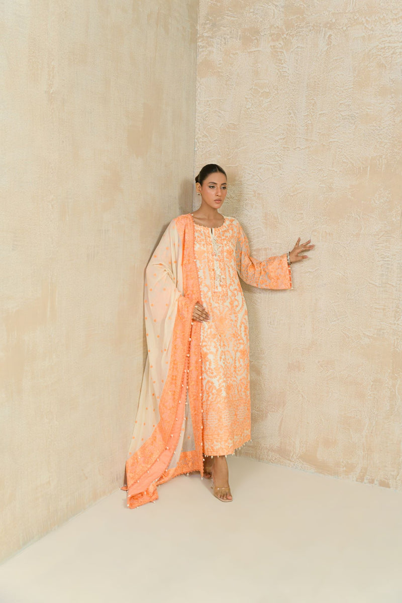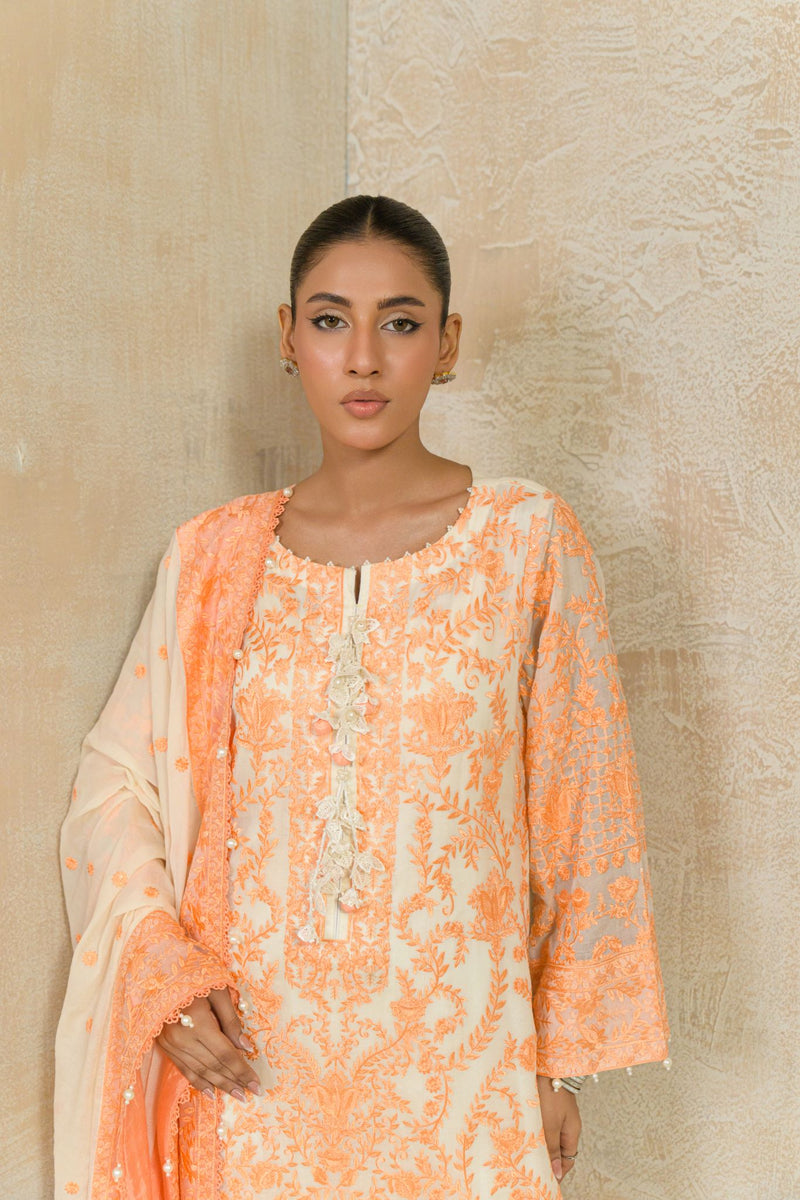 An elegant chanderi long shirt adorned with intricate embroidery and statement assels, paired with cotton silk straight pants and a four-sided embroidered chanderi dupatta classic craftsmanship with a contemporary edge.