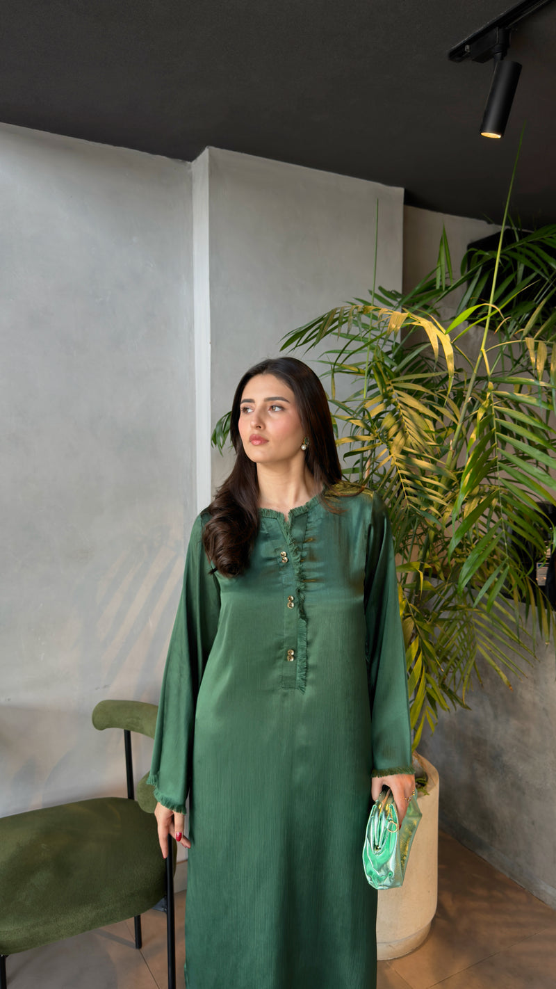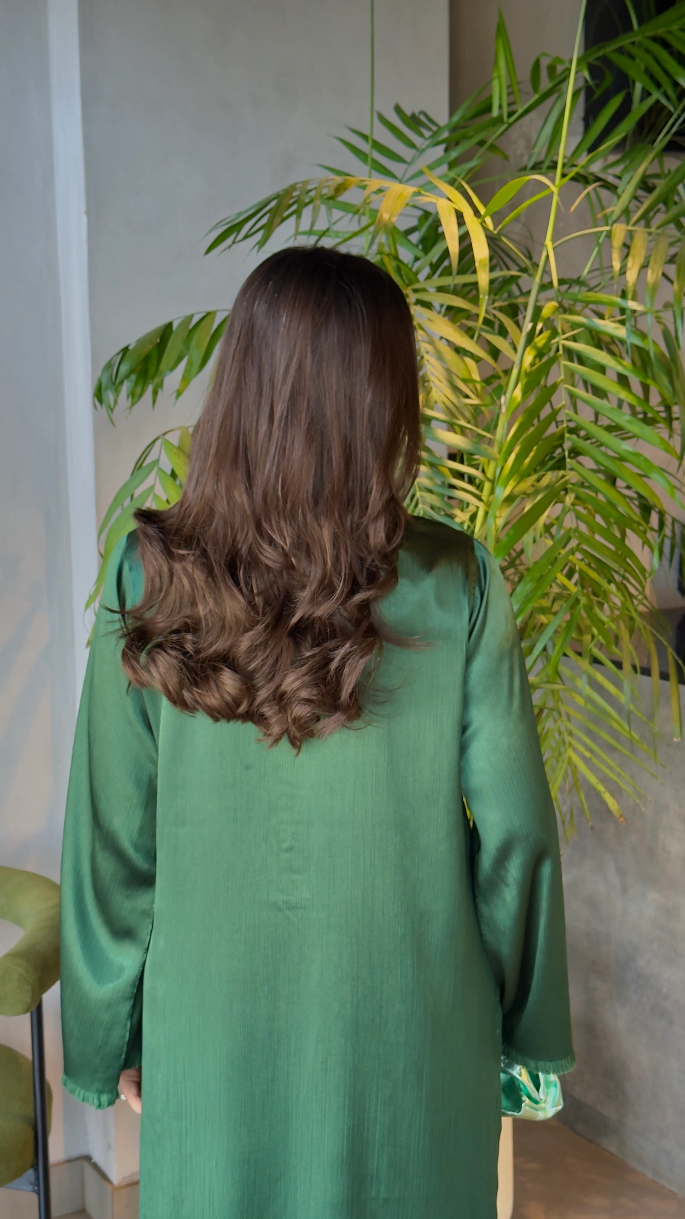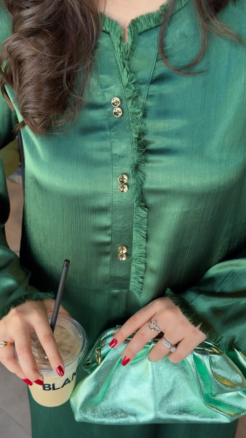 A green cord set tailored from premium silk, with gold buttons and fringe on all over the shirt and pants. The outfit is completed with palazzo pants with fringe detail.