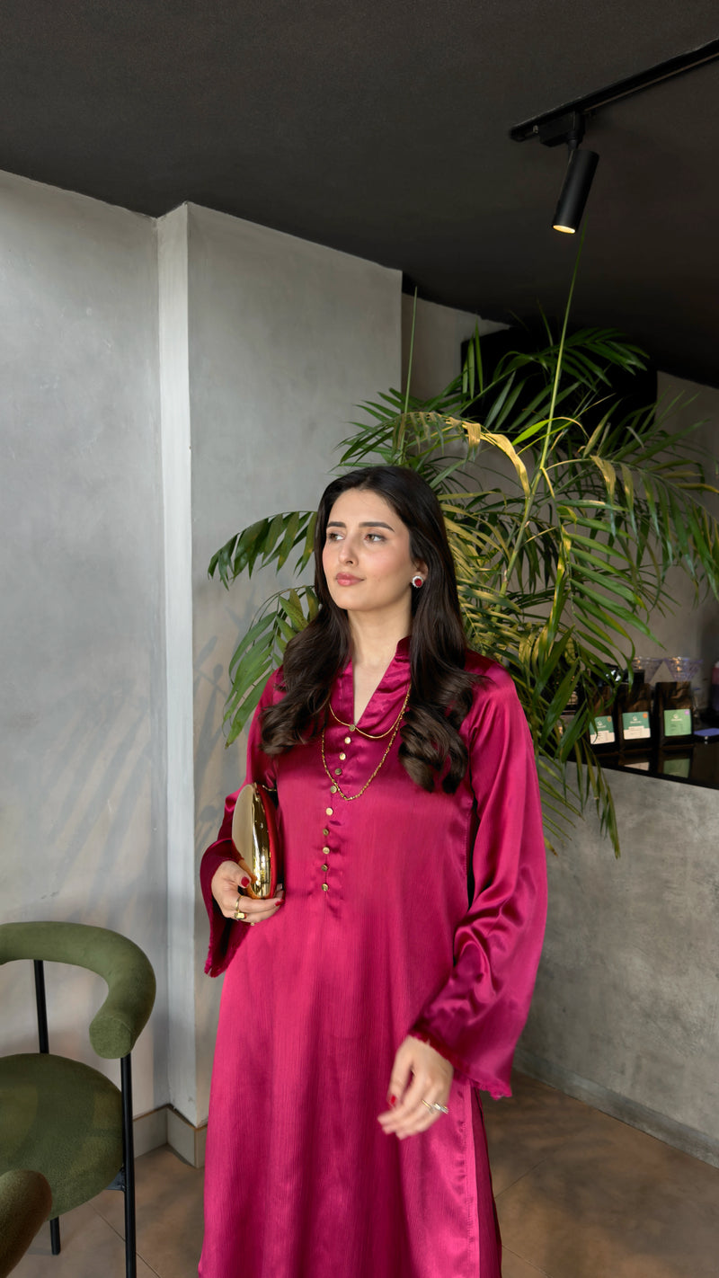 A mauve co-ord set tailored from premium silk, with fringe on all over the shirt and pants. The outfit is completed with palazzo pants with fringe detail.