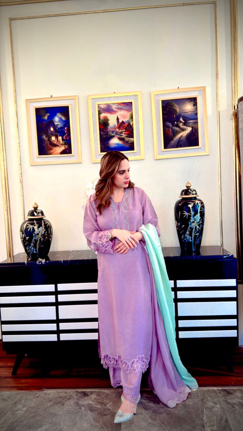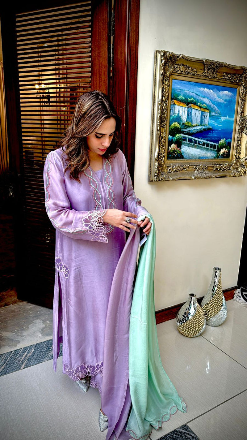 Beautiful and intricate embroidery on the neckline along with minimal cutwork embroidery on the pants,shirt,sleeves and dupatta perfect for your iftars and eid dinners. Paired with ijaar and two toned silk dupatta to give that oomph to your overall look