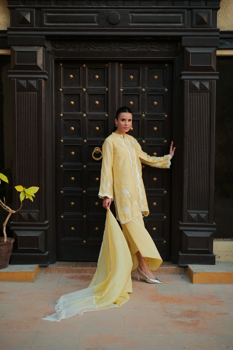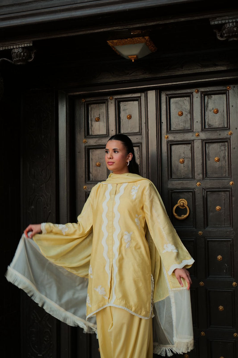 Beautiful and intricate embroidery on the sleeves and overall shirt perfect for your iftars and eid dinners. Paired with flaired pants and silk dupatta with organza detailing to give that oomph to your overall look
