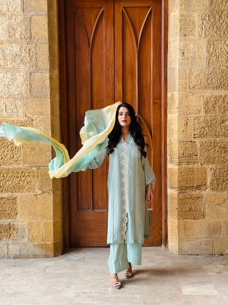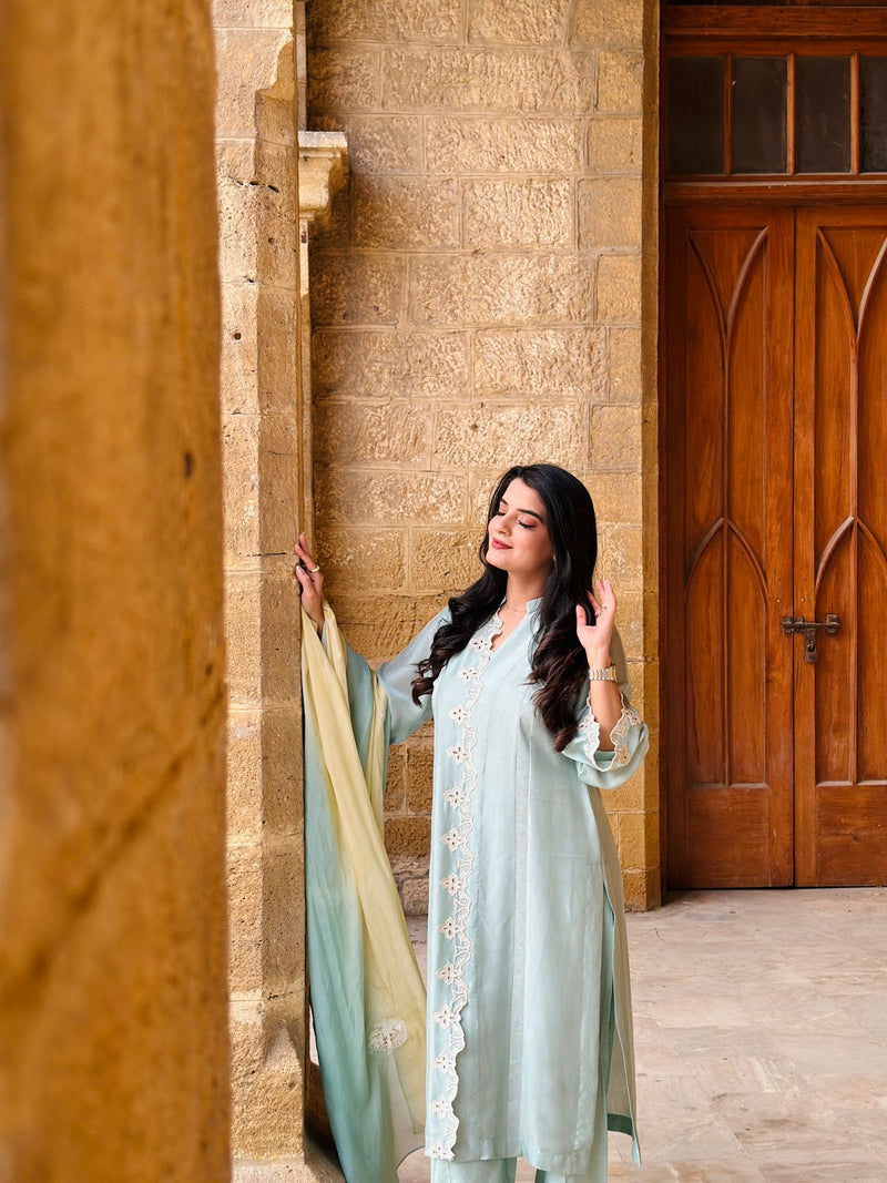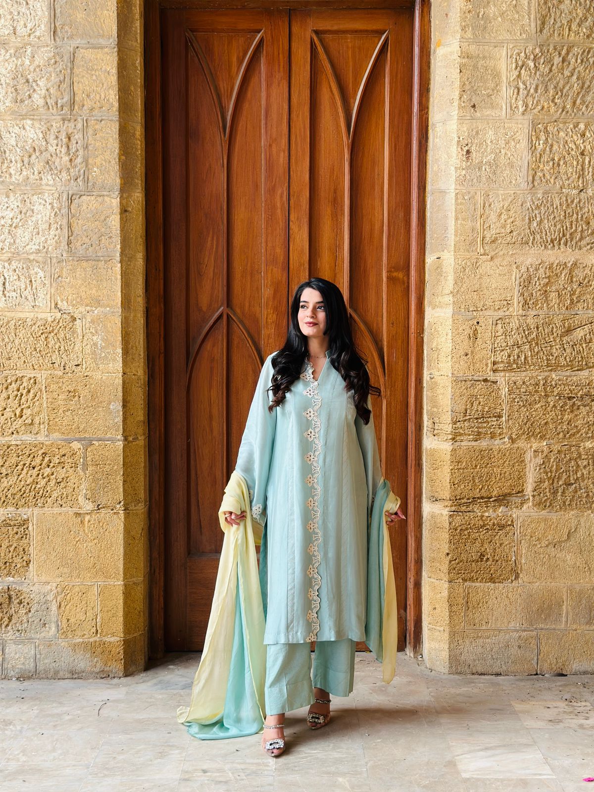 Beautiful and intricate cutwork embroidery down the neckline along with minimal cutwork embroidery on the sleeves and dupatta perfect for your iftars and eid dinners. Paired with ijaar and two toned silk dupatta with cutwork motifs to give that oomph to your overall look