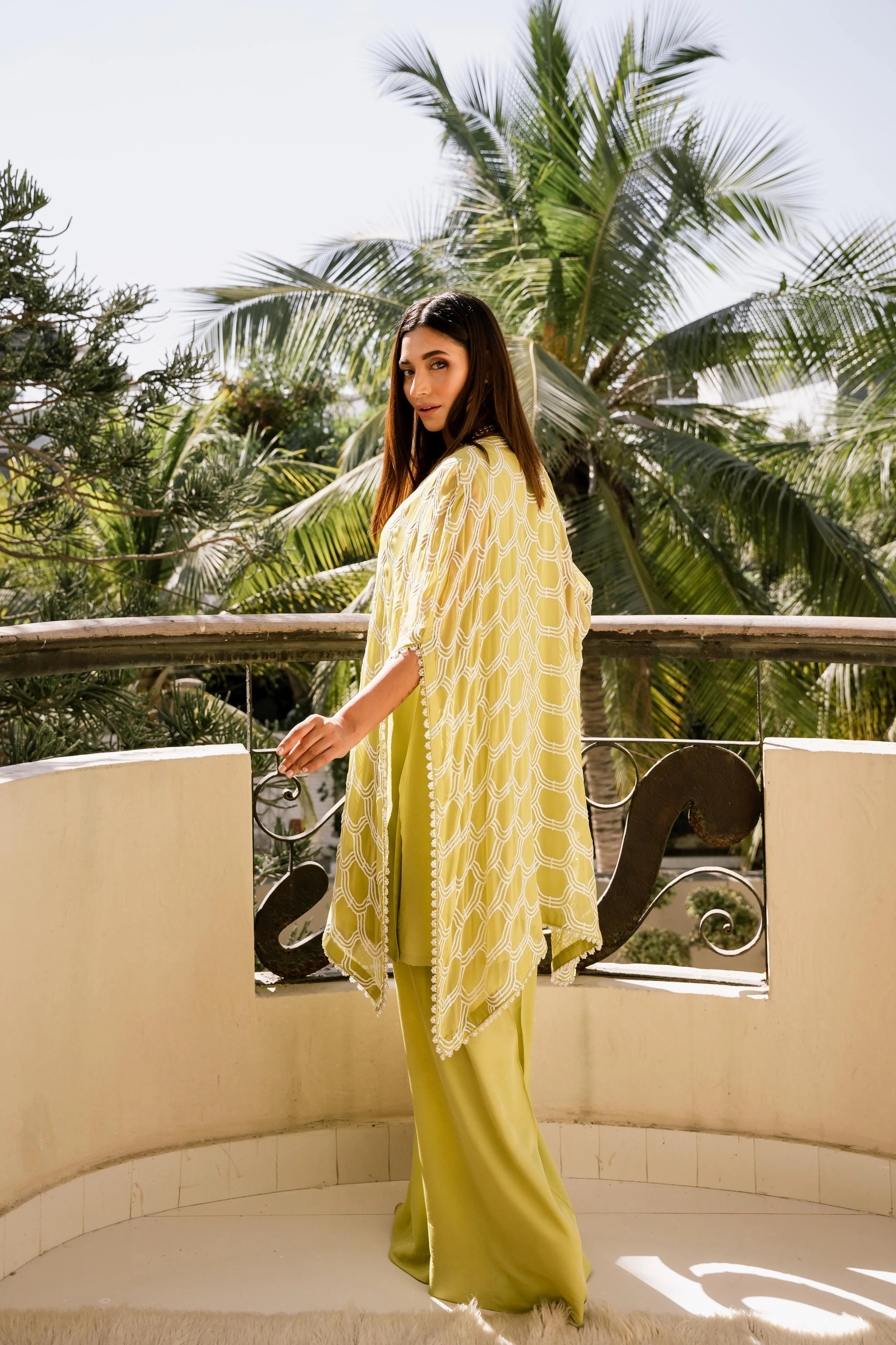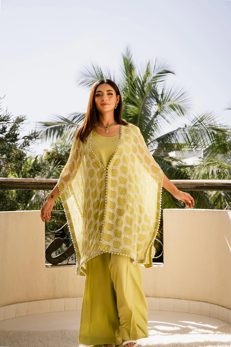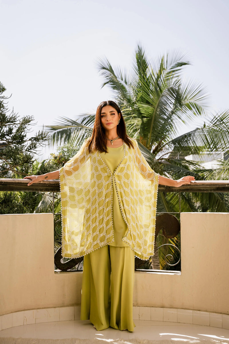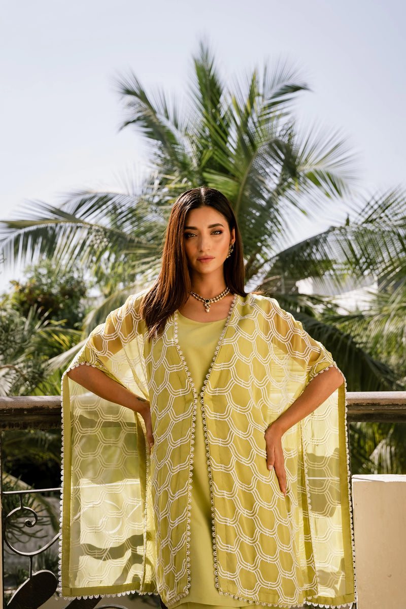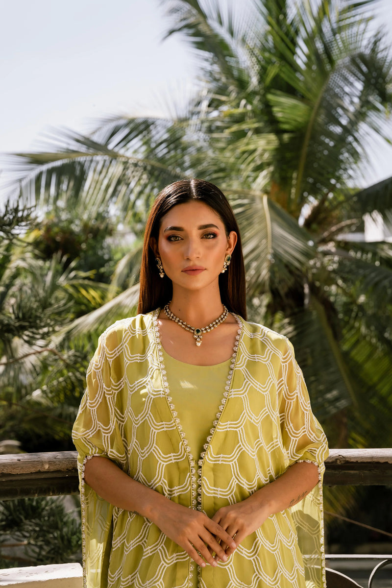 Effusing opulence! This stunning chiffon top is a masterpiece of understated luxury, featuring an intricate sequin pattern with a delicate beaded border, expertly worked with pearls, and crystals. Complemented by a matching silk ejaar and camisole, this one-of-a-kind piece drapes elegantly on the body, tailored for a comfortable and relaxed fit.