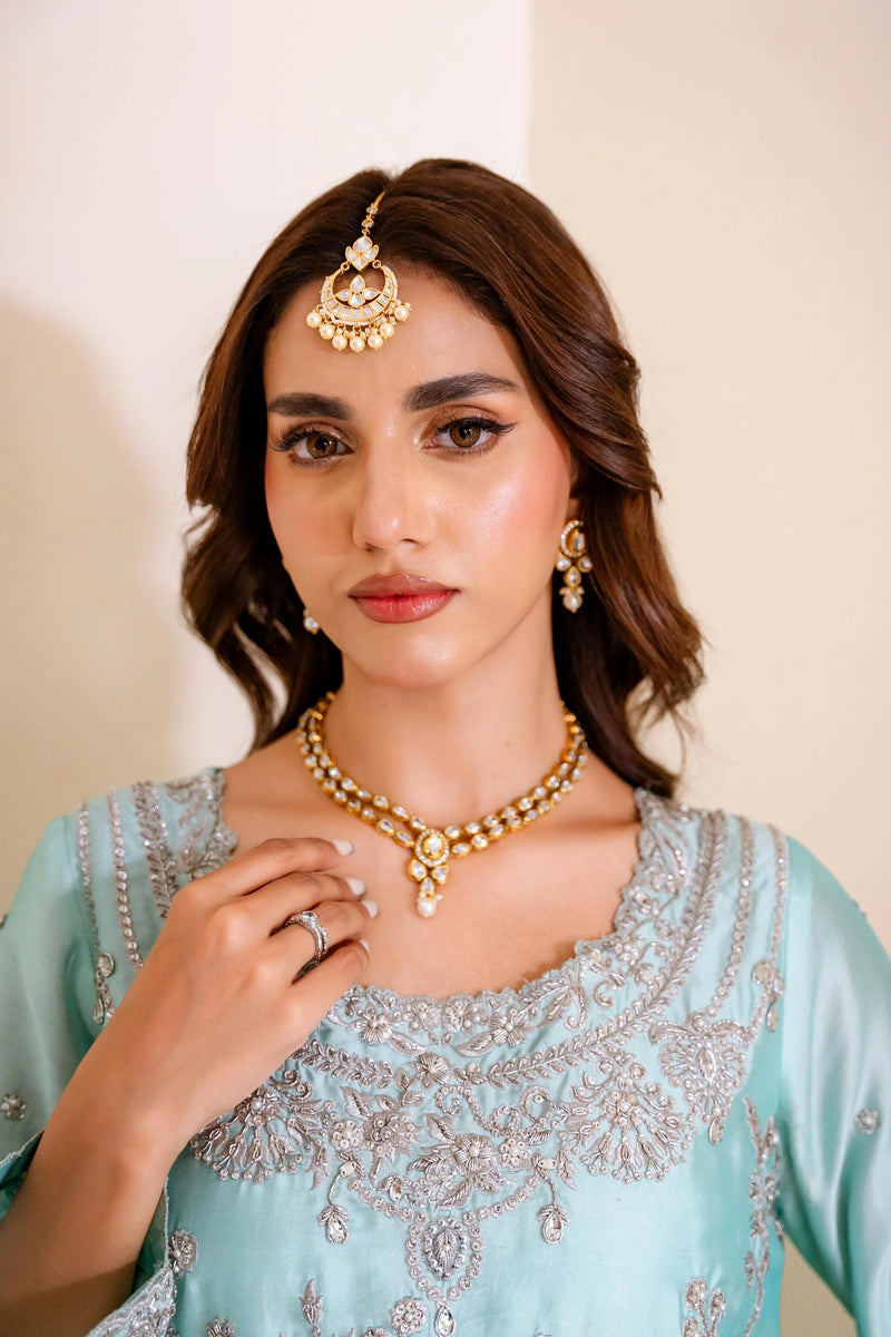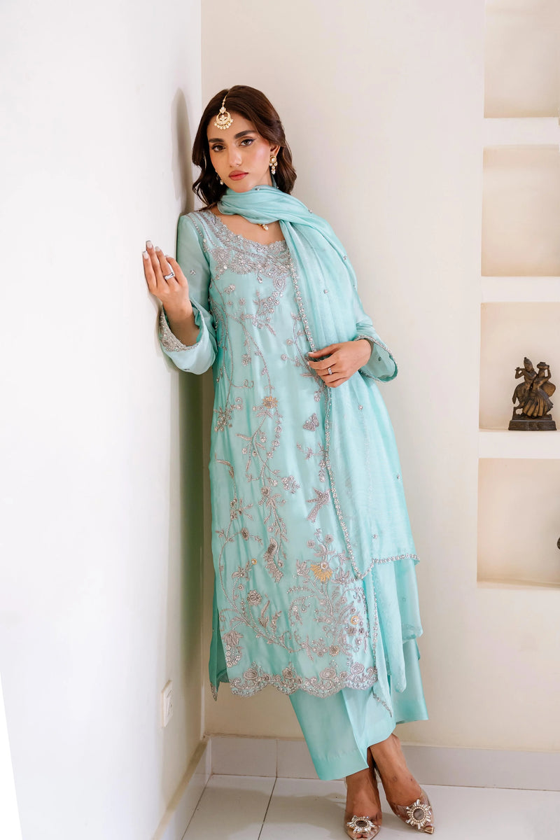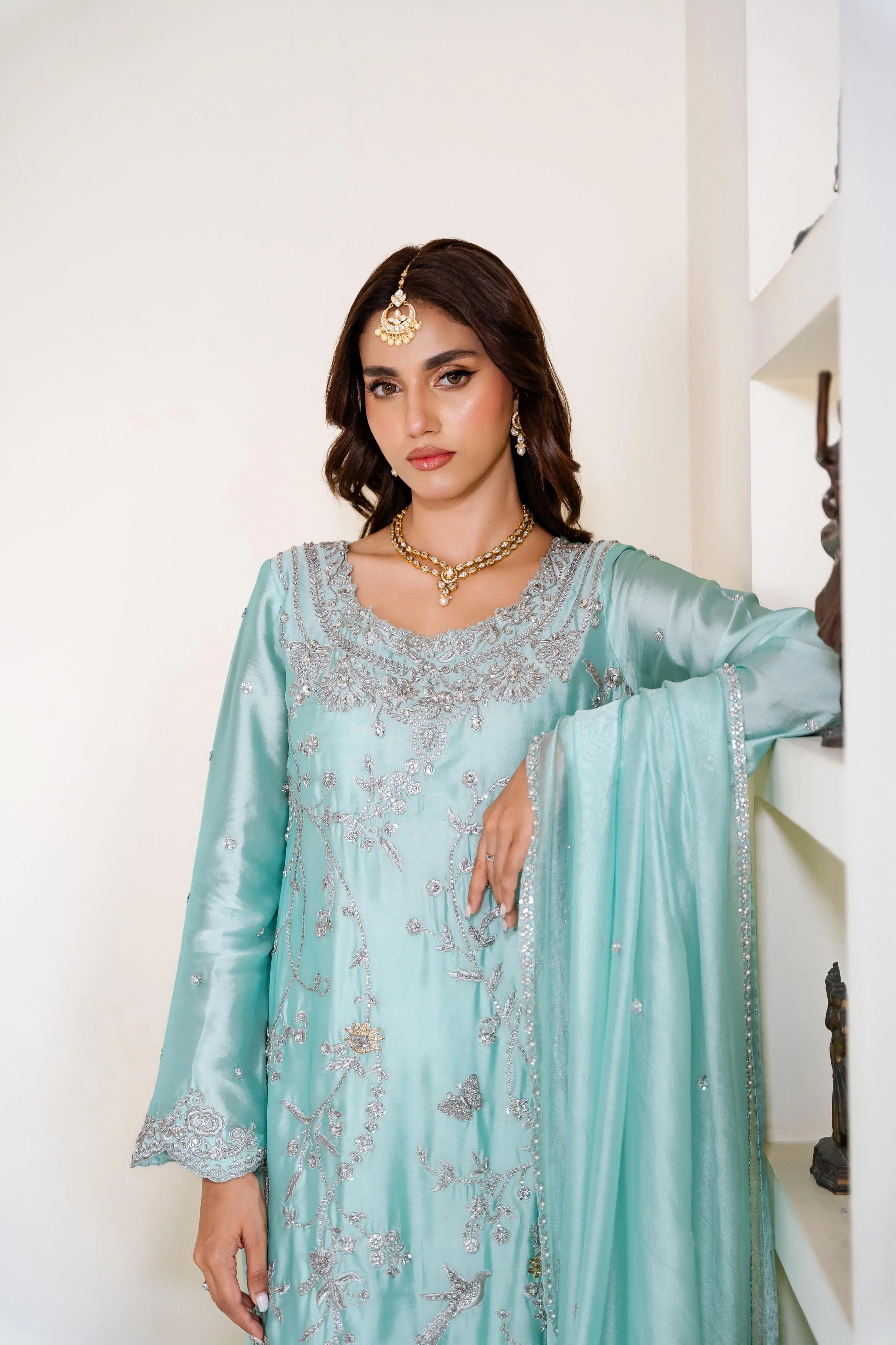 - Pastel Aqua: Sheesha Silk/ Sheesha silk ezaar/ Spun Silk Net Dupatta