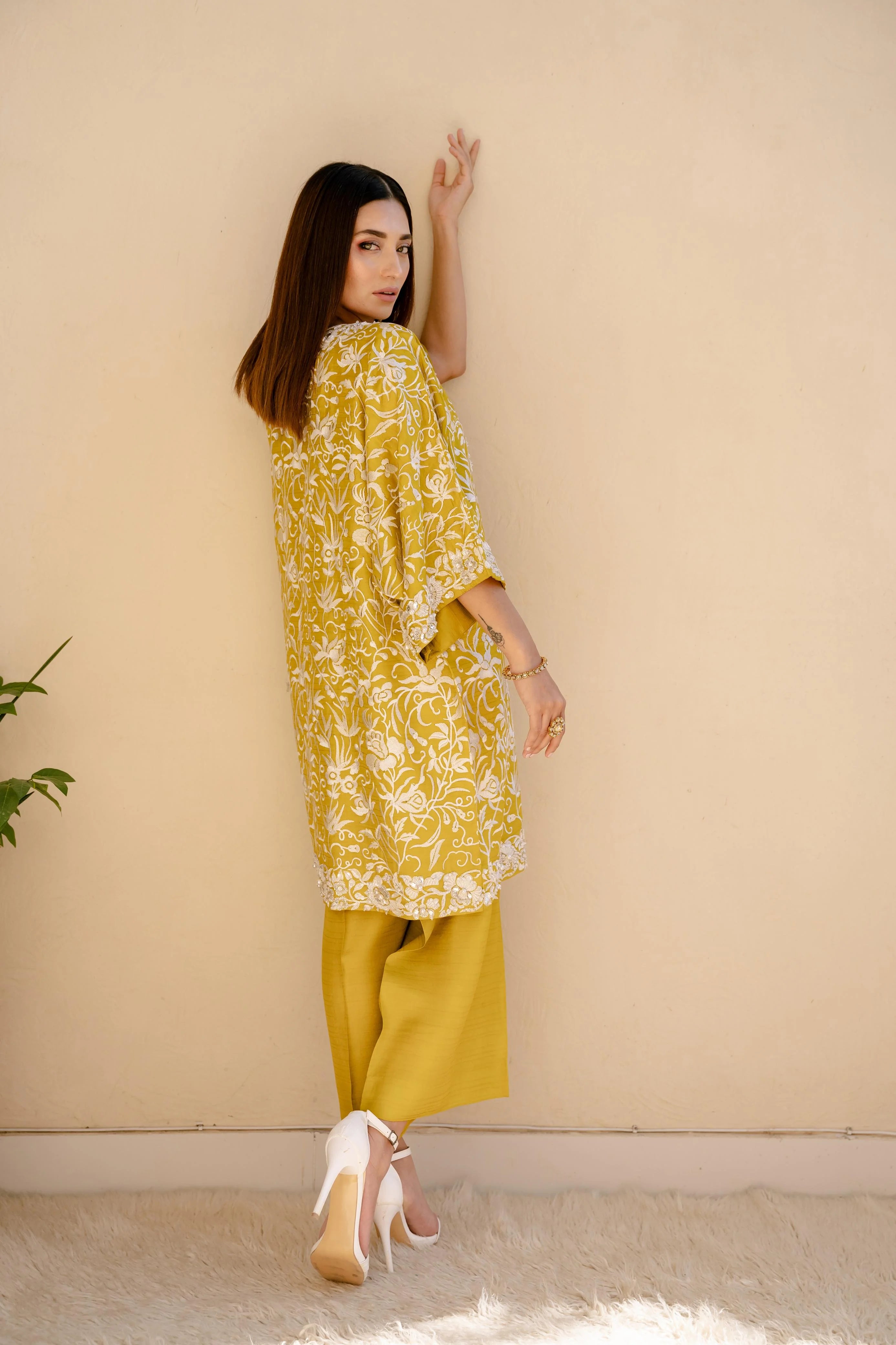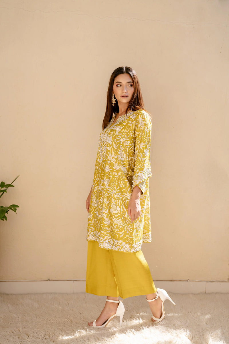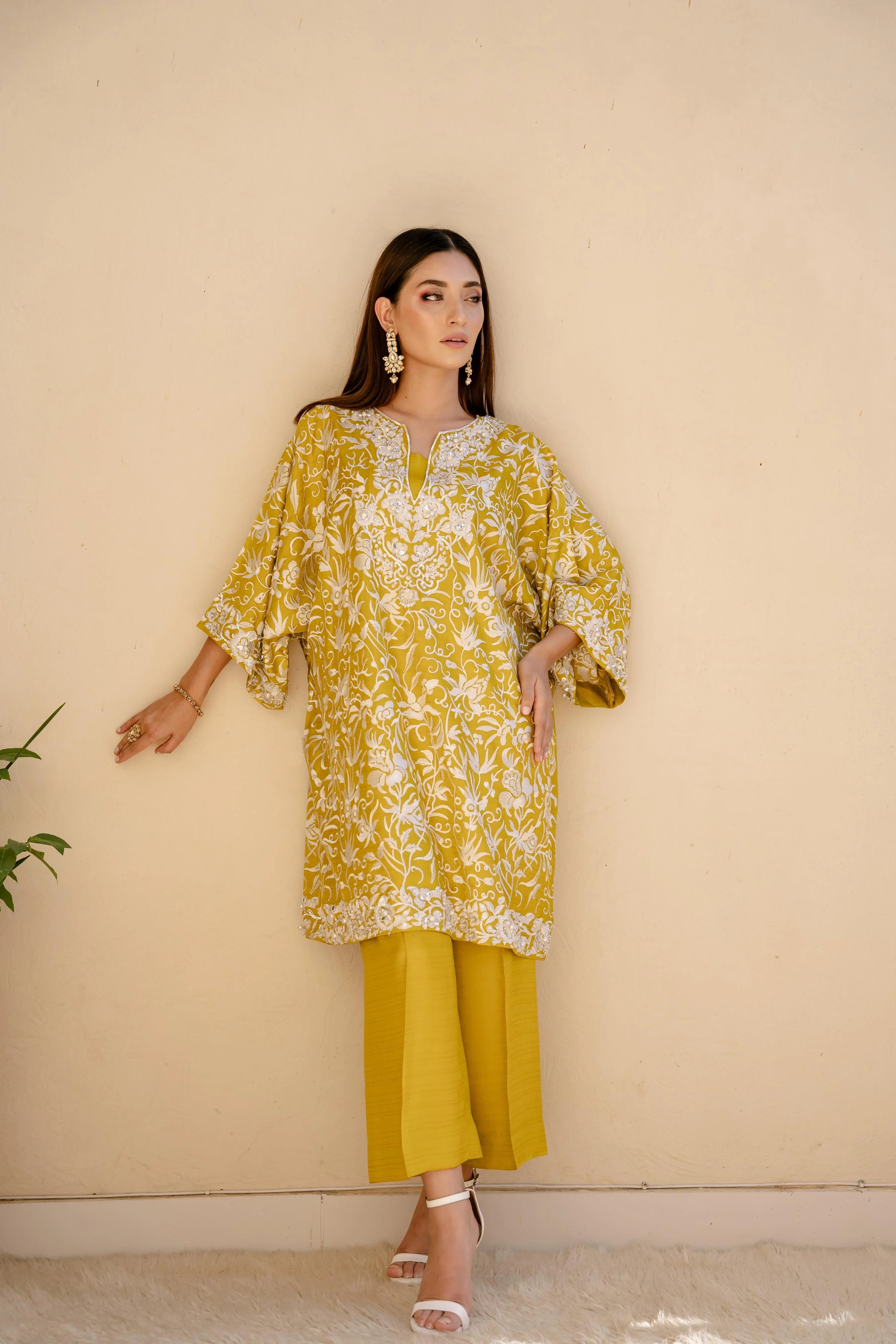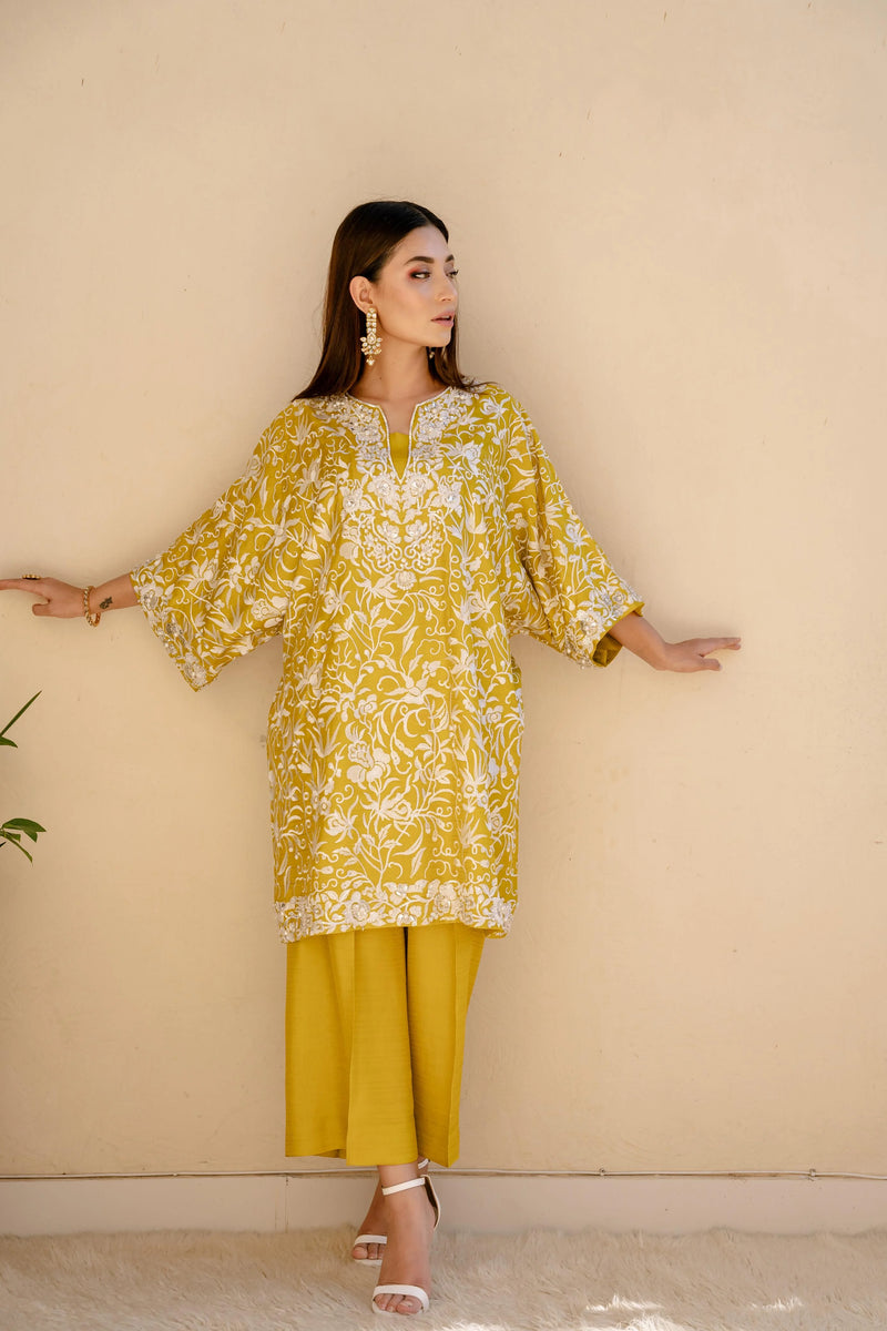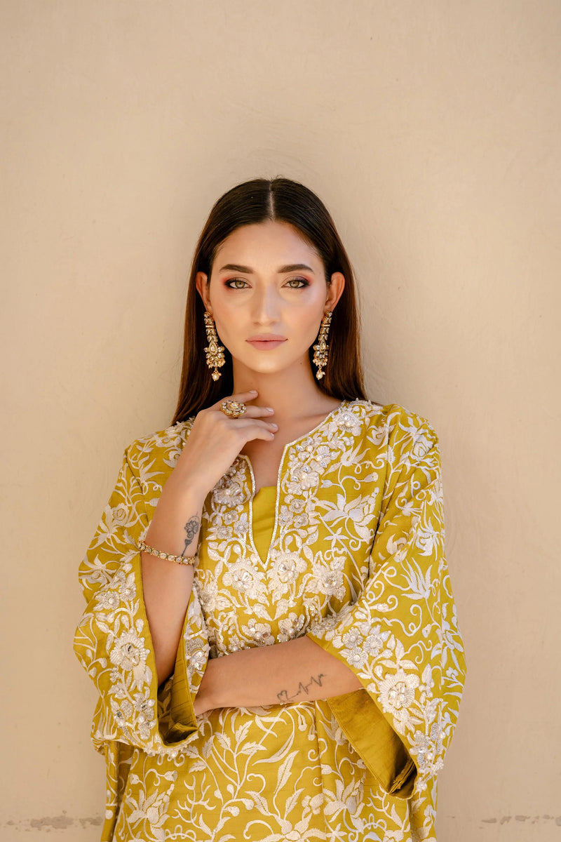 Elegance embodied! This exquisite silk top showcases finely crafted ivory Resham embroidery, intricately embellished with pearls, sequins, bugle beads, and crystals, creating a true masterpiece of contemporary artistry. The soft silk fabric drapes elegantly on the body, while the batwing sleeves add a touch of modern sophistication. Paired with silk ejaar for a complete and stylish look, this stunning set is available in a palette of bold and vibrant hues - scarlet, crimson, emerald green, and mustard - perfect for making a statement at any occasion.