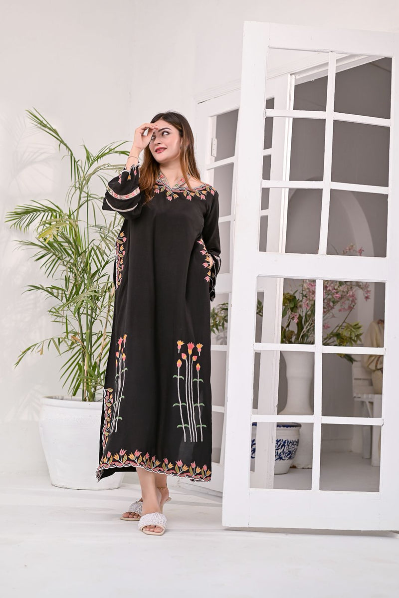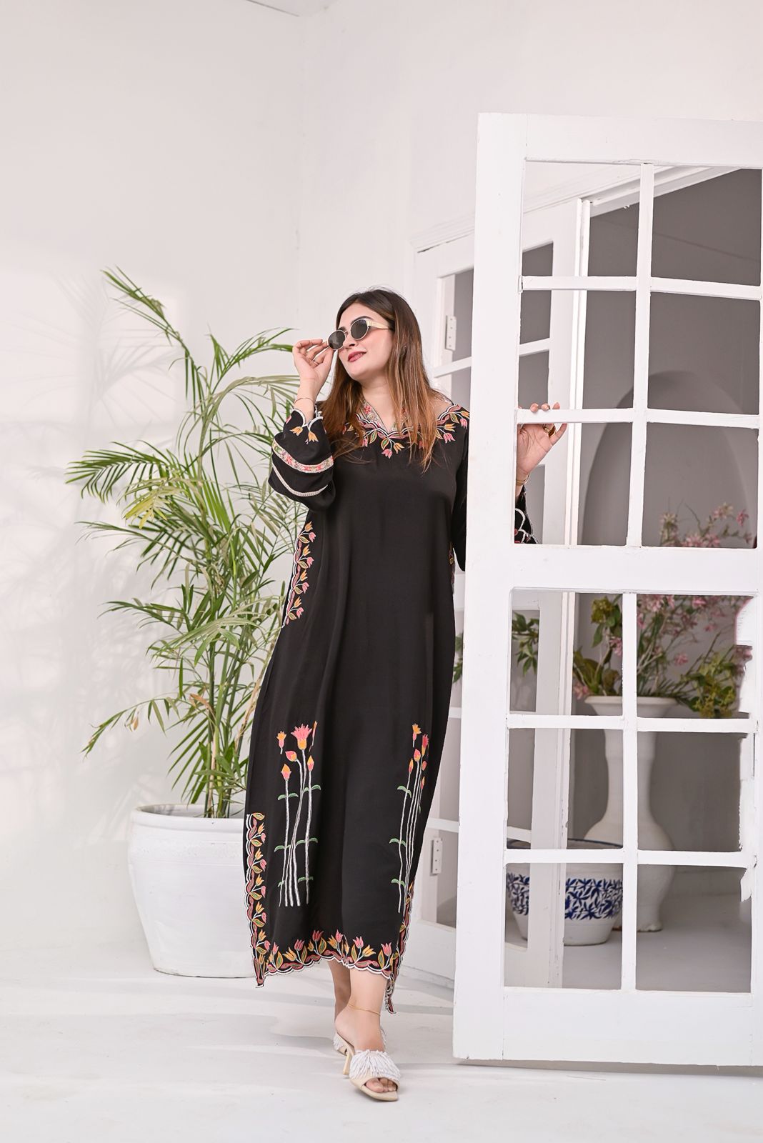 A beautiful, intricately embroidered kaftan with pockets to give a comfy yet chic feel to it. Can be customised into any shade. Dm to order yours