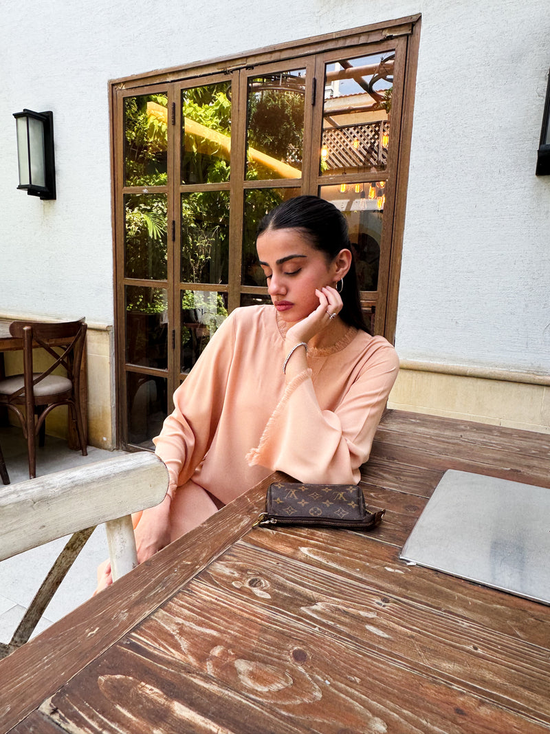 - Straight shirt with fringe details on neckline, sleeves, and daman, straight full sleeves, plain back and palazzo pants with fringe details.