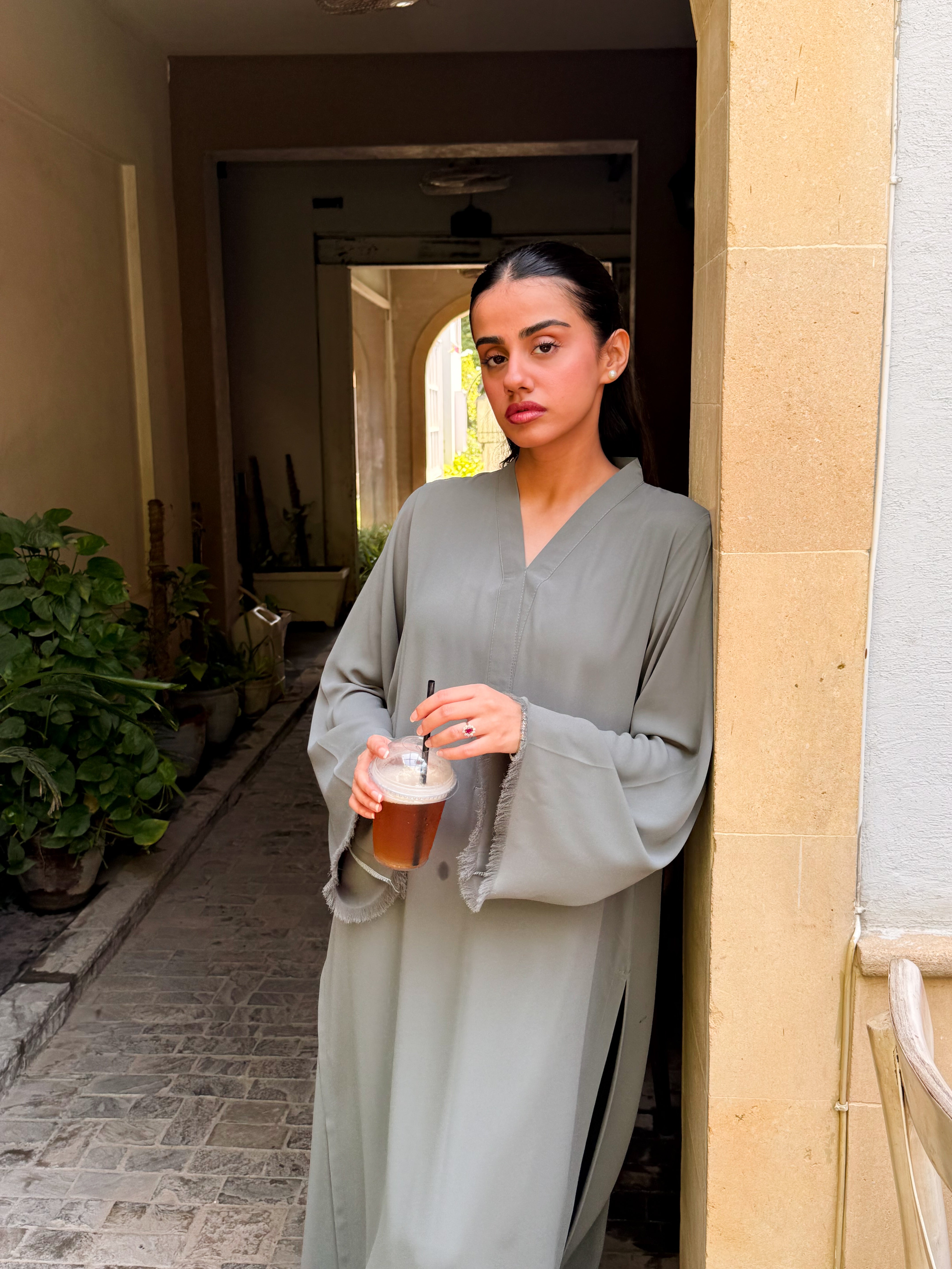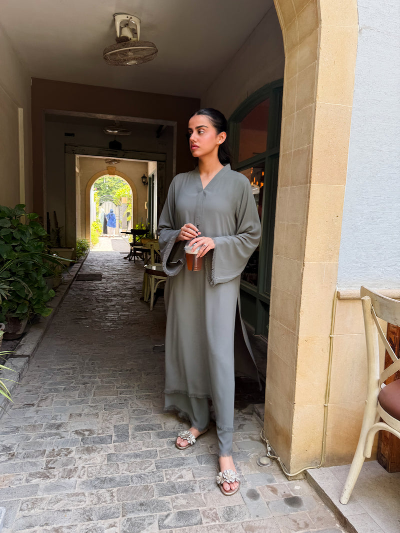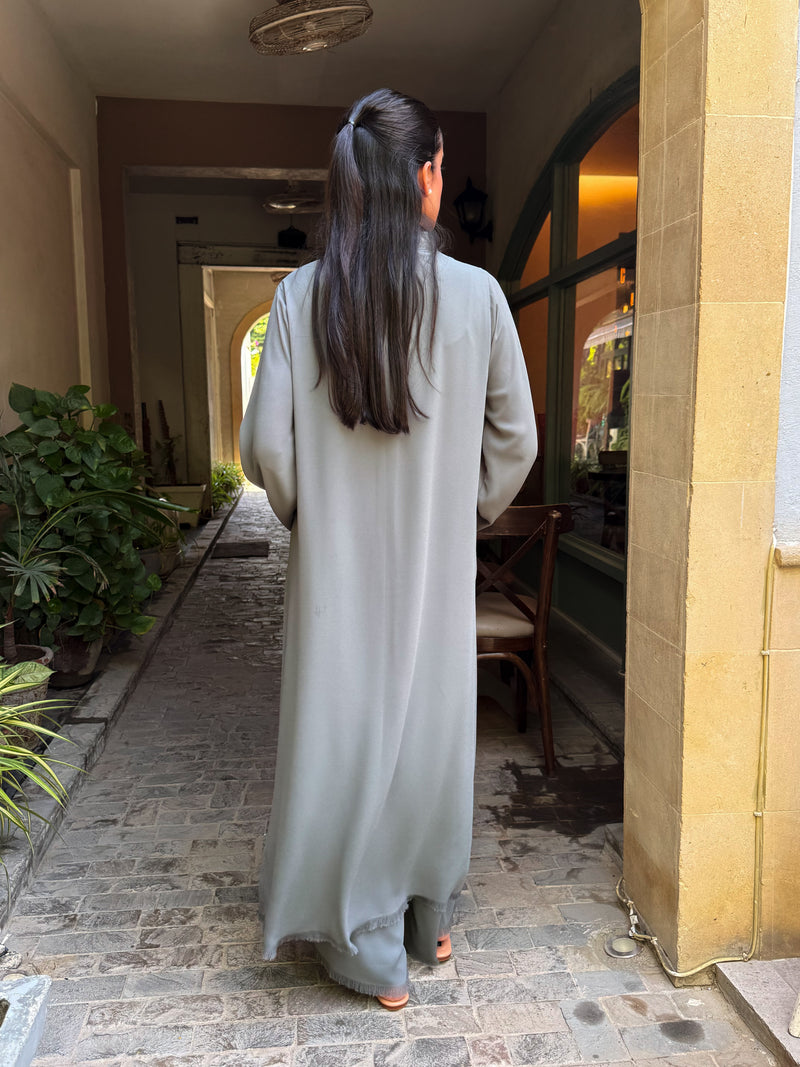- Straight shirt with fringe details on neckline, sleeves, and daman, straight full sleeves, plain back and palazzo pants with fringe details.