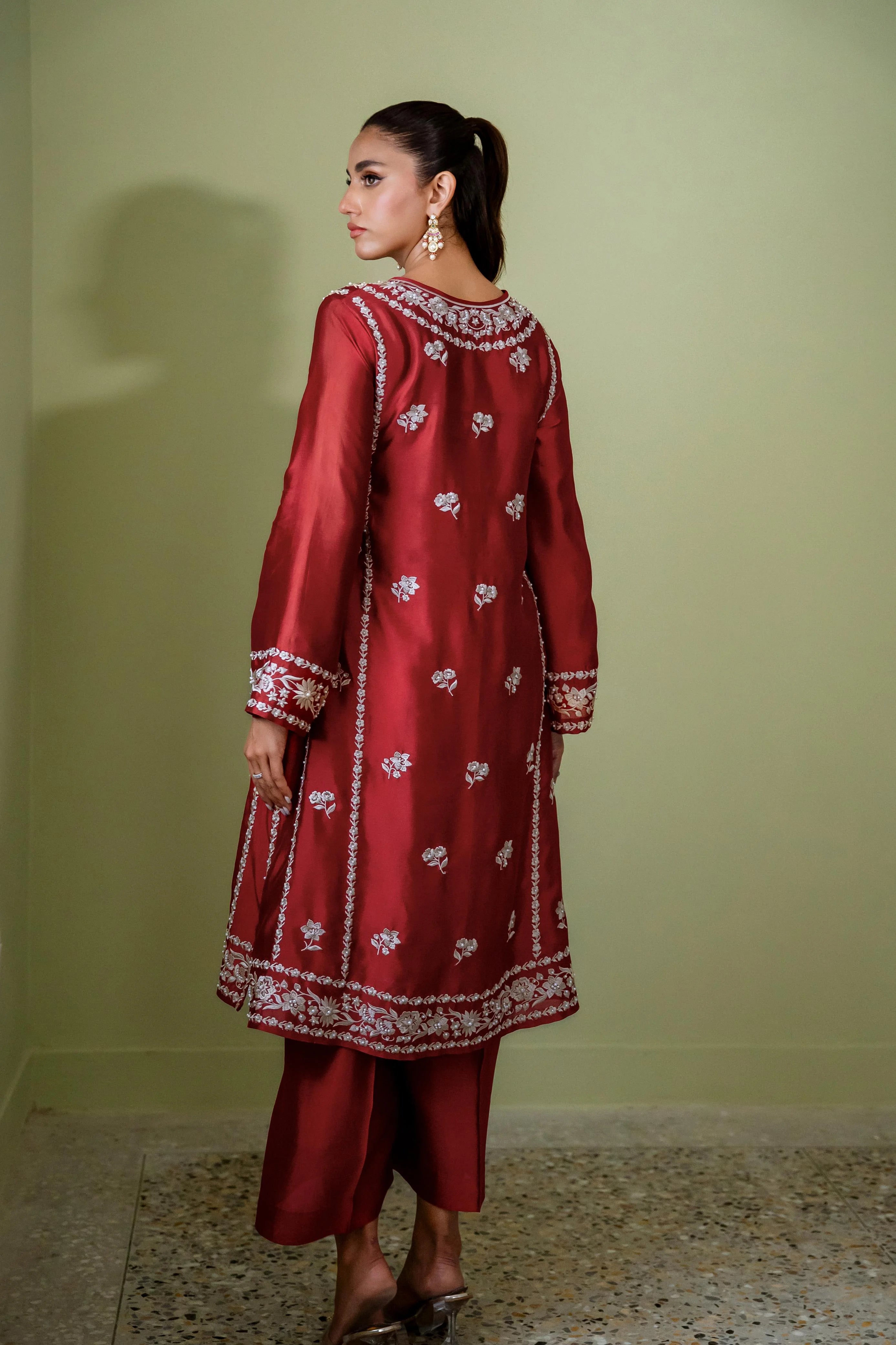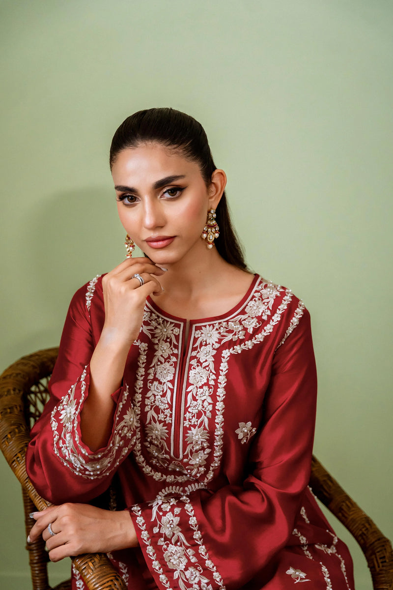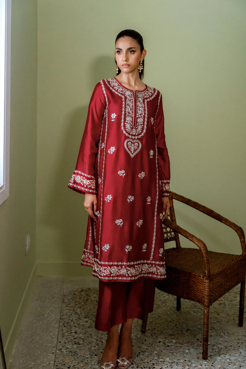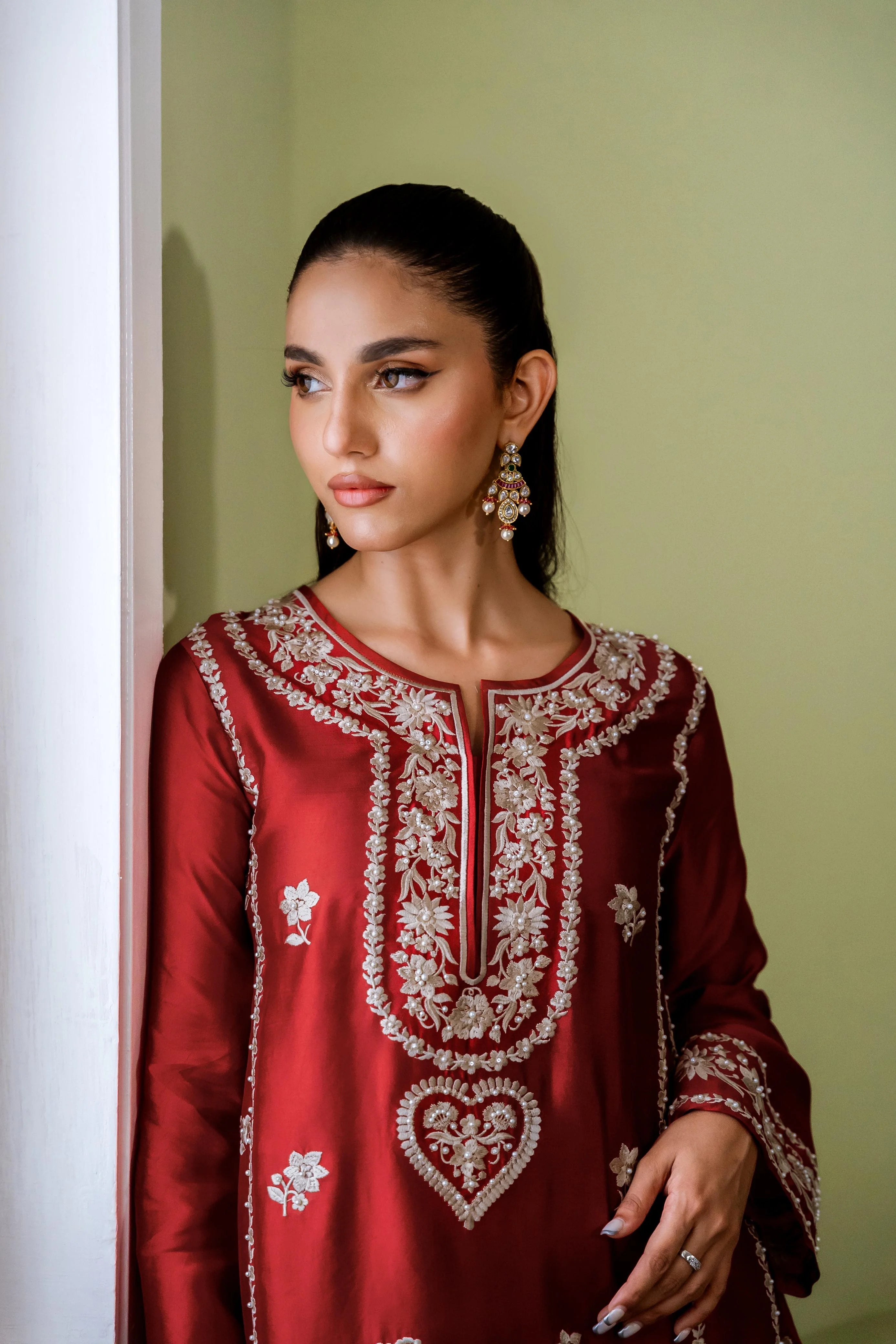 Elegance meets tradition with 'Garance', a stunning outfit crafted from lustrous sheesha silk. The top showcases exquisite traditional Gara embroidery, beautifully accented with pearls, while the matching silk ejaar creates a majestic silhouette, perfect for special occasions that demand understated sophistication.