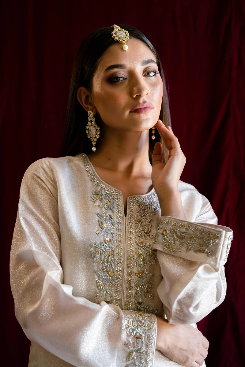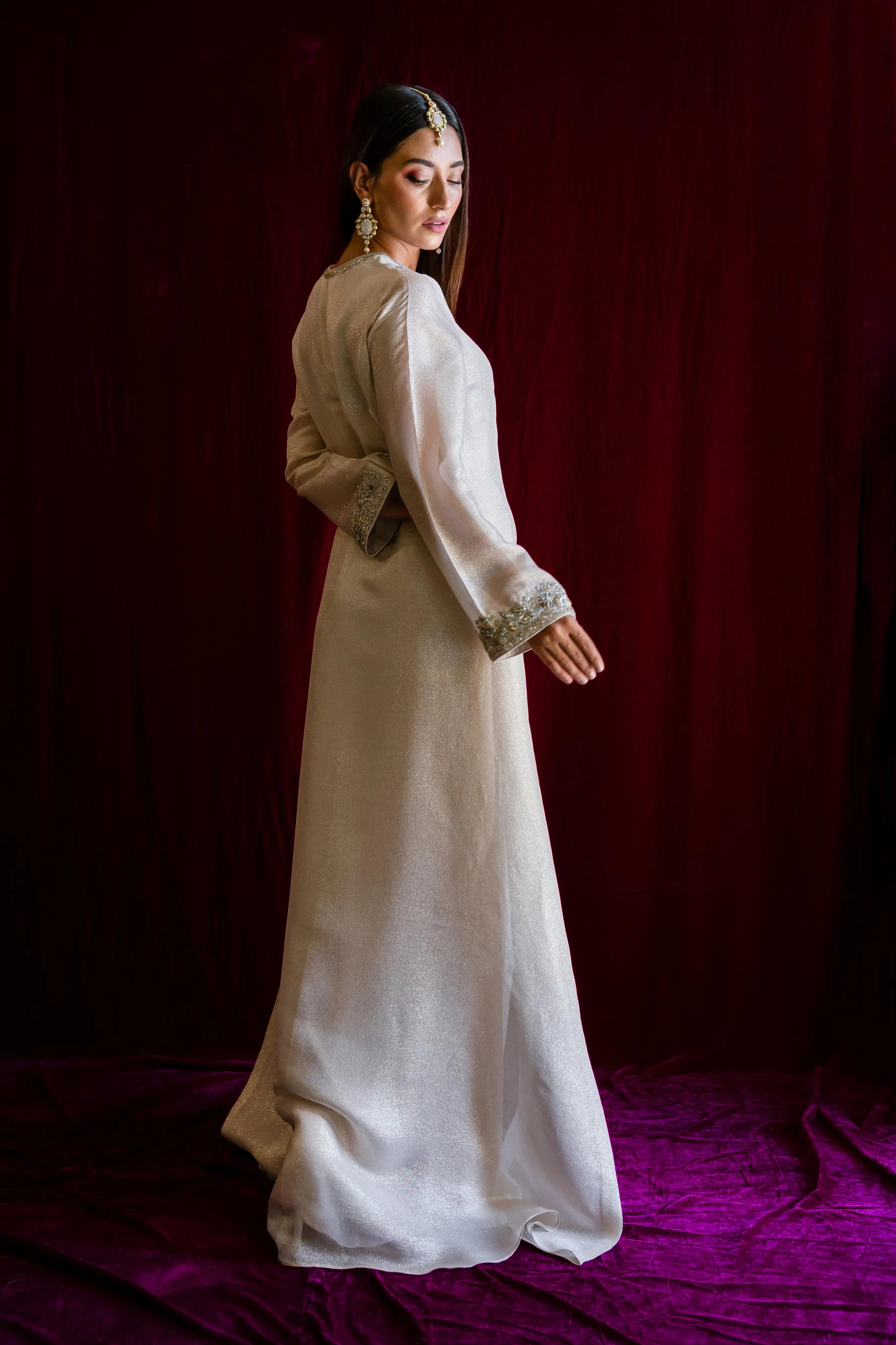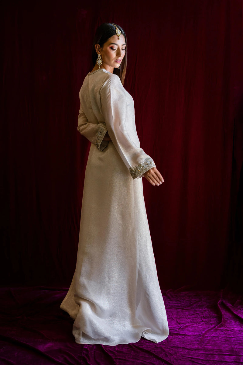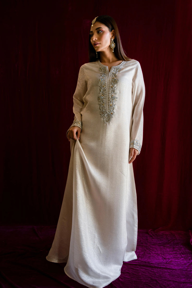 The Interstellar Kaftan exudes timeless bohemian elegance in perfect gold hues to set your heart aflutter! The relaxed, much loved silhouette has a universally flattering neckline, adorned with delicate floral border featuring silver & gold elements using dabka, nakshi, sequins, kasab & jewels accents. Cut from flowy matt finish shimmer chiffon, it is designed for a forgiving loose fit, making it a universally flattering evening choice.