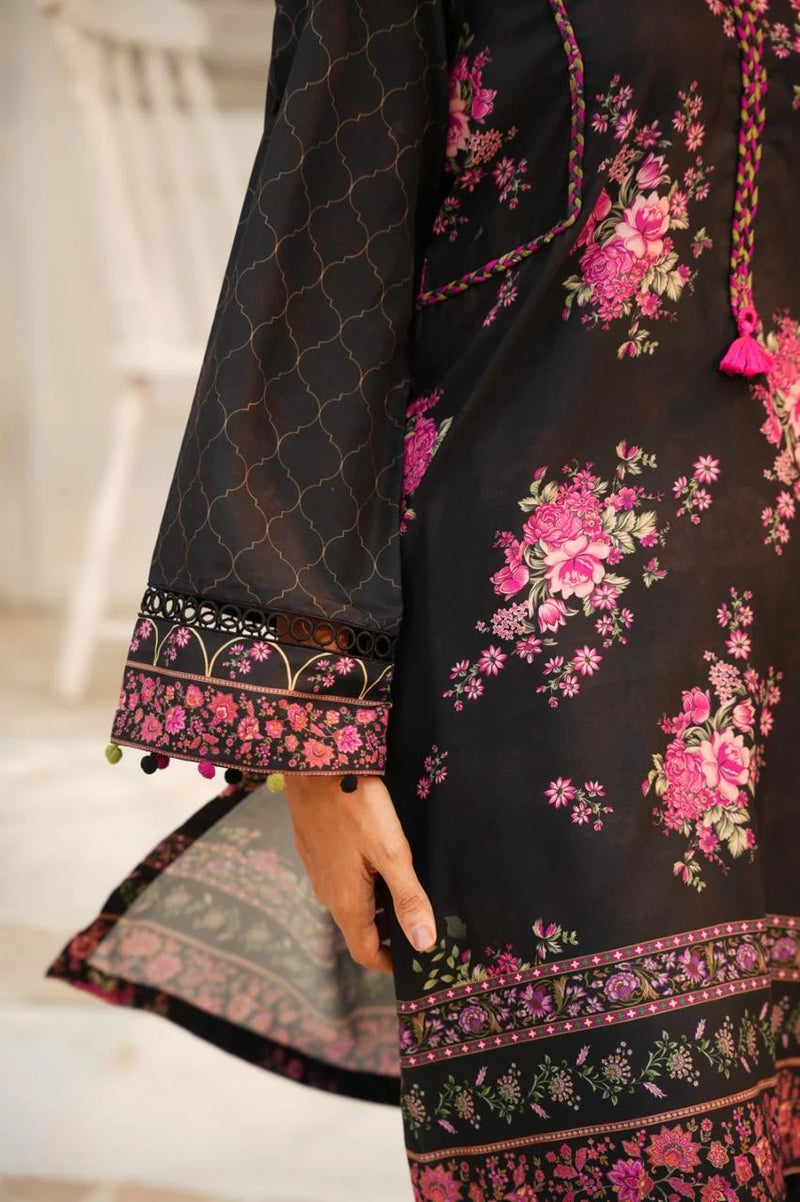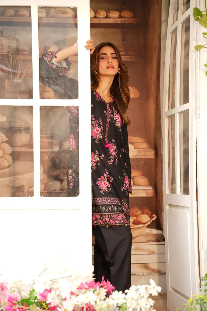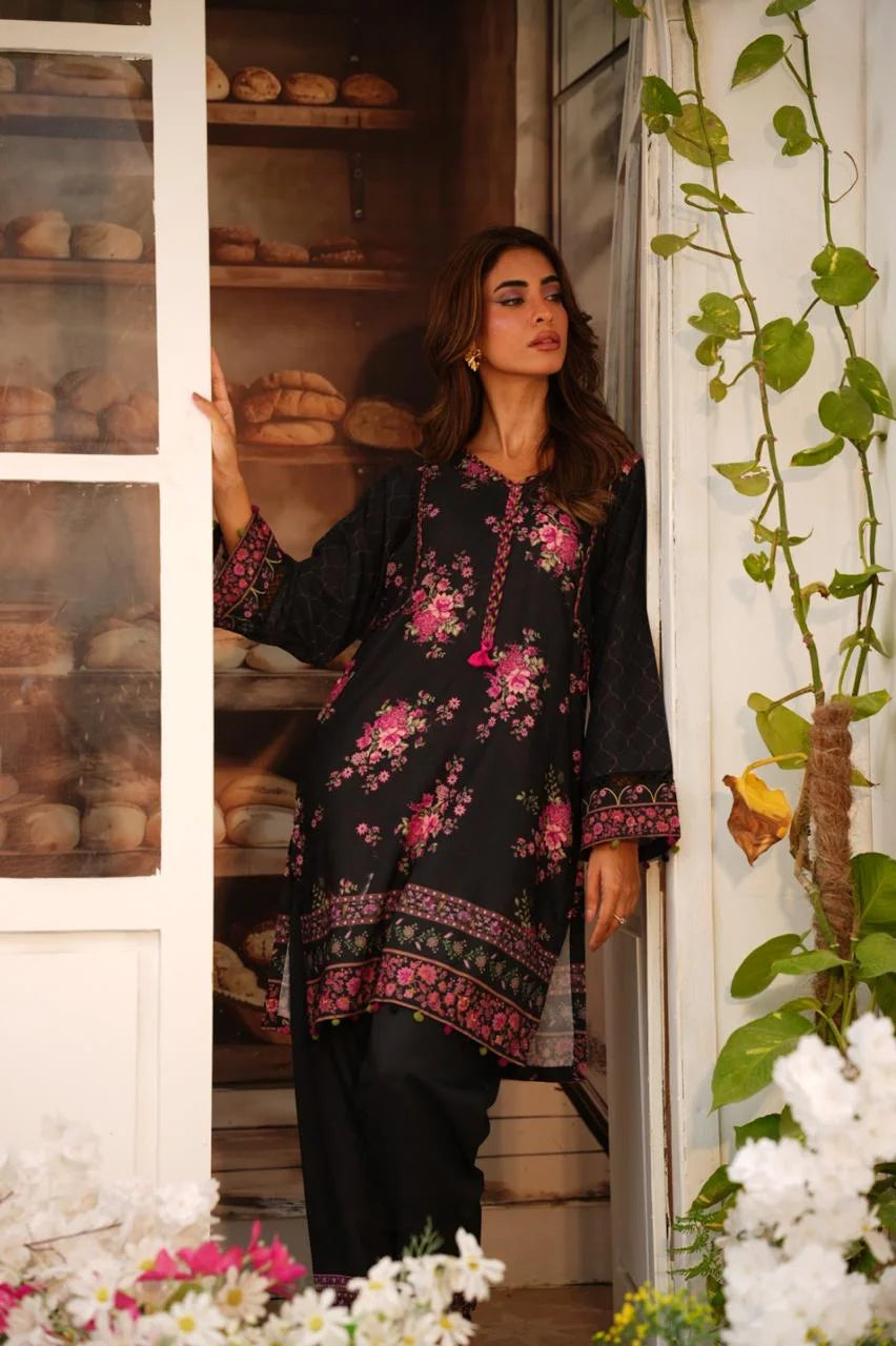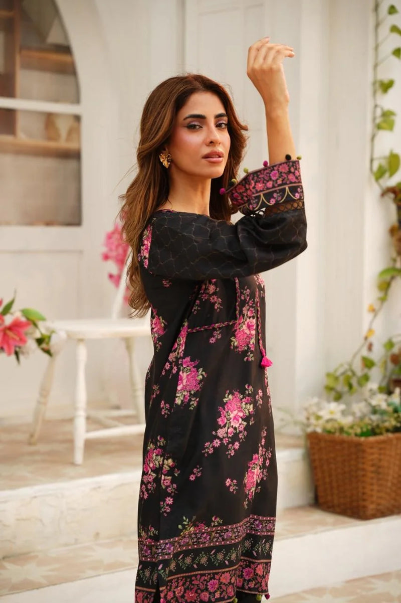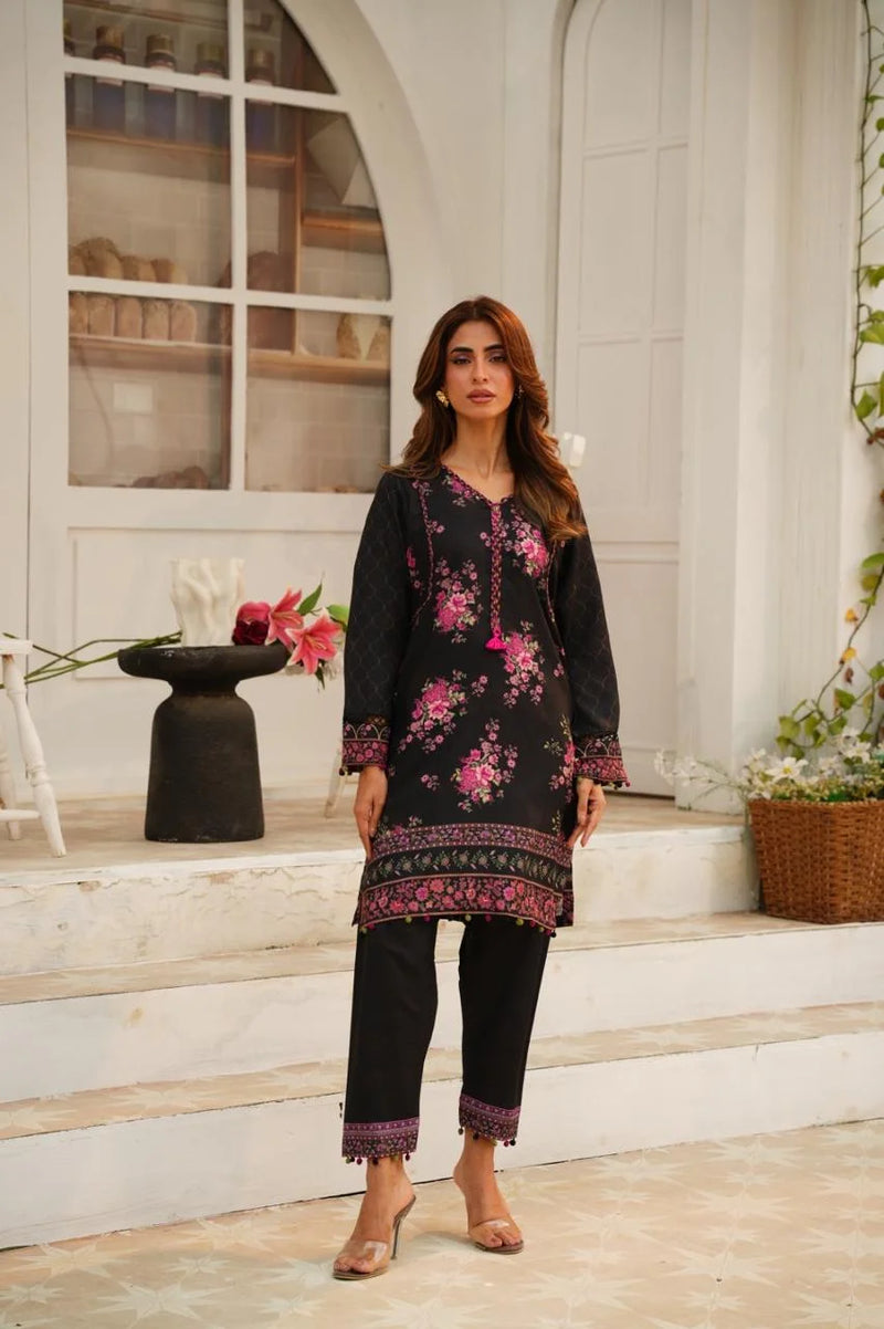 A striking black poly lawn outfit featuring a soft self-print background and pink floral design. The neckline is detailed with elegant tassels and fine embroidery, while the sleeves are finished with delicate lace. Paired with a matching straight-fit shalwar, this set blends bold style with graceful charm—perfect for everyday or festive wear.