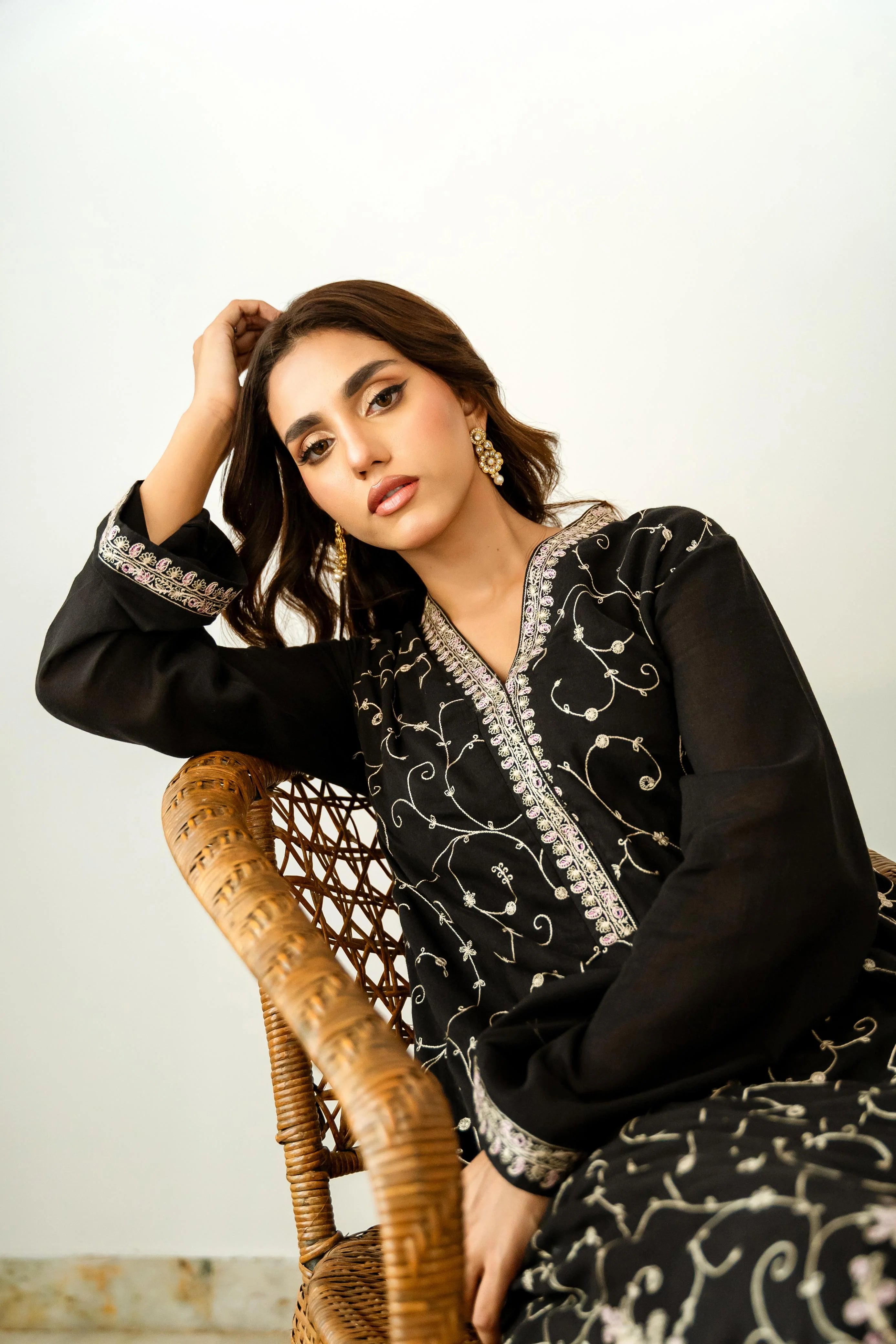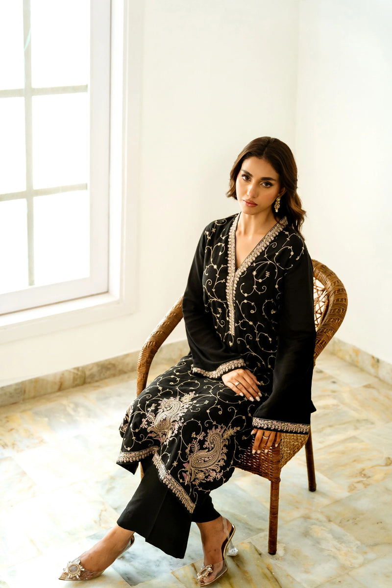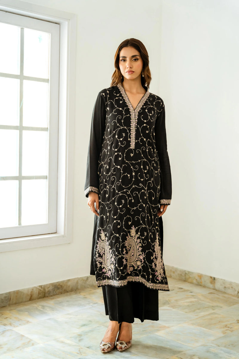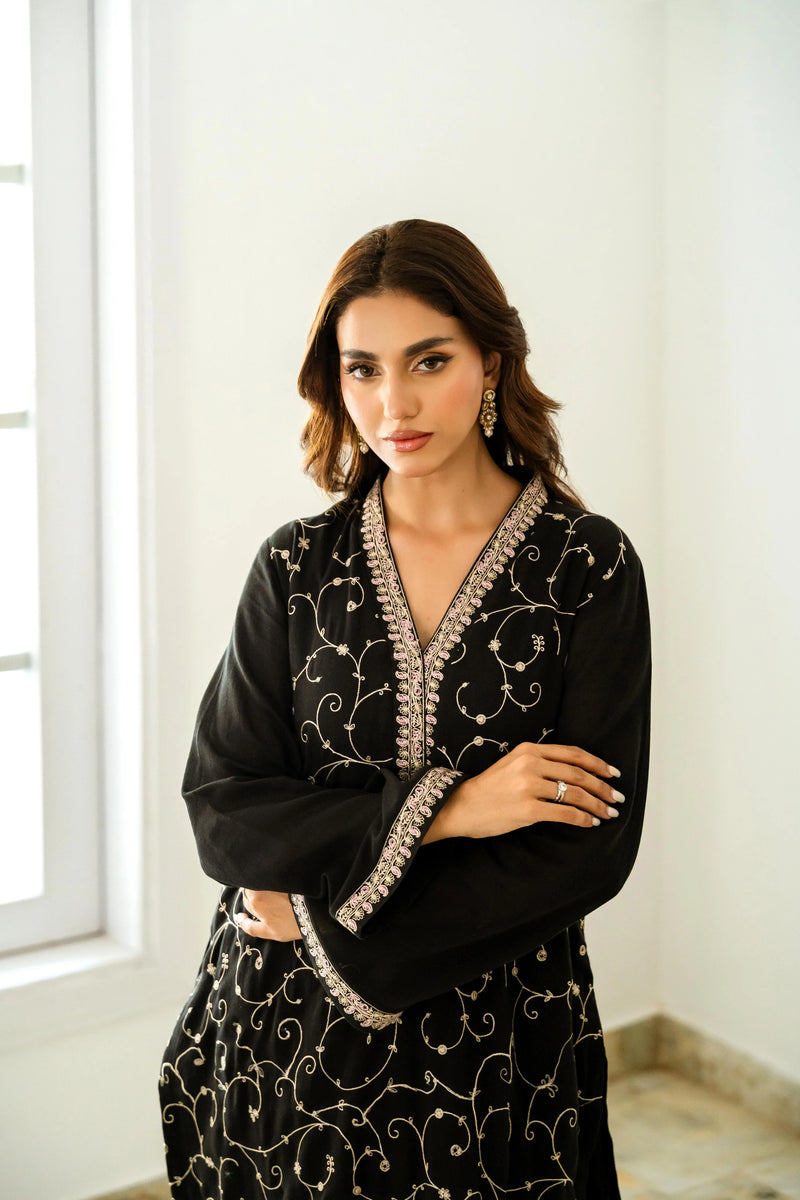 This black cotton crêpe long kameez features exquisite Kashmiri-style embroidery in a delicate jaal pattern, highlighted by intricate paisley motifs along the daman. The embroidered border, in soft shades of ivory, pastel pink, and mint green, adorns the hemline, sleeve cuffs, and neck pati, adding refined elegance. Paired with a matching black ejaar, the ensemble blends traditional craftsmanship with modern grace.