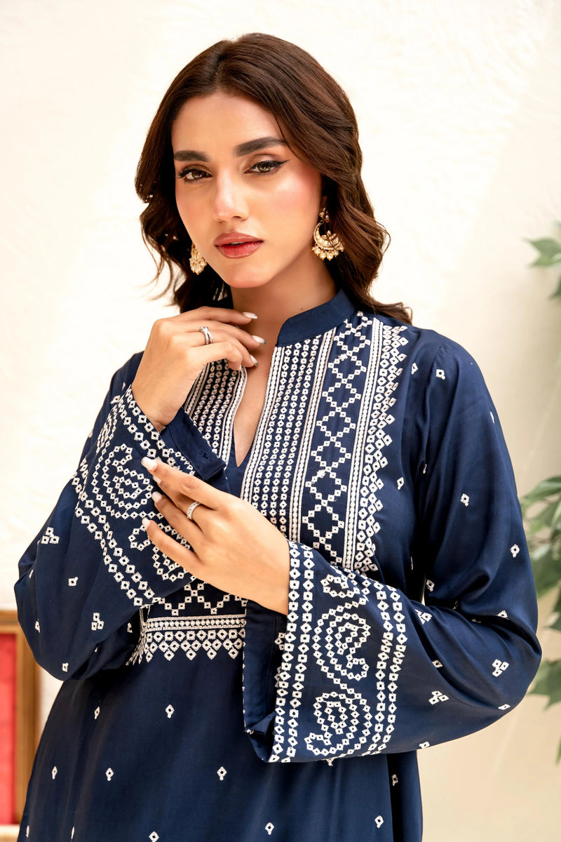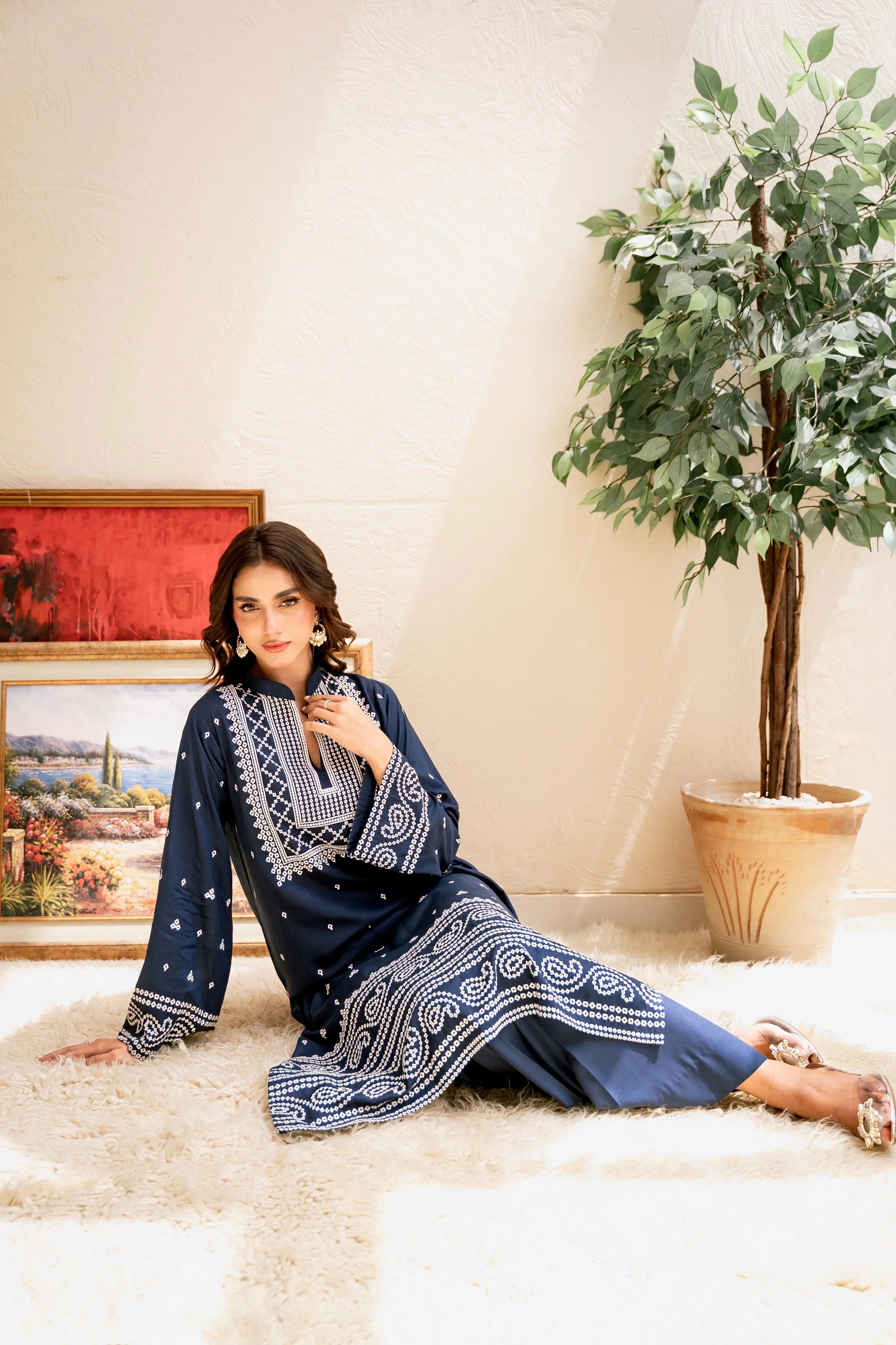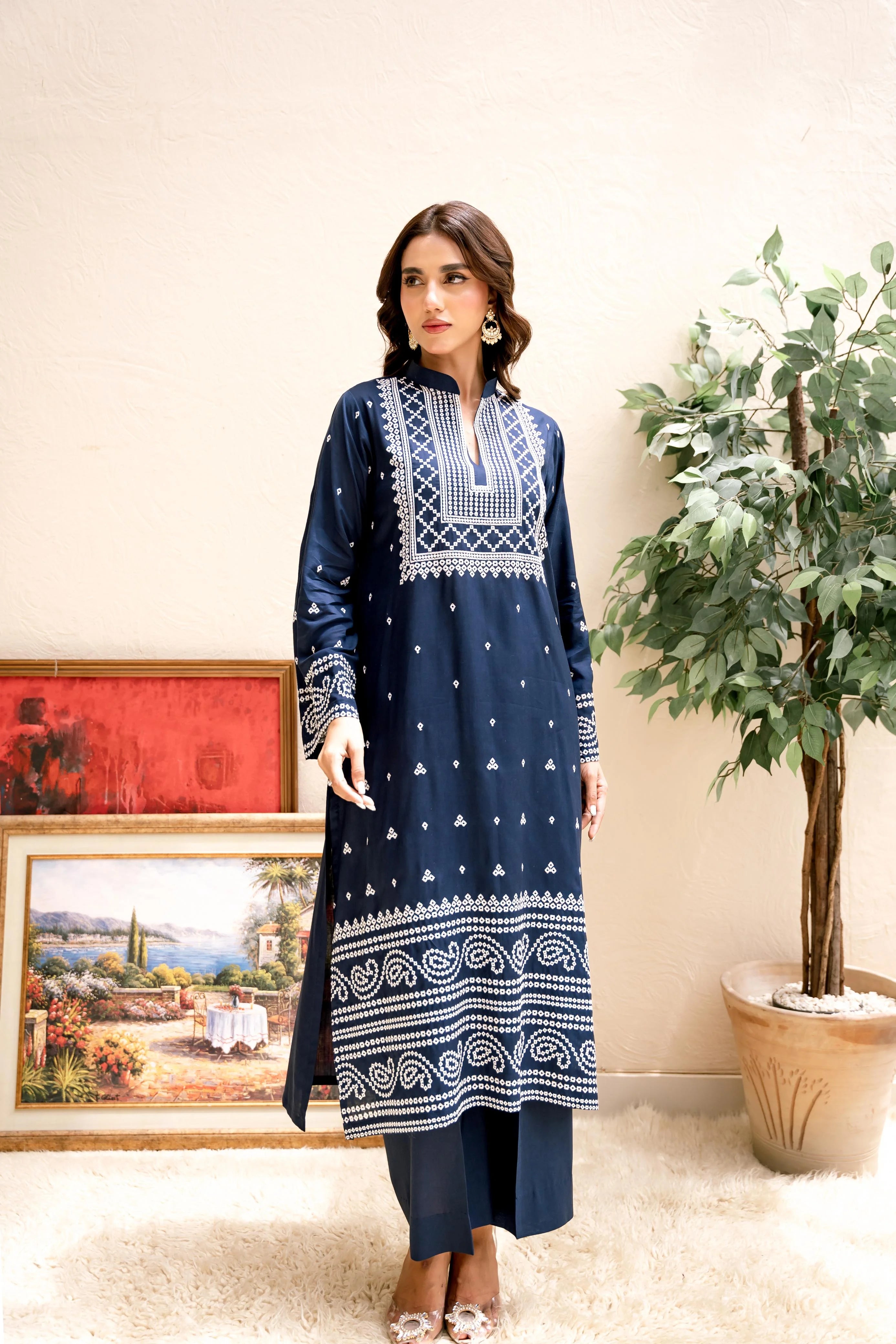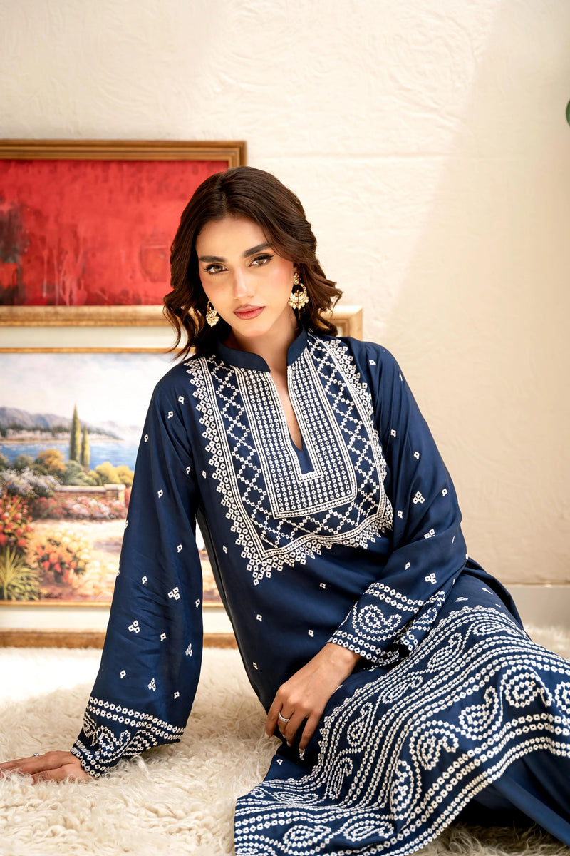 This elegant lawn outfit features intricate Bandhani-style embroidery in ivory thread, adorned with delicate borders on the neckline, sleeves, and daman, with scattered motifs creating a beautiful design. Available in various colour variations, it's ideal for lunches, dinners, or parties. This stylish long kameez is paired with a loose-fit ezaar, keeping you cool and comfortable in the summer with its lightweight and breathable lawn fabric.