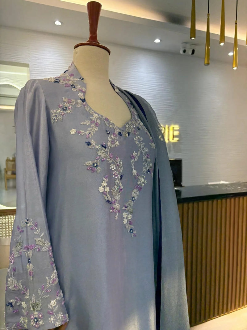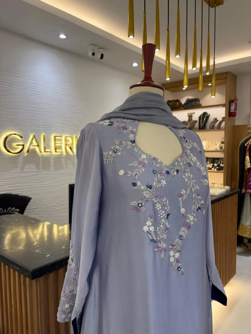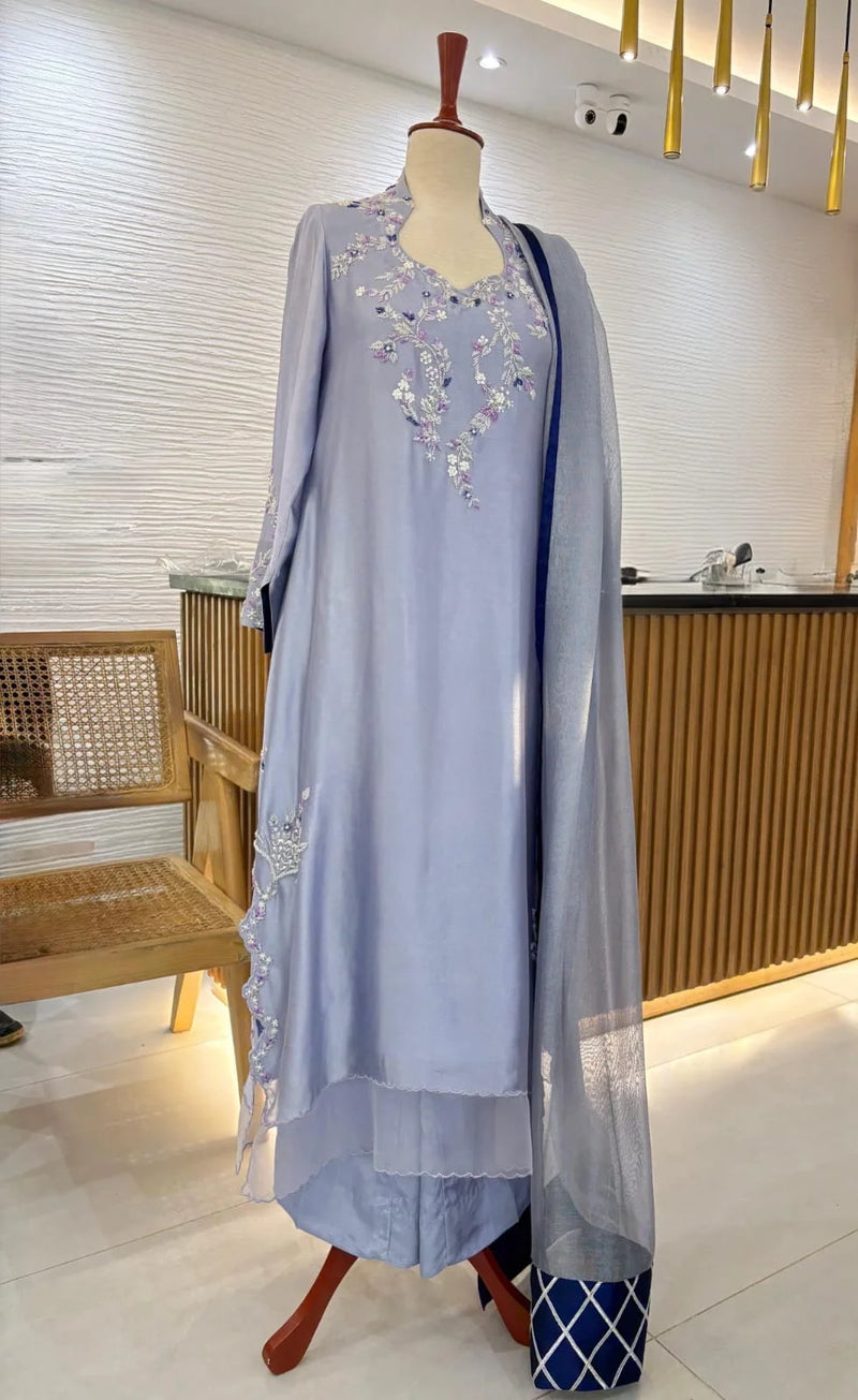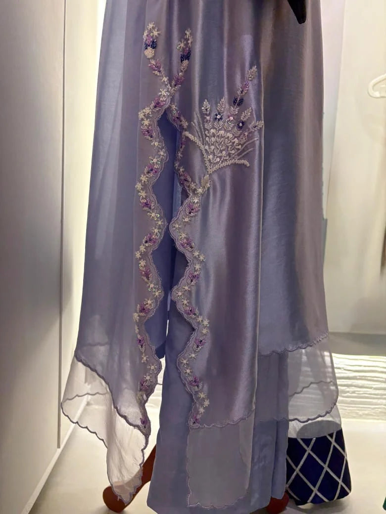Lavender Muse is a dreamy lavender-colored silk dress, adorned with exquisite hand-embellished embroidery featuring delicate kandana and moti work. Its soft, luxurious shine and intricate detailing make it a timeless choice for any festive or wedding event.