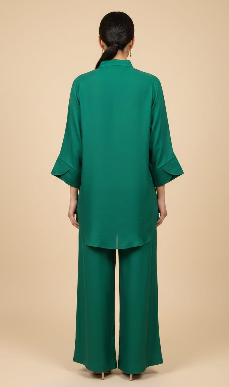 - This elegant suit is crafted from luxurious Sheesha Silk, featuring delicate embellishments that add a subtle shimmer and refined charm. The graceful shirt is paired with a matching flowy Pallazzo trouser, creating a balanced and sophisticated silhouette. Ideal for festive occasions, formal events, and evening wear.