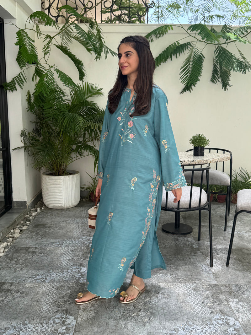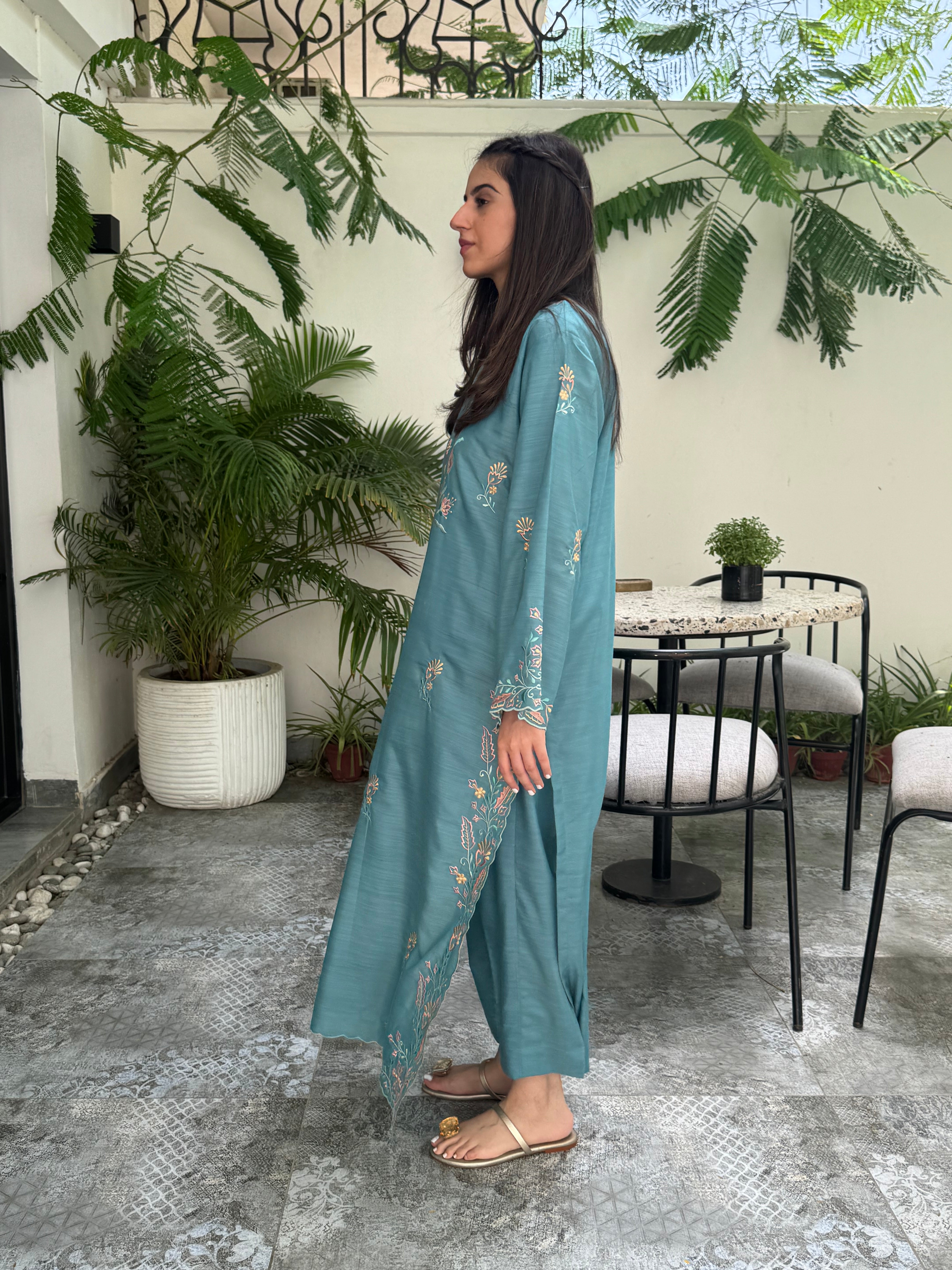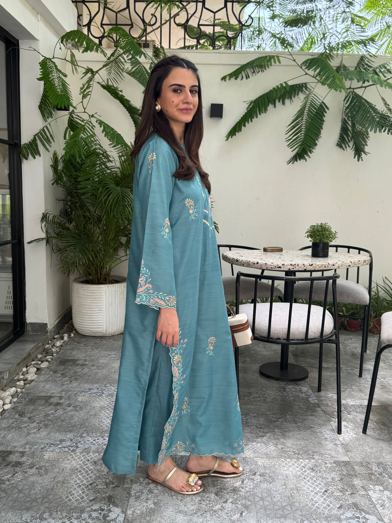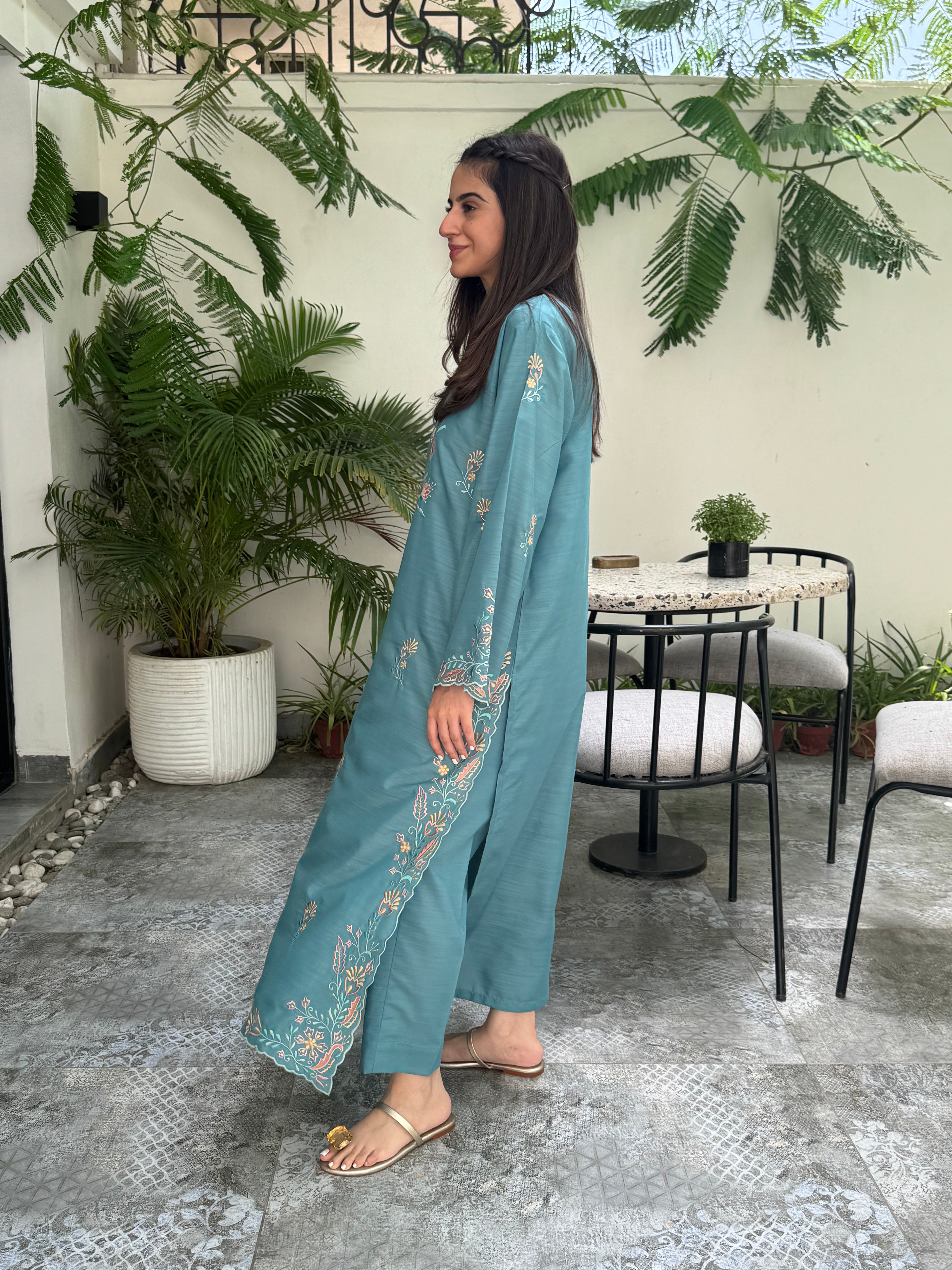 A timeless blue 2-piece with a loose-fit, fully embroidered long shirt featuring fine cutwork, paired with a classic trouser for all-day elegance.