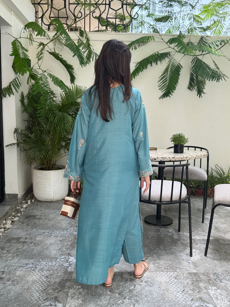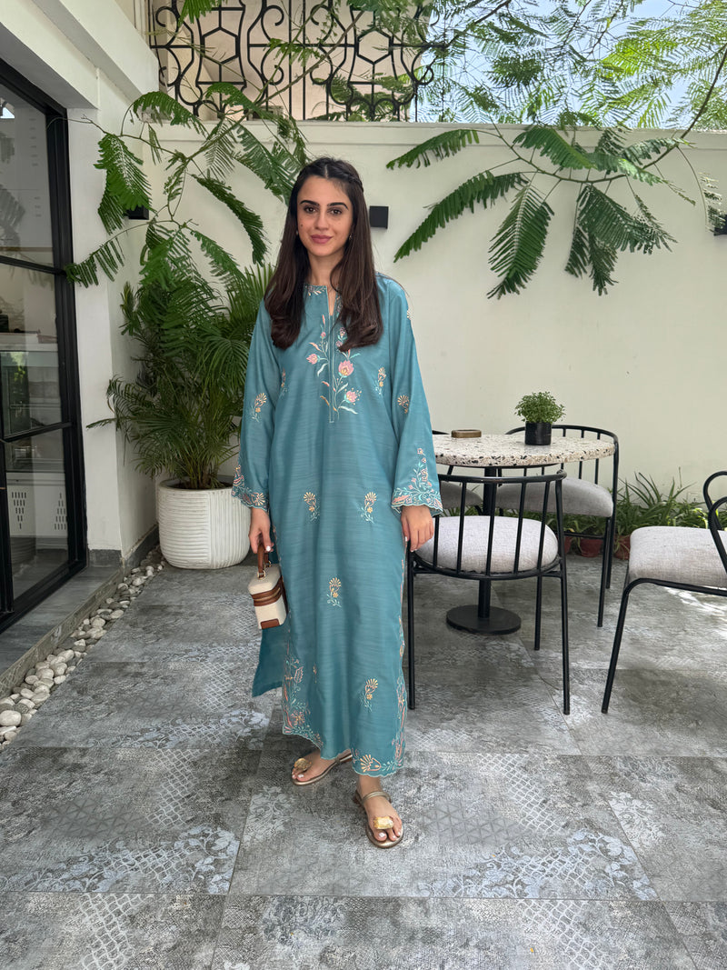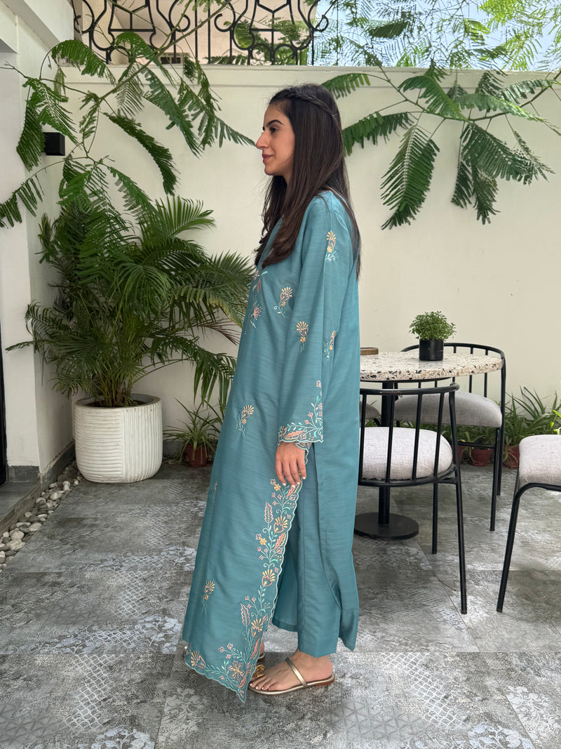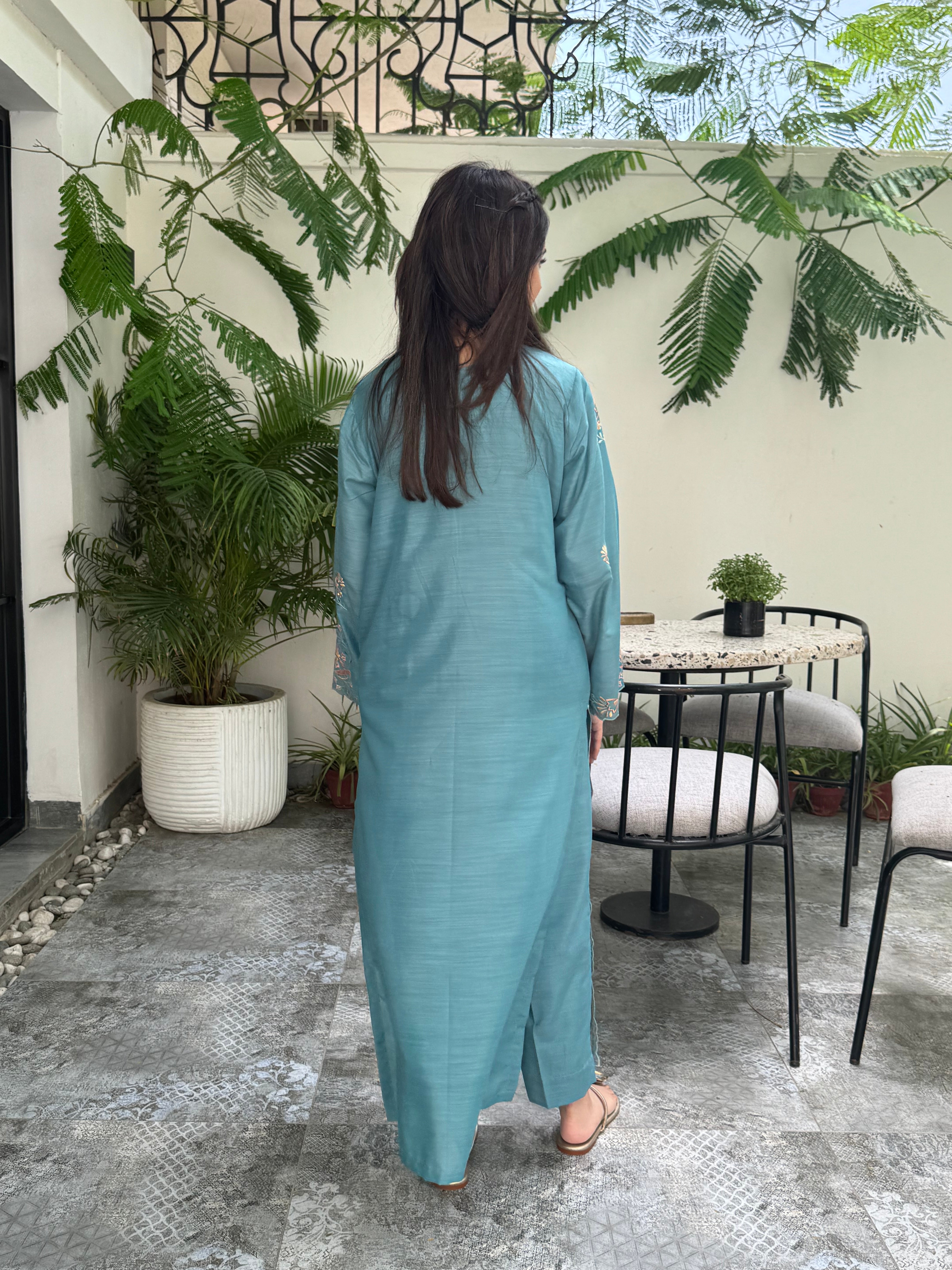 A timeless blue 2-piece with a loose-fit, fully embroidered long shirt featuring fine cutwork, paired with a classic trouser for all-day elegance.