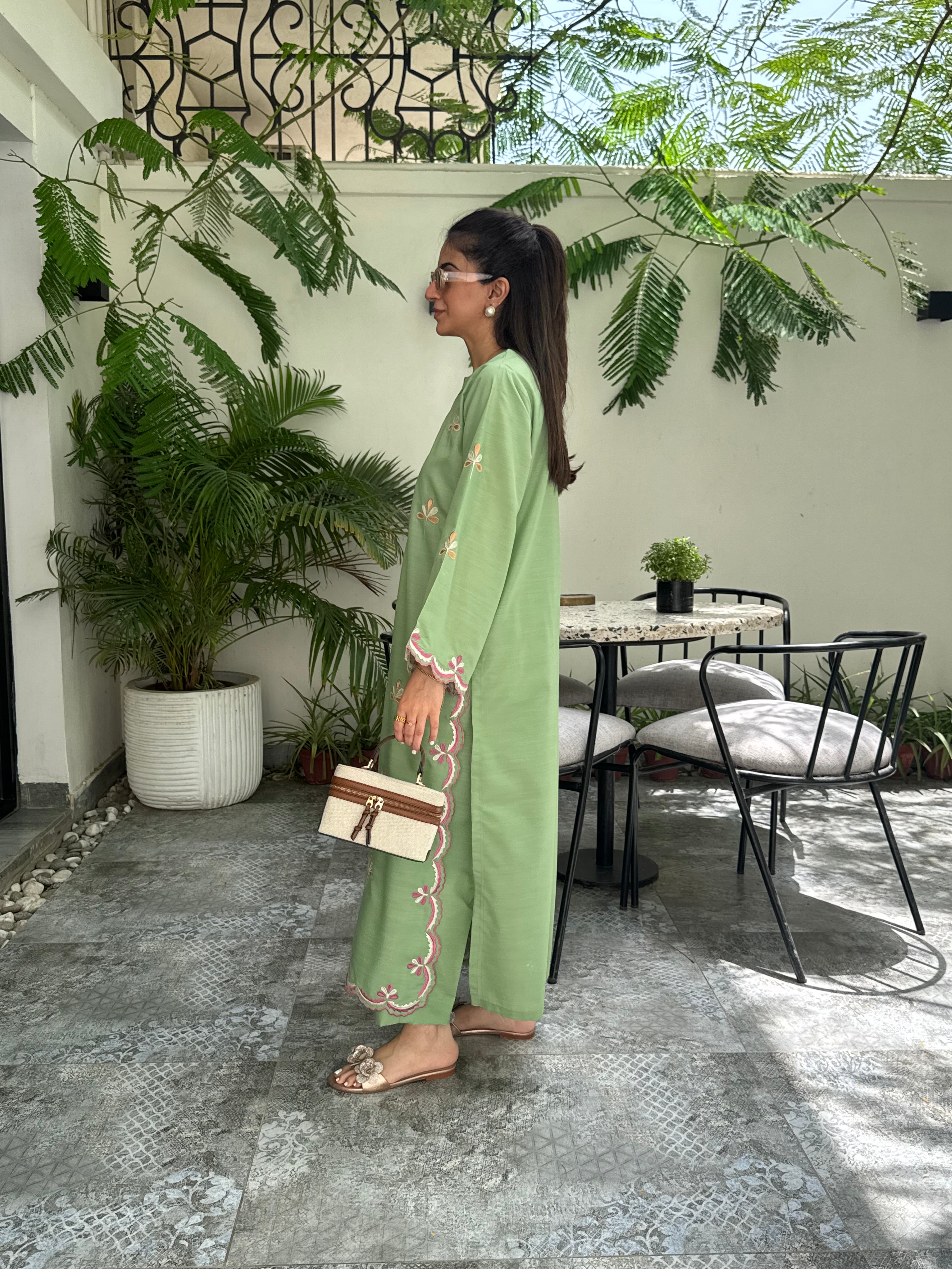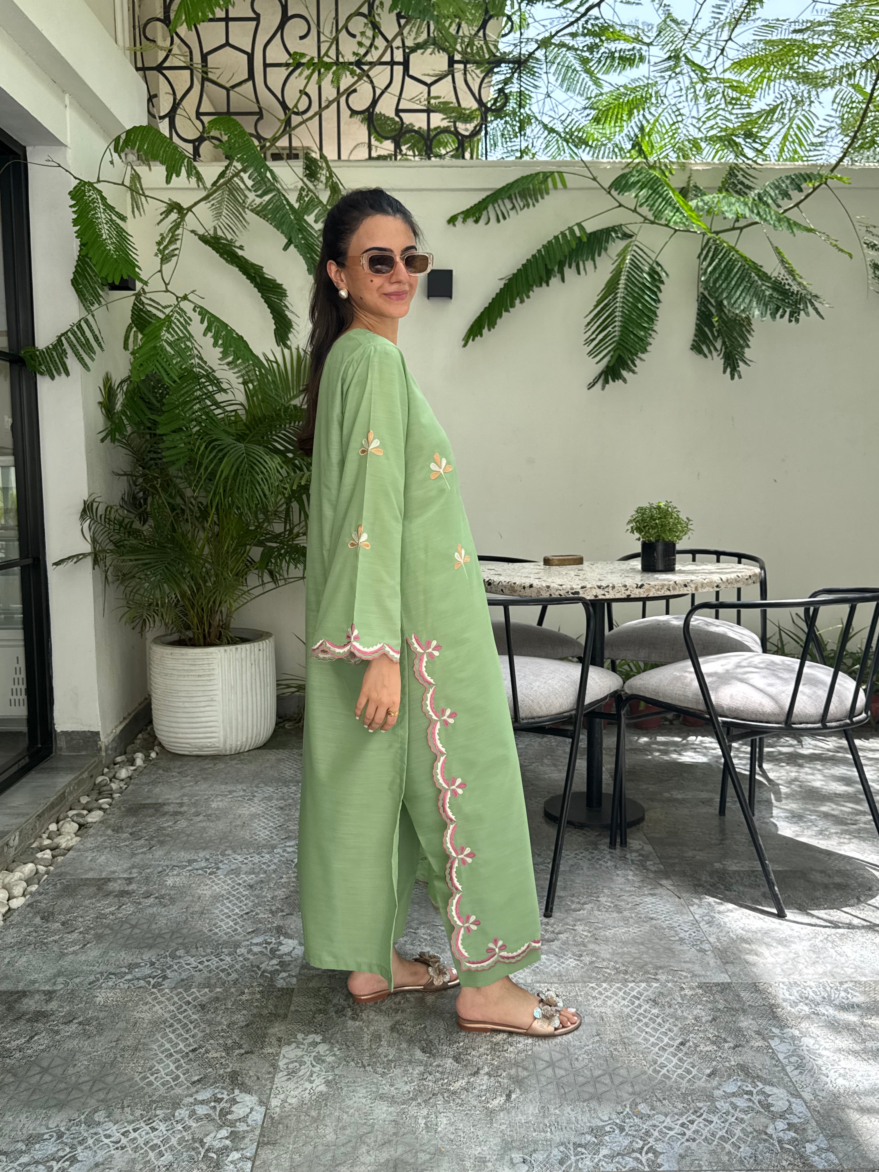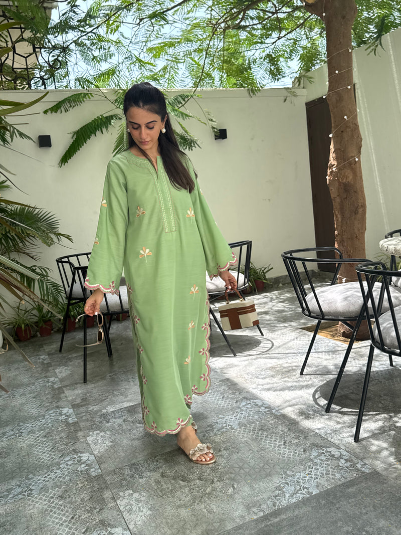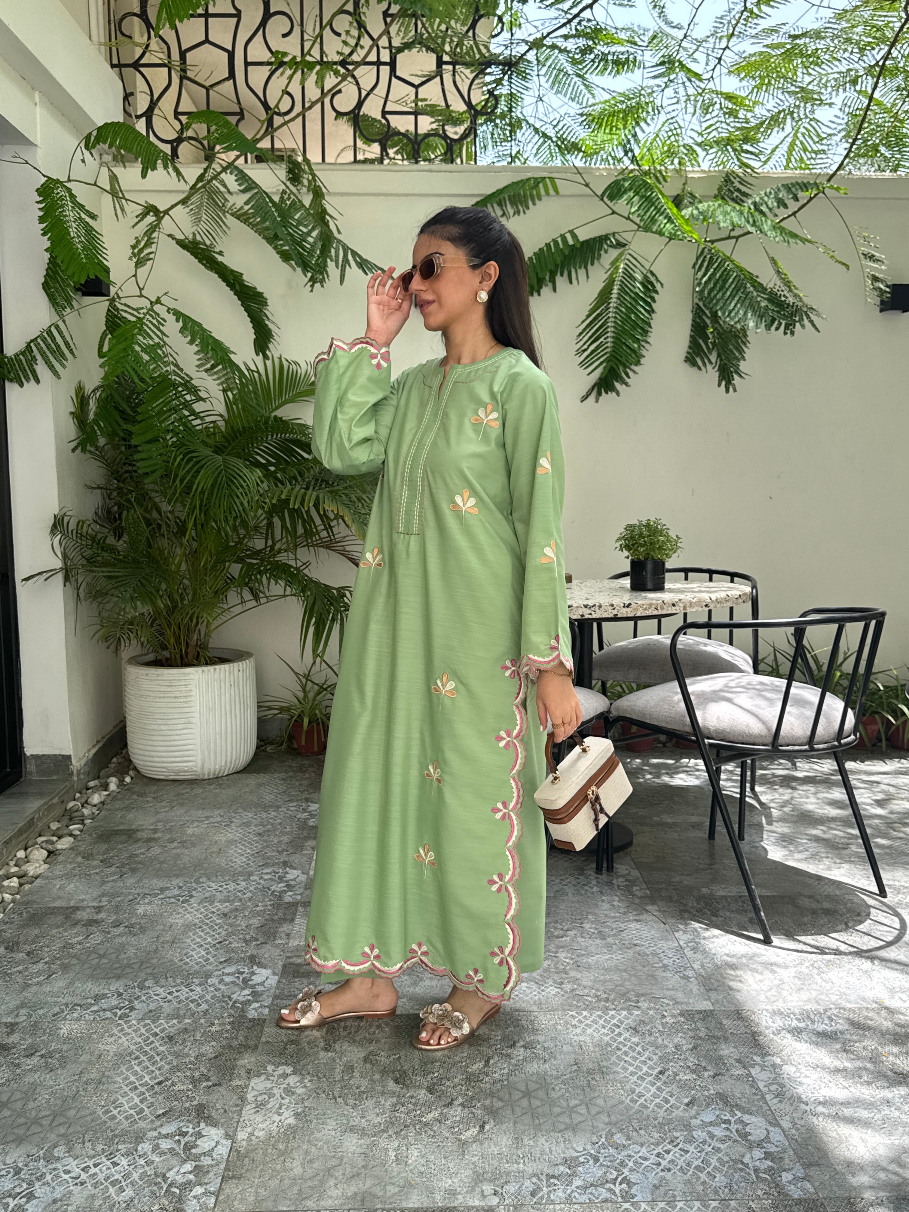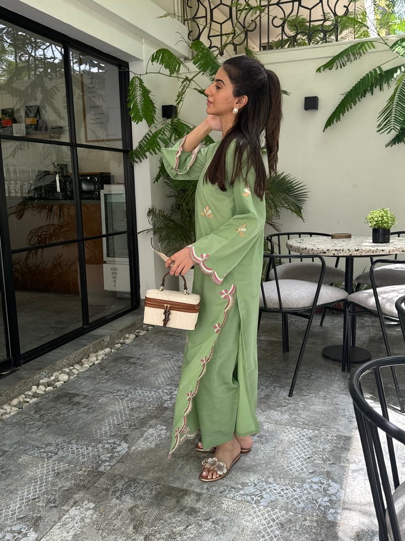 Crafted in a fresh green hue, this loose-fit 2-piece pairs a fully embroidered long shirt with fine cutwork details and a coordinating trouser.
