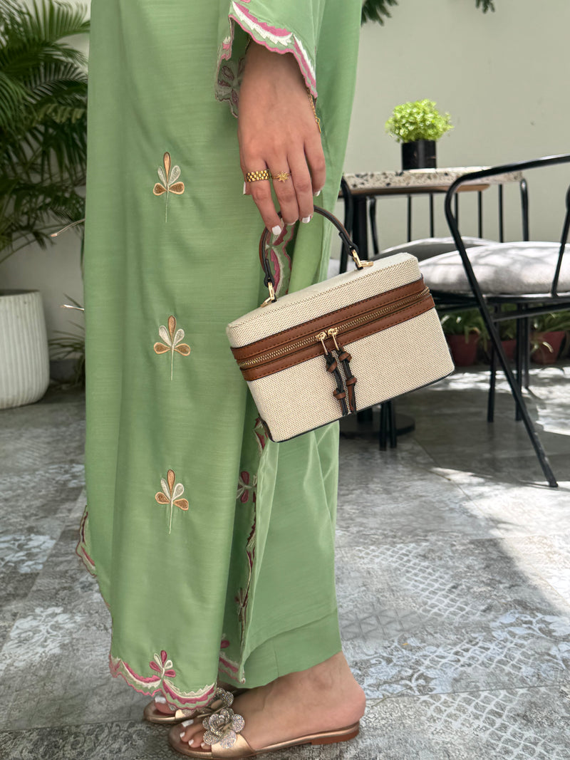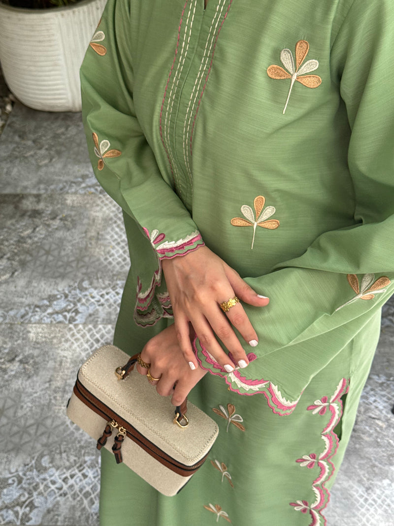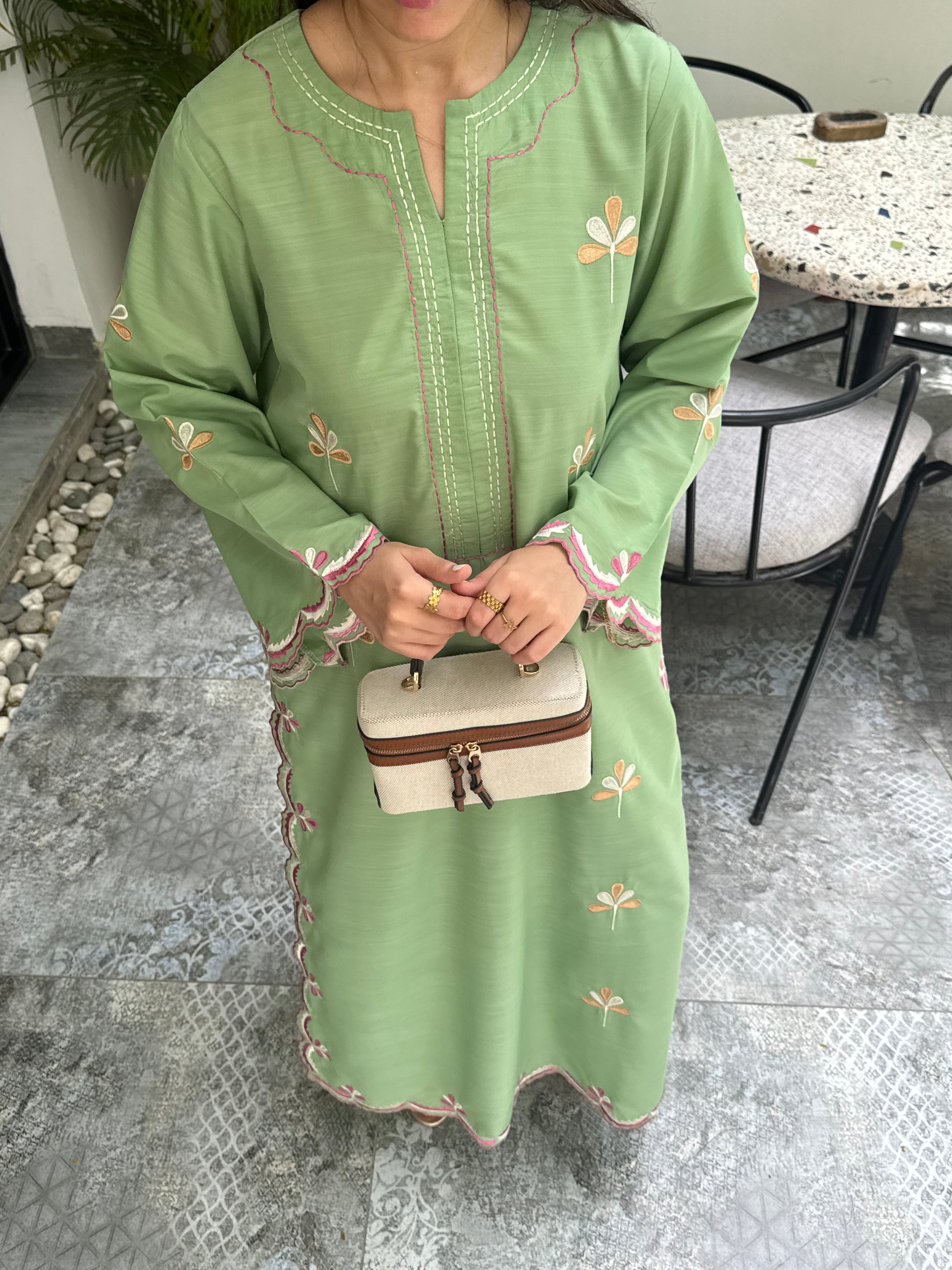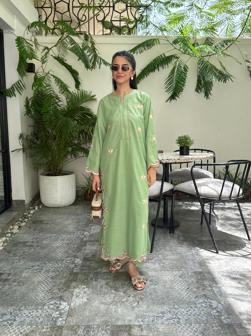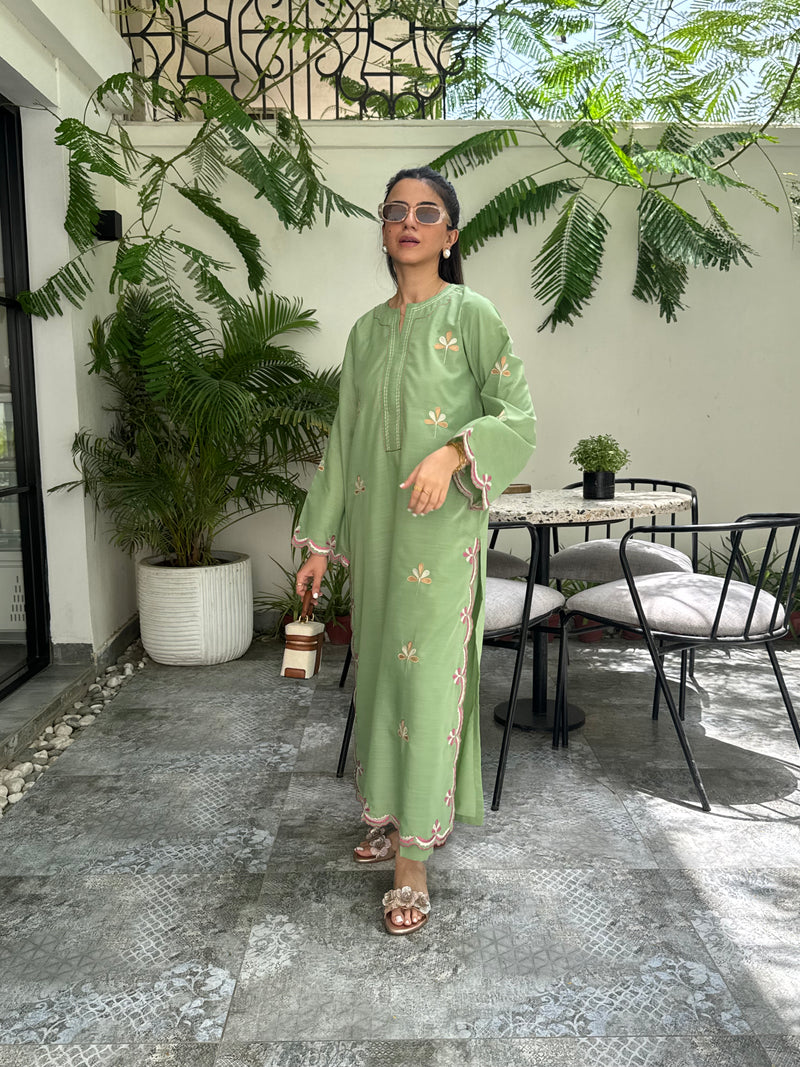 Crafted in a fresh green hue, this loose-fit 2-piece pairs a fully embroidered long shirt with fine cutwork details and a coordinating trouser.