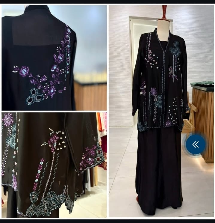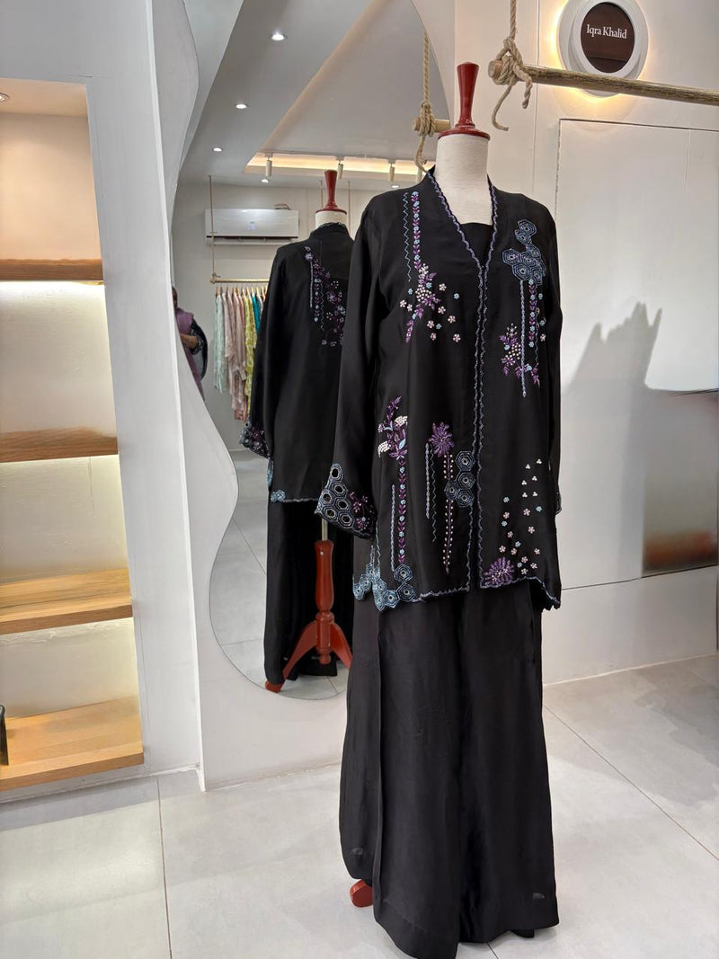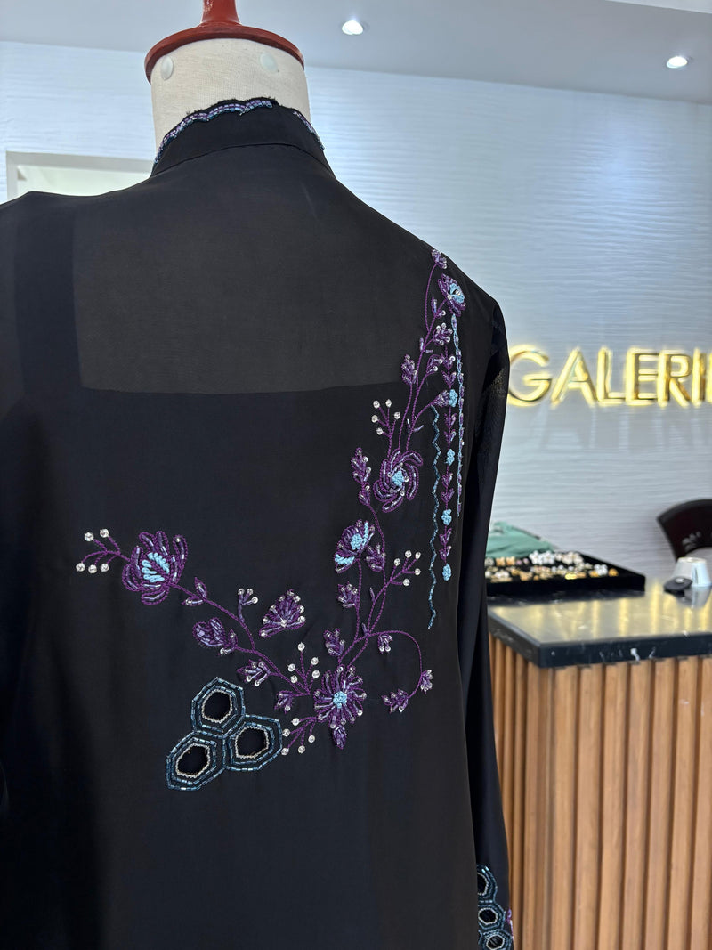 A statement in timeless black, Midnight noir is crafted in luxurious shisha silk and designed in a refined jacket-style silhouette with a modern cut. The dress features delicate hand embellishment, adding subtle shimmer and artisanal elegance without overpowering the look. Its structured yet graceful design creates a flattering fall, making it perfect for those who appreciate contemporary eastern wear with a luxurious edge.