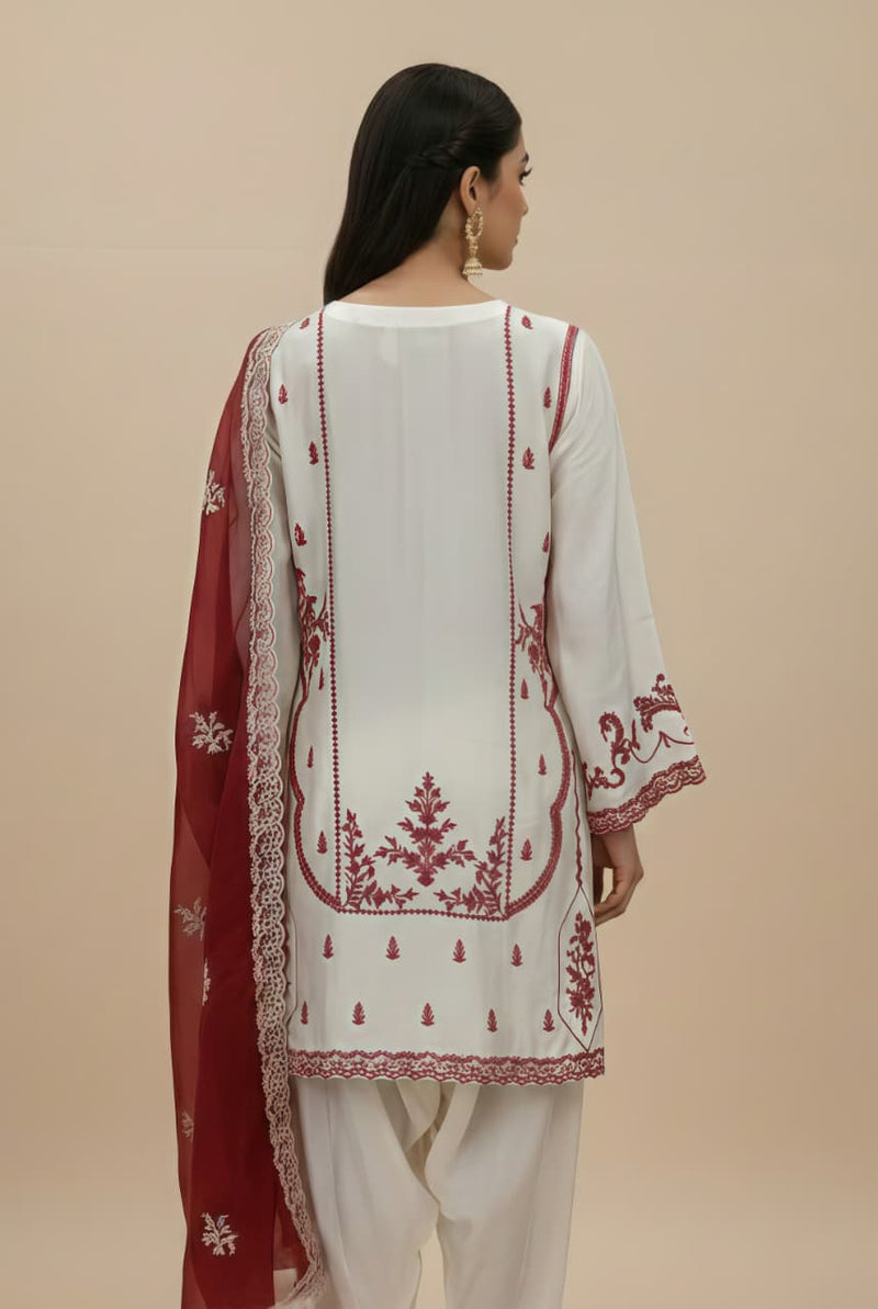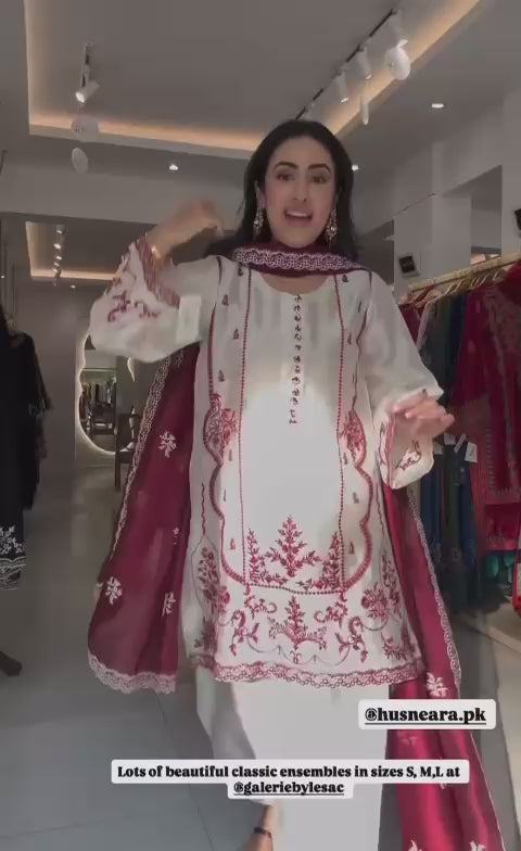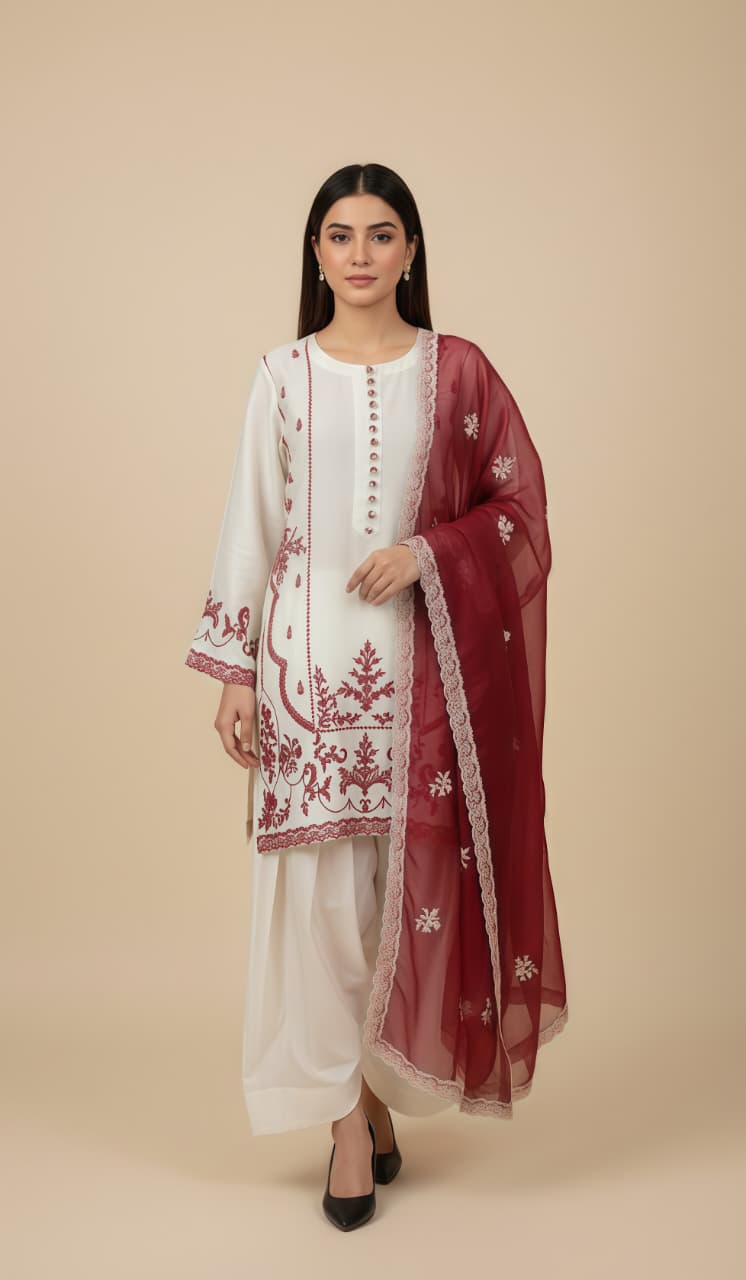 - Elevate your festive wardrobe with this exquisite 3-piece ensemble. Crafted from Sheesha Silk, the ivory tunic features intricate Arri work embroidery in a rich deep-maroon hue, creating a striking contrast that is both timeless and sophisticated.
