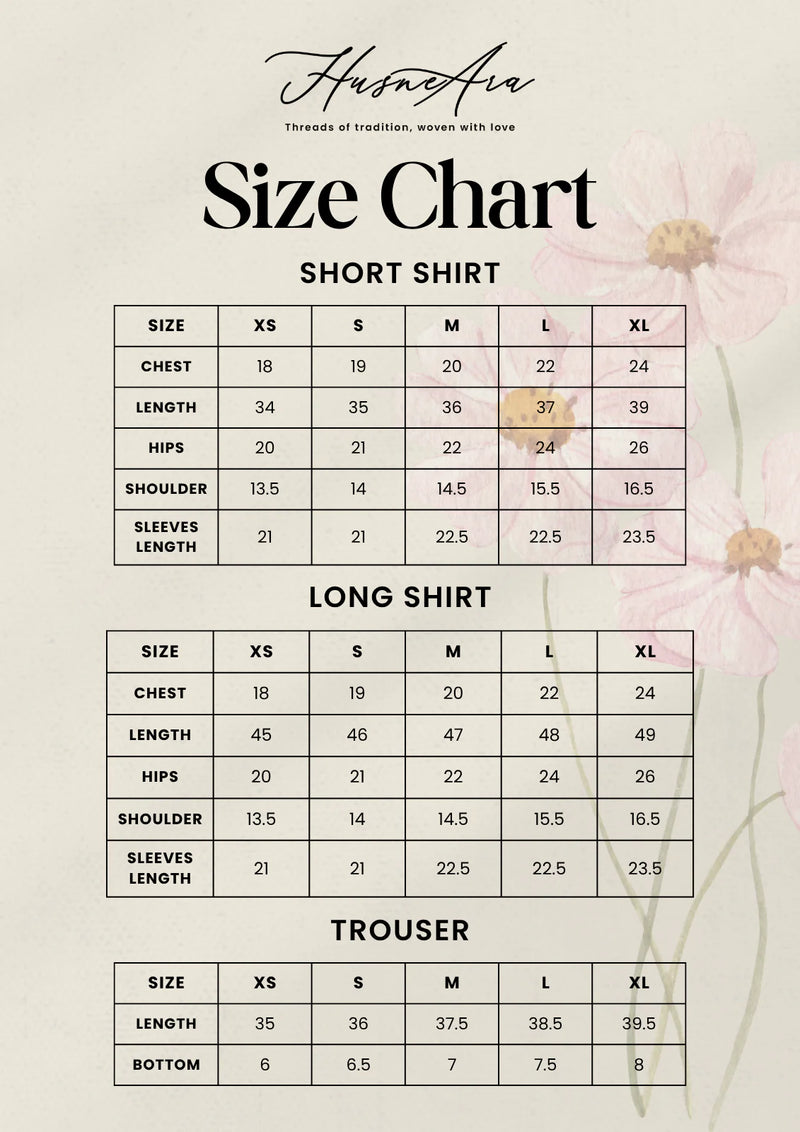 - The outfit is paired with traditional Farshi Shalwar for a voluminous, regal drape. To complete the look, we’ve included a Sheesha Organza Silk dupatta featuring delicate embroidered borders and floral motifs, adding a layer of ethereal grace to the overall silhouette.