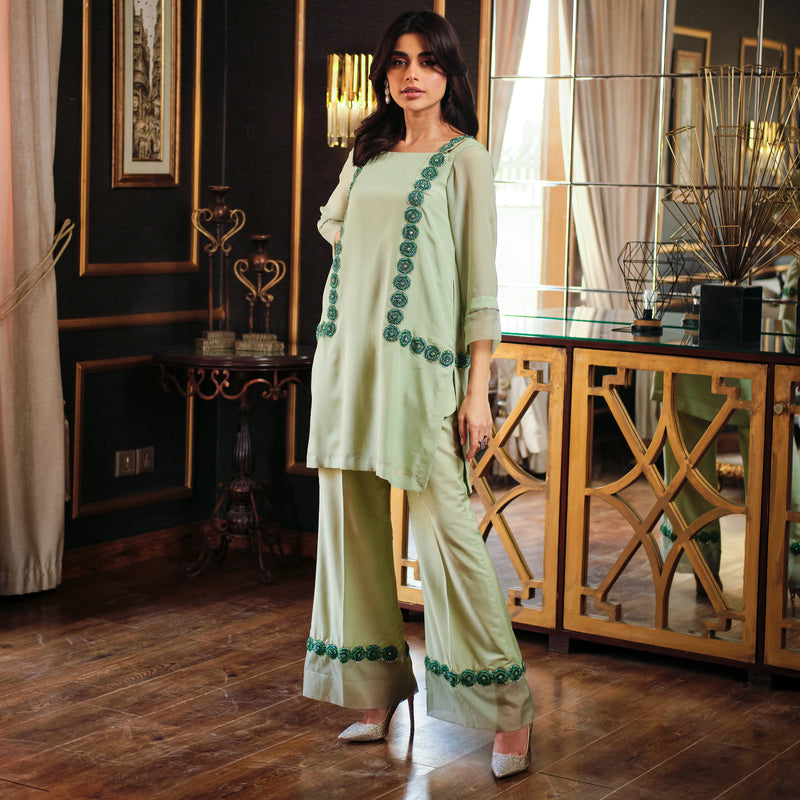 The short top and stylish culottes make a chic combo. The top is so calming in its mint color and has pretty flower designs. And guess what? The culottes match with the same floral pattern! It's breezy, feminine, and totally fashionable. Perfect for a trendy and classy vibe!