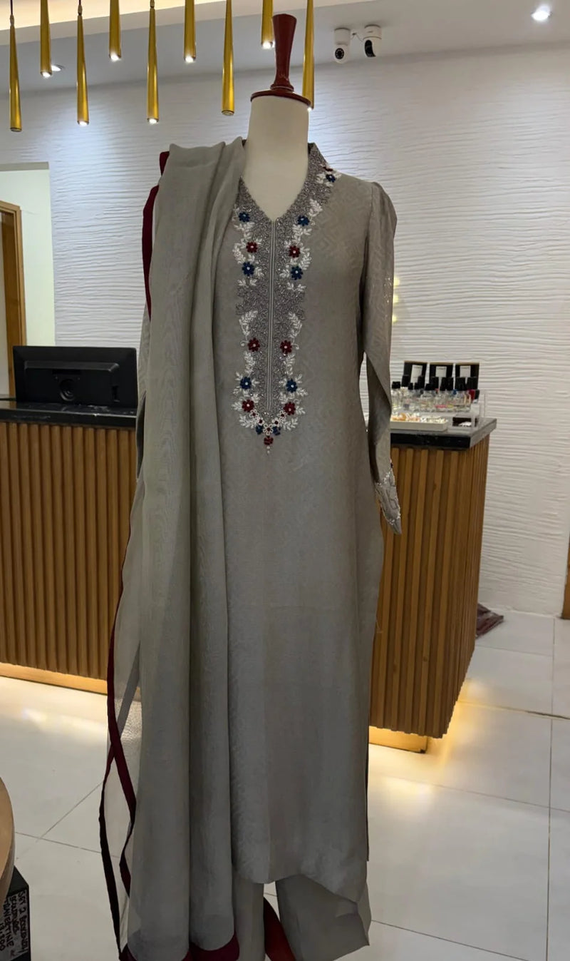 Paired with a Shisha net dupatta finished with soft silk edging, this ensemble creates a perfectly balanced look—luxurious, graceful, and ideal for festive occasions or sophisticated evening events.