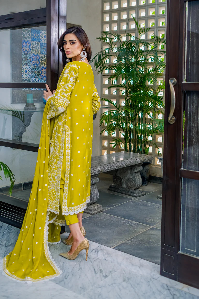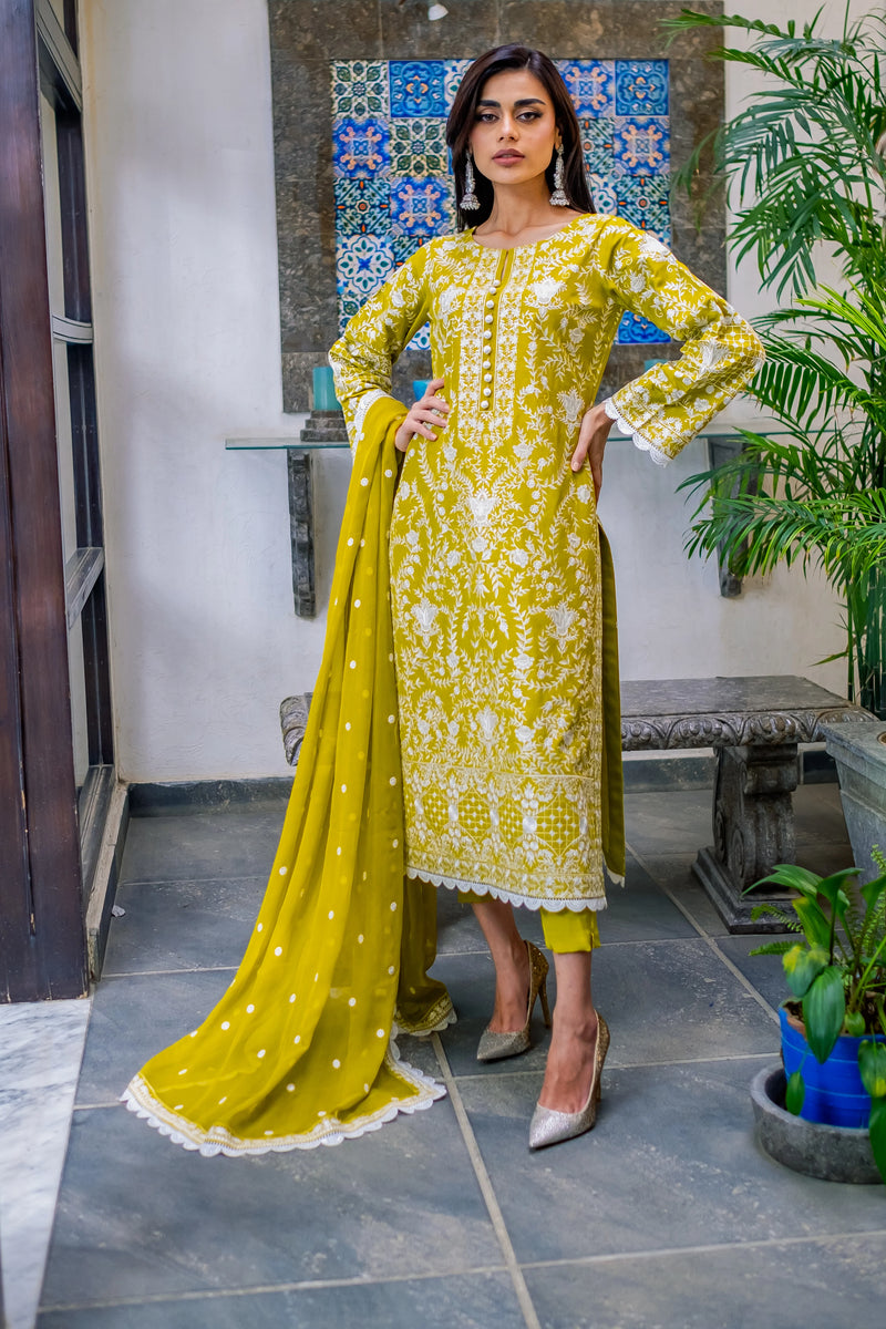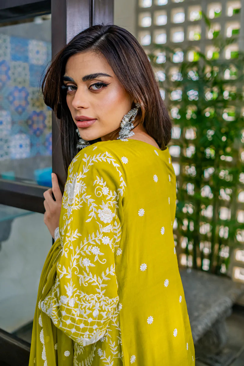 Let the intricate craftsmanship of resham and sequin jaal work on pure raw silk steal the spotlight, with a chiffon dupatta and cotton silk bottom adding a flawless finish.