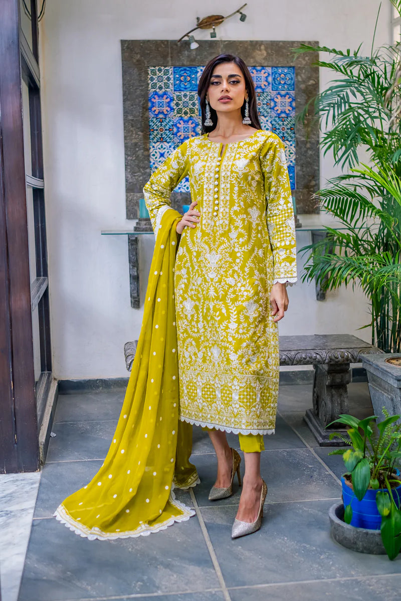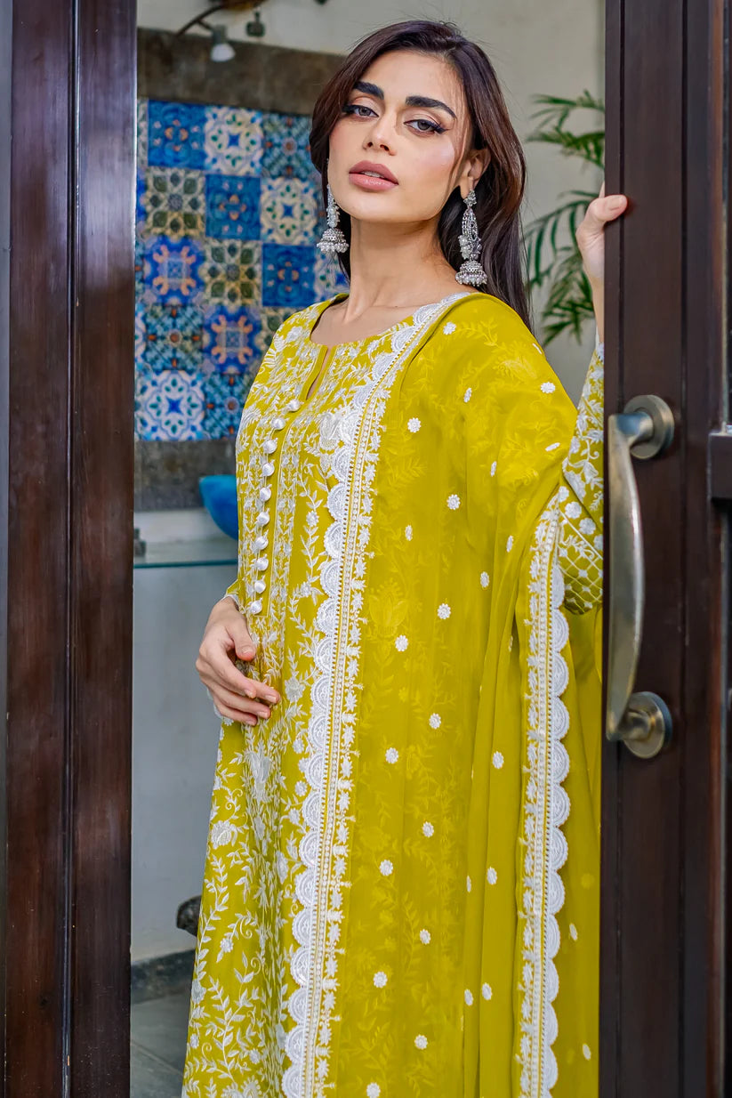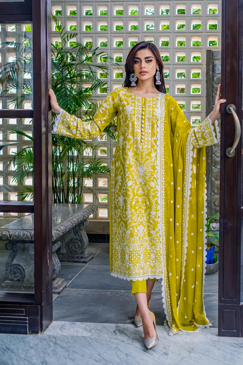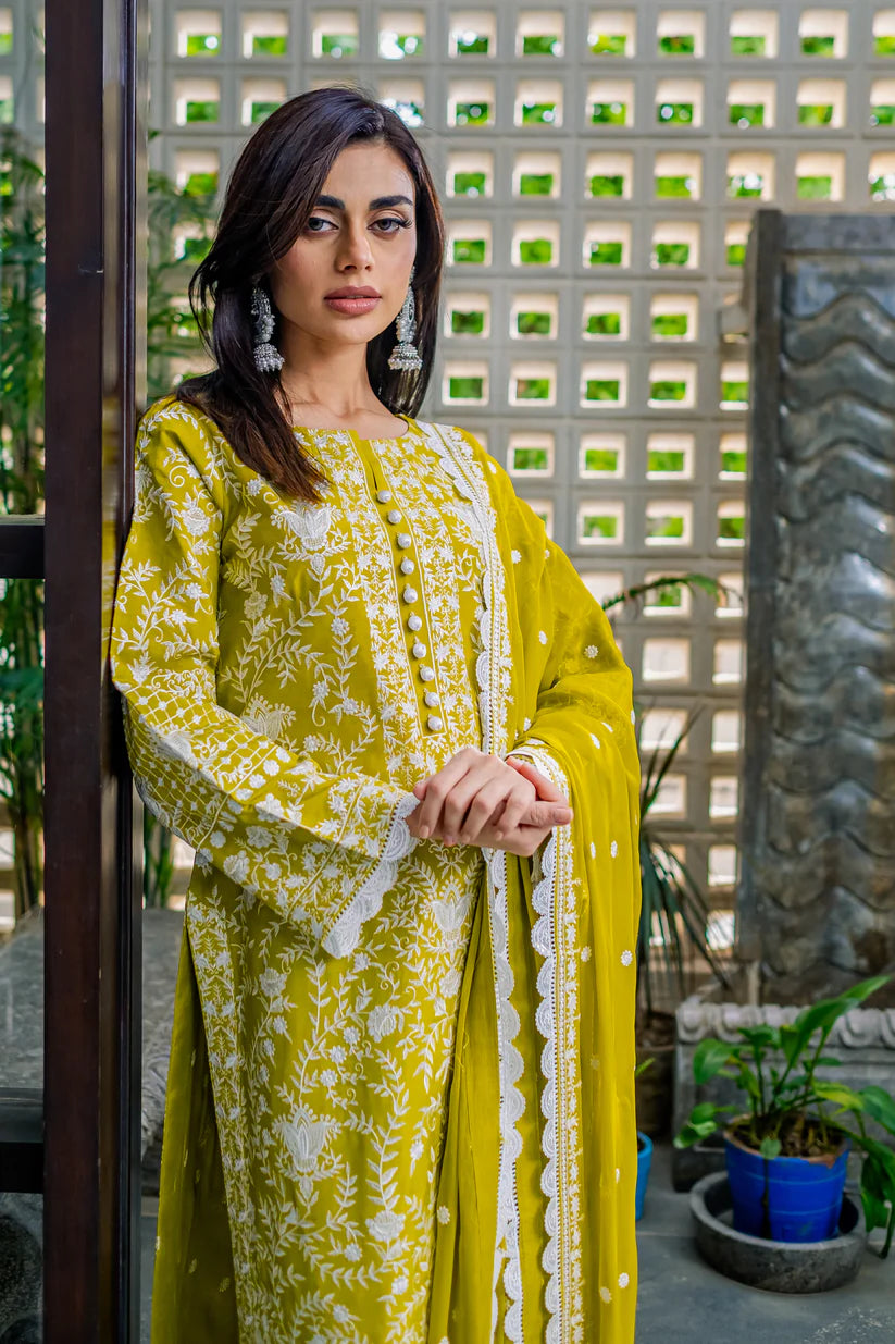 Let the intricate craftsmanship of resham and sequin jaal work on pure raw silk steal the spotlight, with a chiffon dupatta and cotton silk bottom adding a flawless finish.