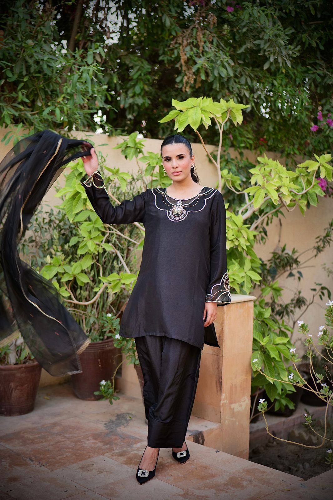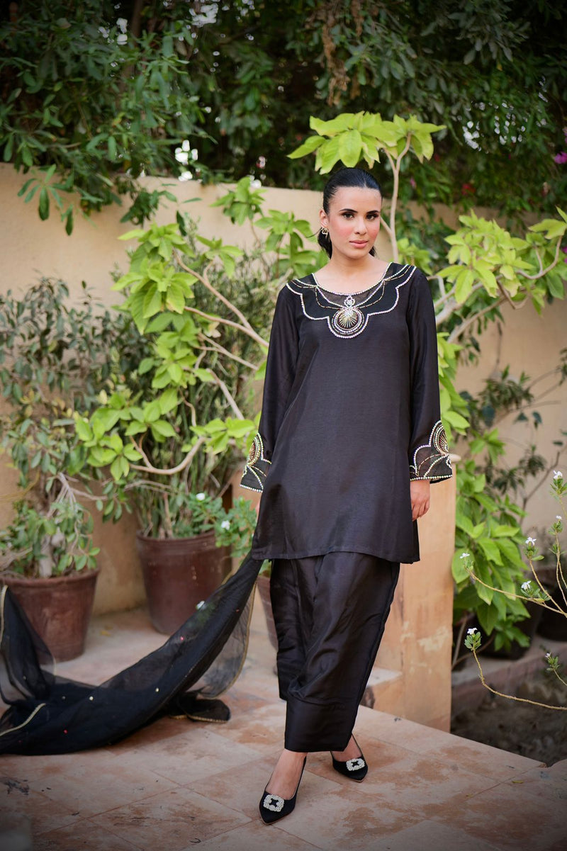 making a statement with farshi shalwars in pure sheesha silk material. With subtle embellishment and organza detailing on the neckline and sleeves. Paired with soft organza dupatta.