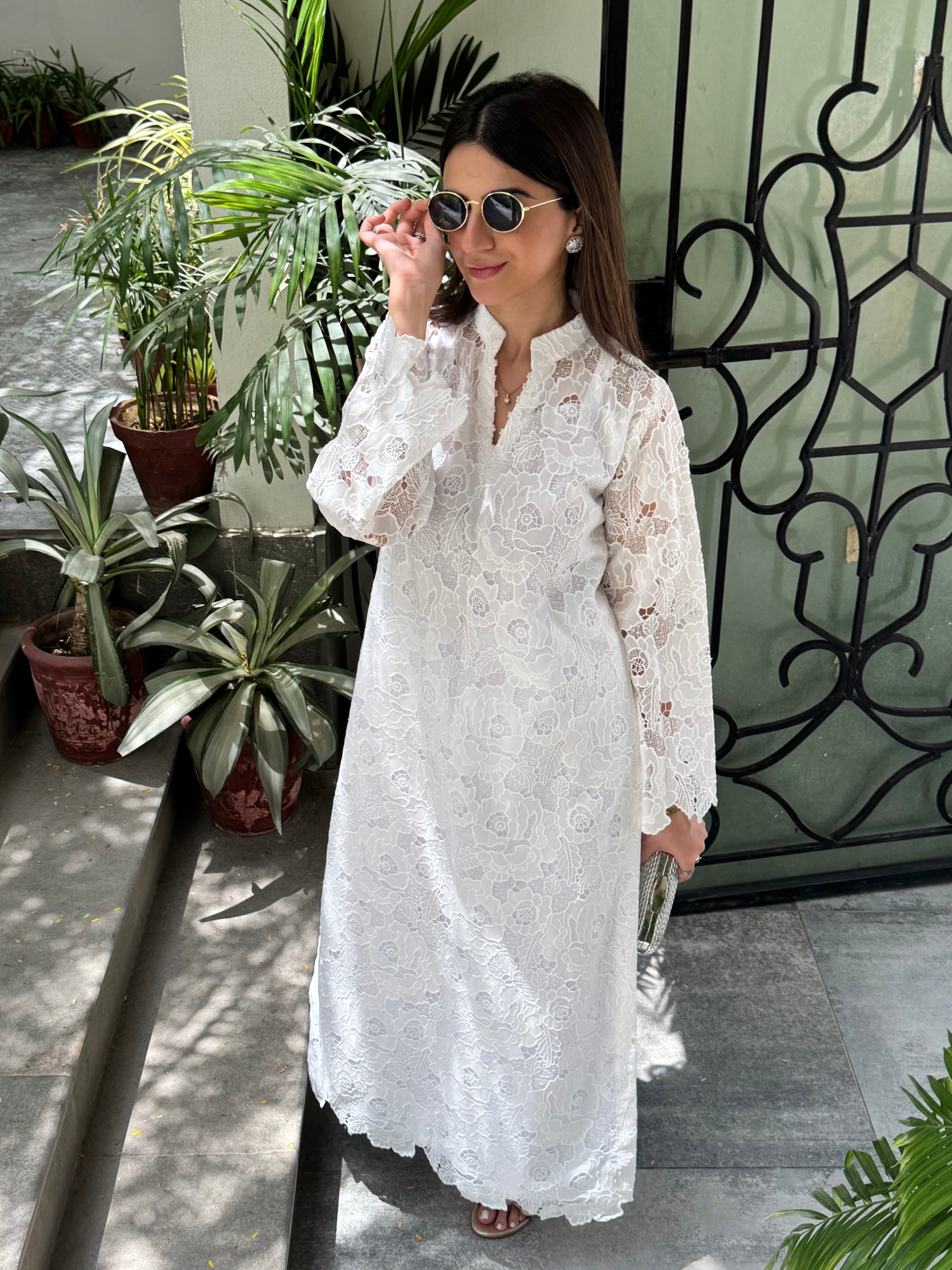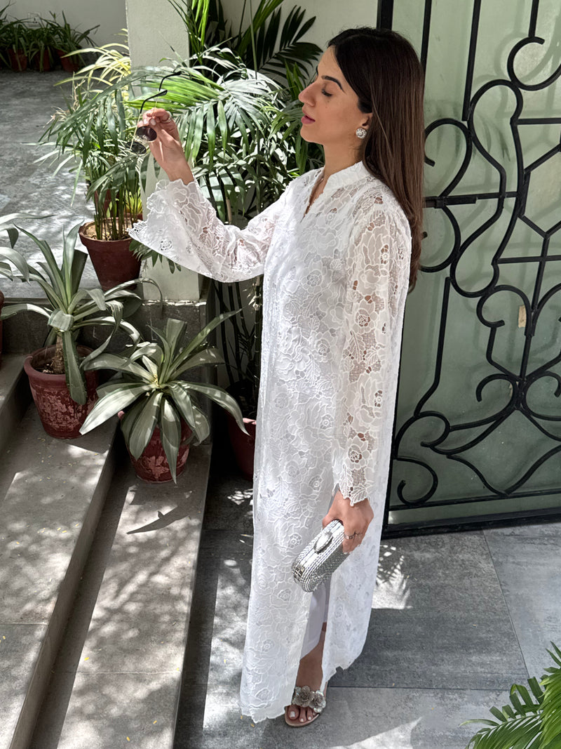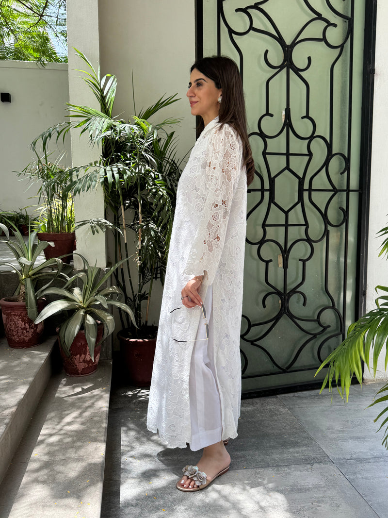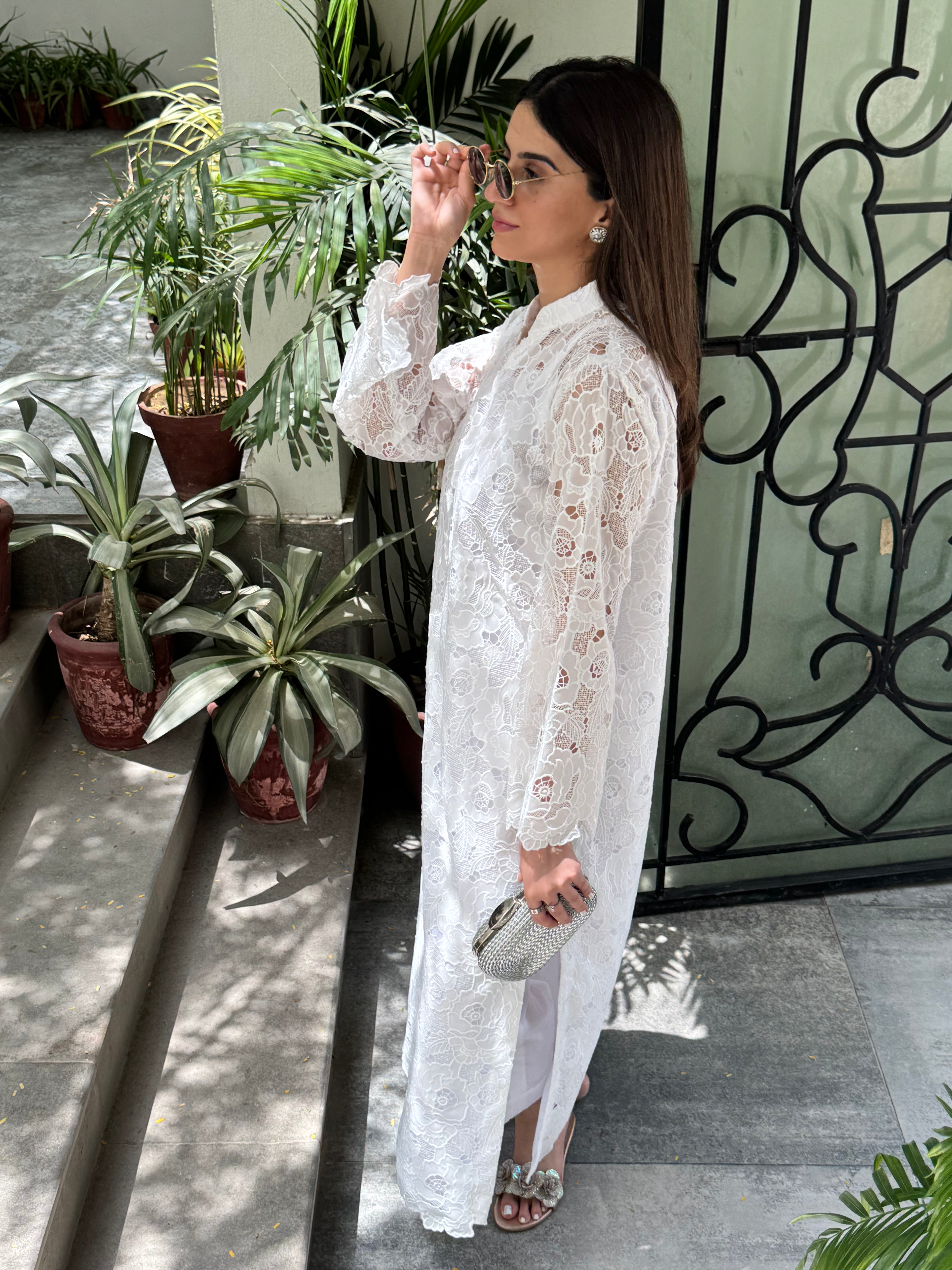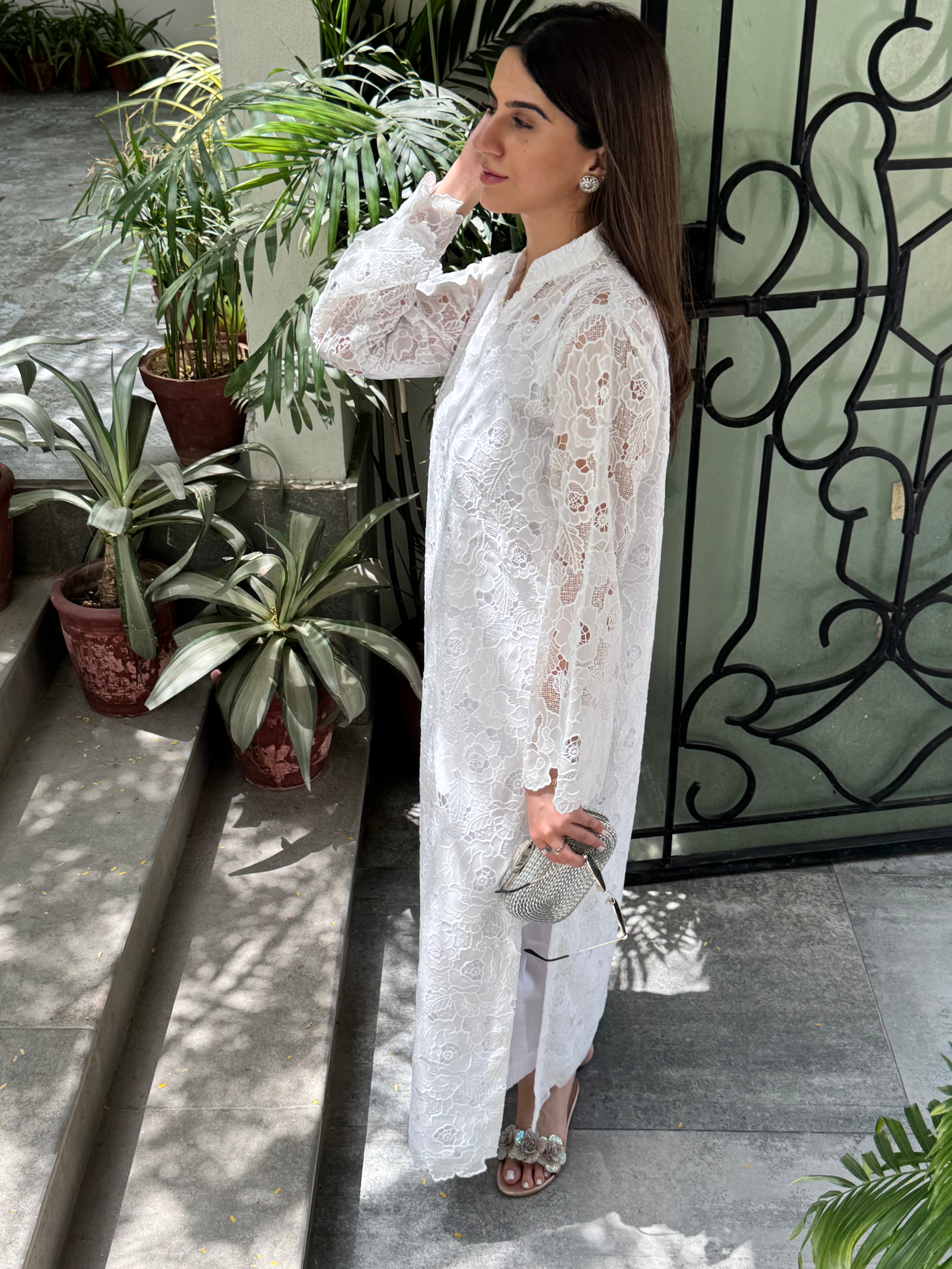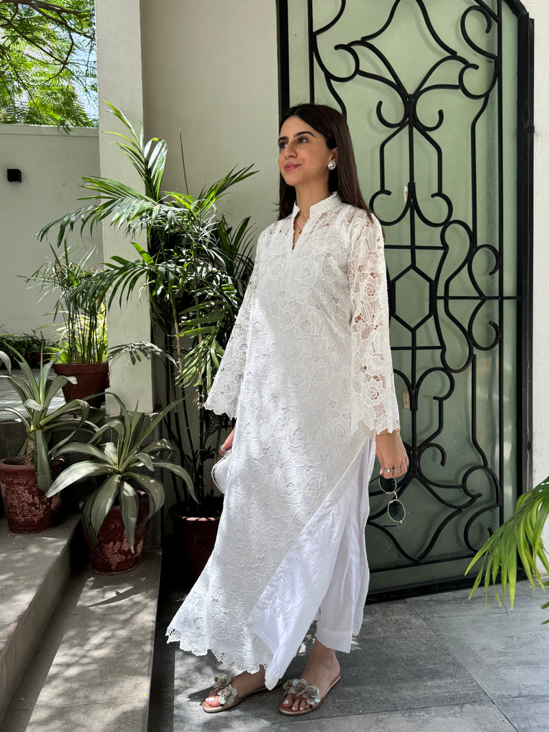 A pure white chickankari 2-piece with a flowing long shirt and matching trouser simple, elegant, and effortlessly stylish.