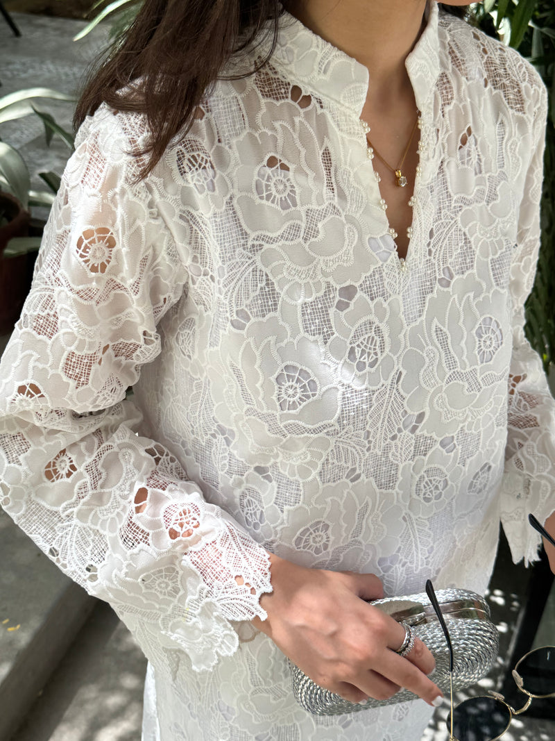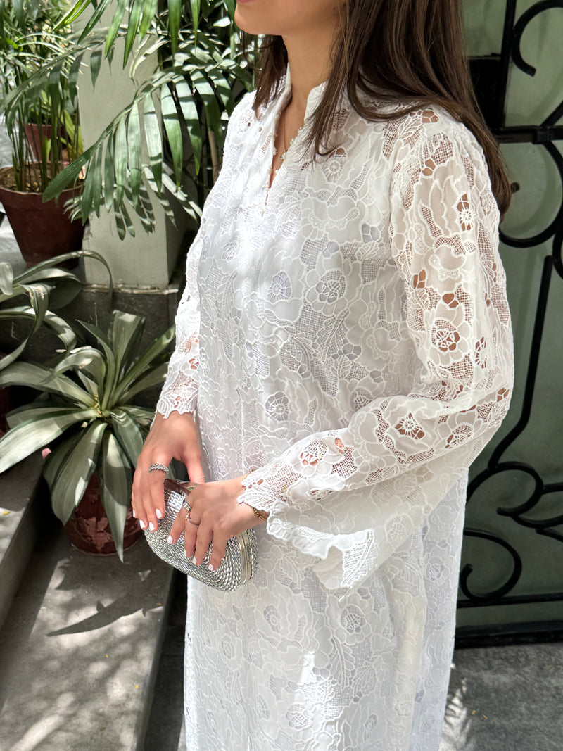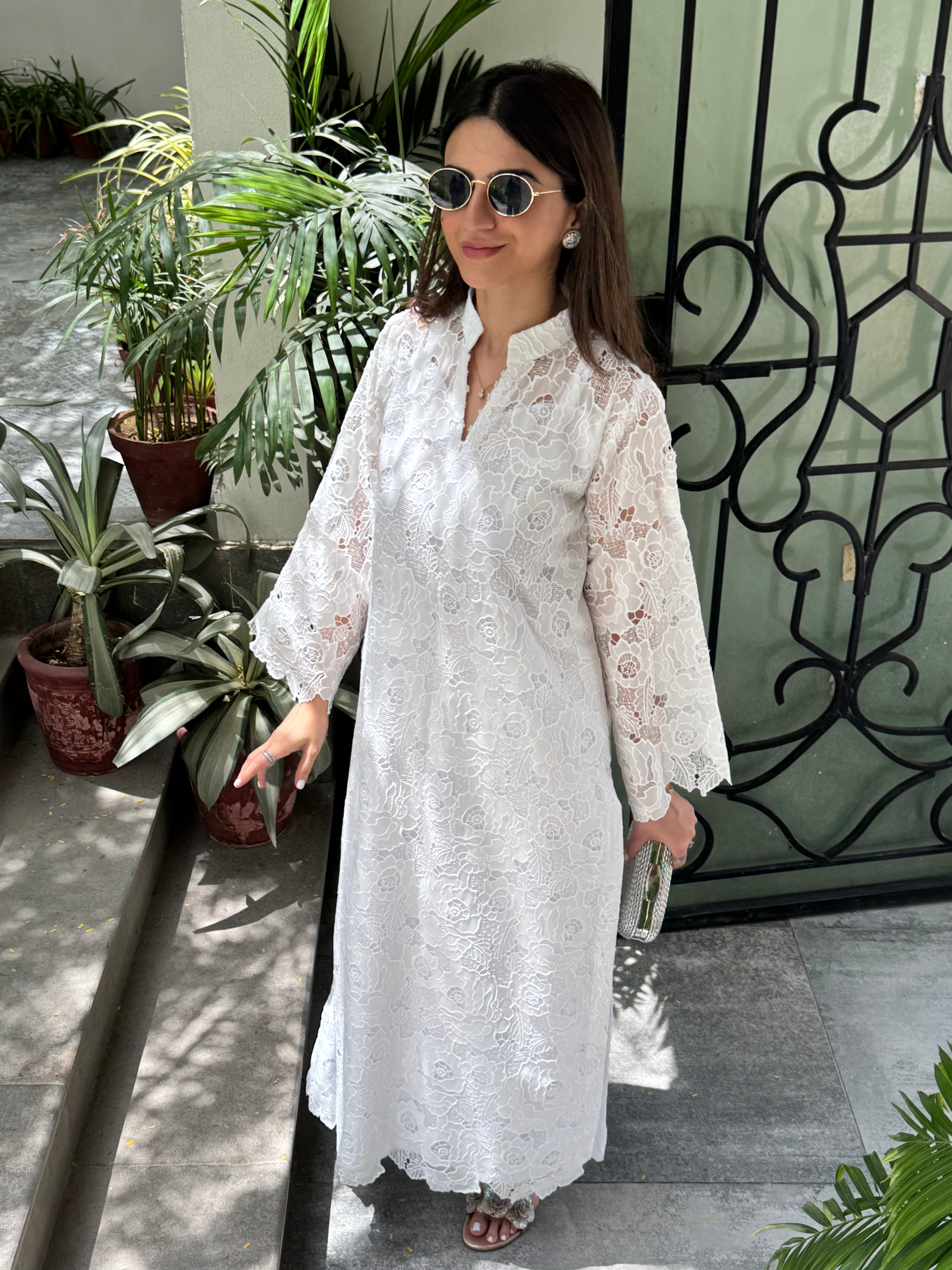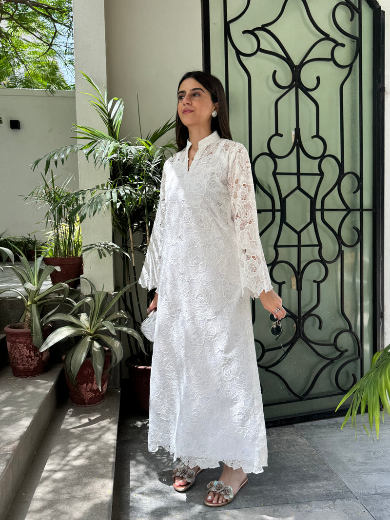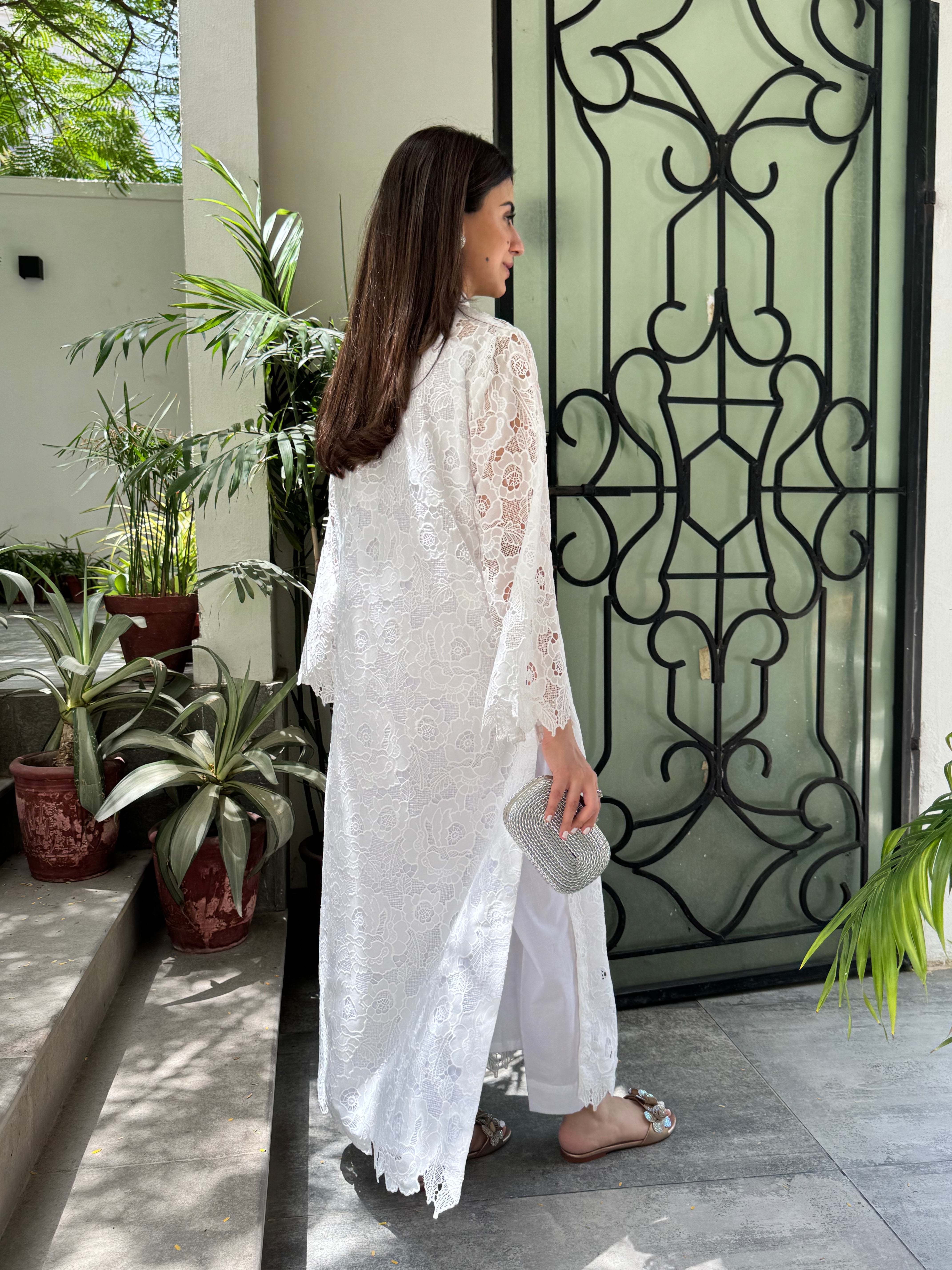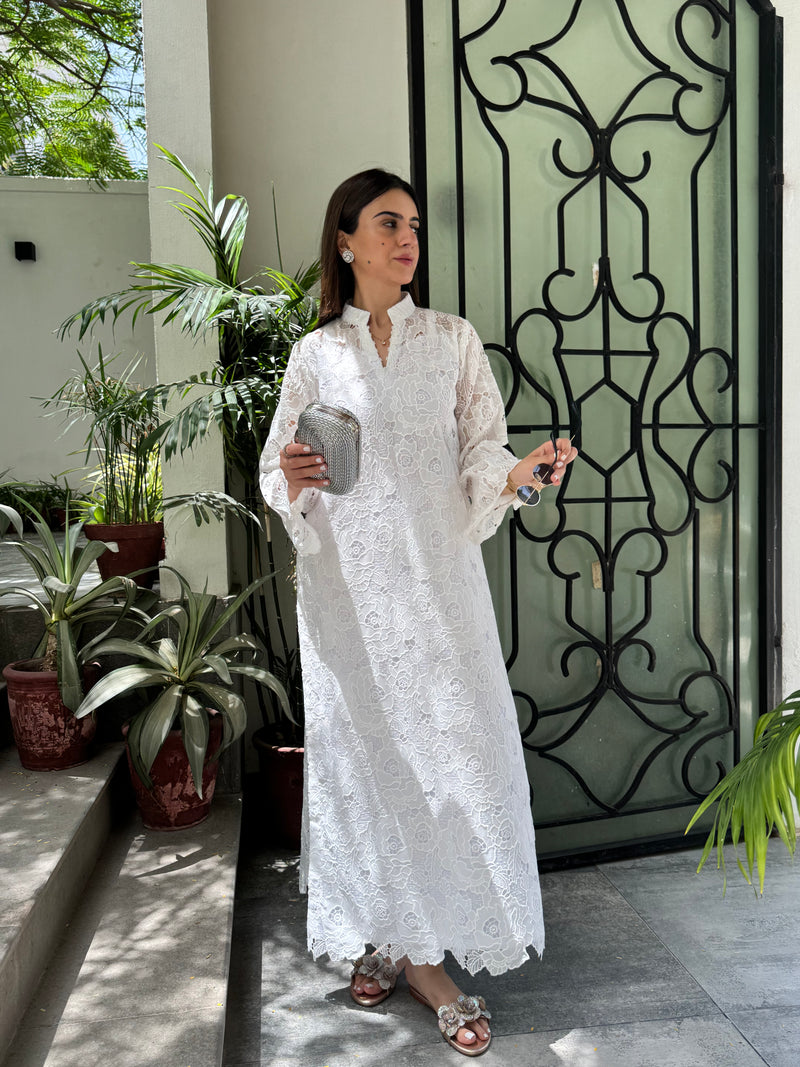 A pure white chickankari 2-piece with a flowing long shirt and matching trouser simple, elegant, and effortlessly stylish.