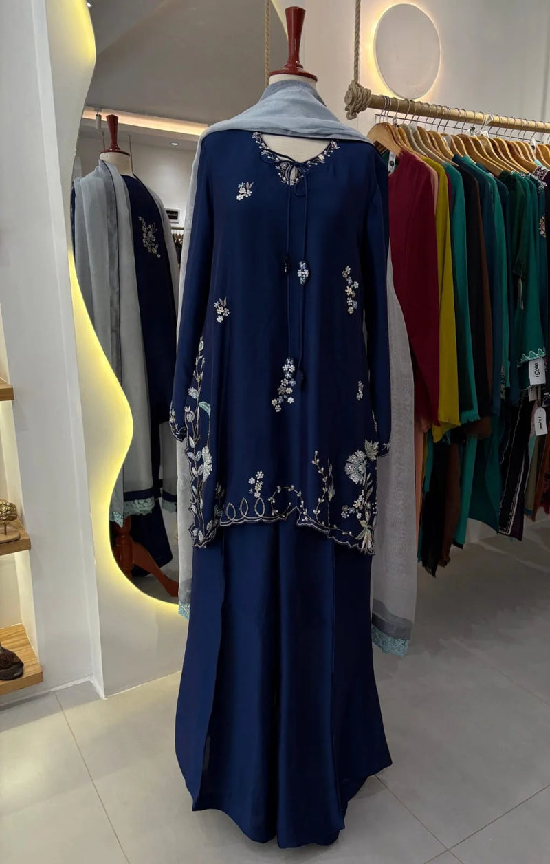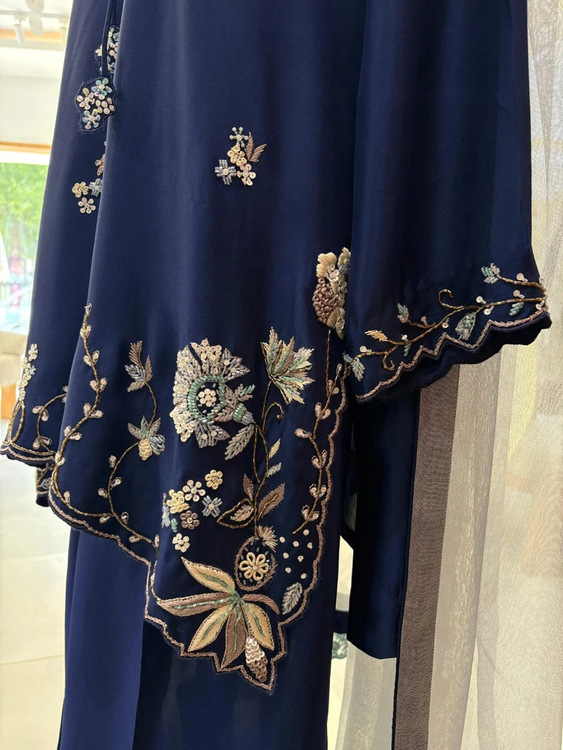 Introducing Sapphire Sky — a statement Shisha-silk ensemble crafted to mesmerize. The short shirt is adorned with complete hand embellishment, featuring delicate shisha, beads, and shimmering accents that catch the light effortlessly. Paired with flare pants for a modern, flowy silhouette, the outfit balances elegance with contemporary charm.
