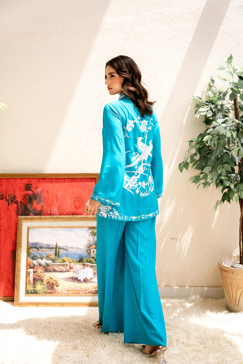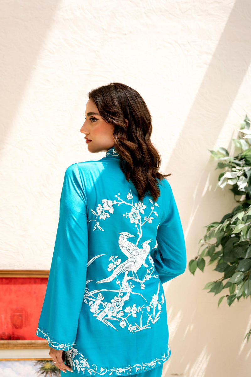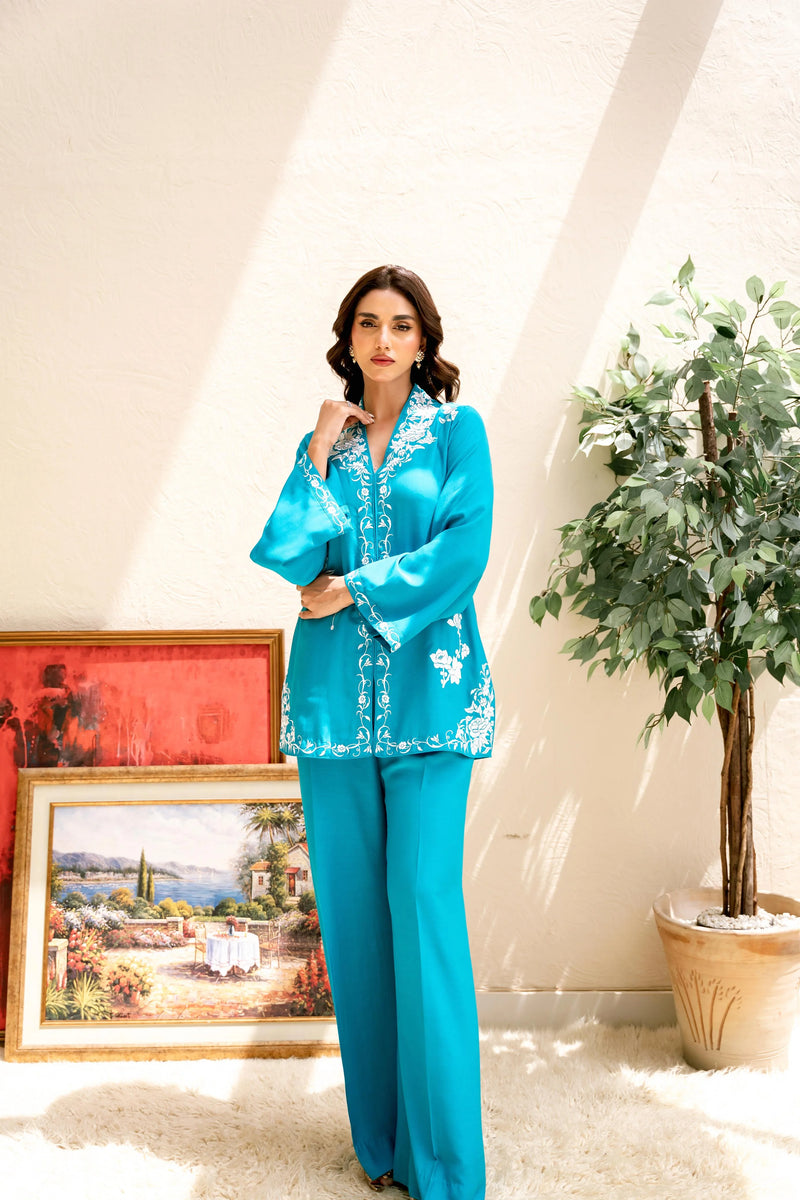 Embody the essence of sophistication with “Shanghai Chic”, where vintage charm meets modern flair. This stunning ensemble features a front-open short top crafted from luxurious blended silk, showcasing intricate vintage Chinese embroidery rendered in ivory silk thread. Paired with effortless loose-fit matching pants, this outfit blends timeless elegance with contemporary chic.