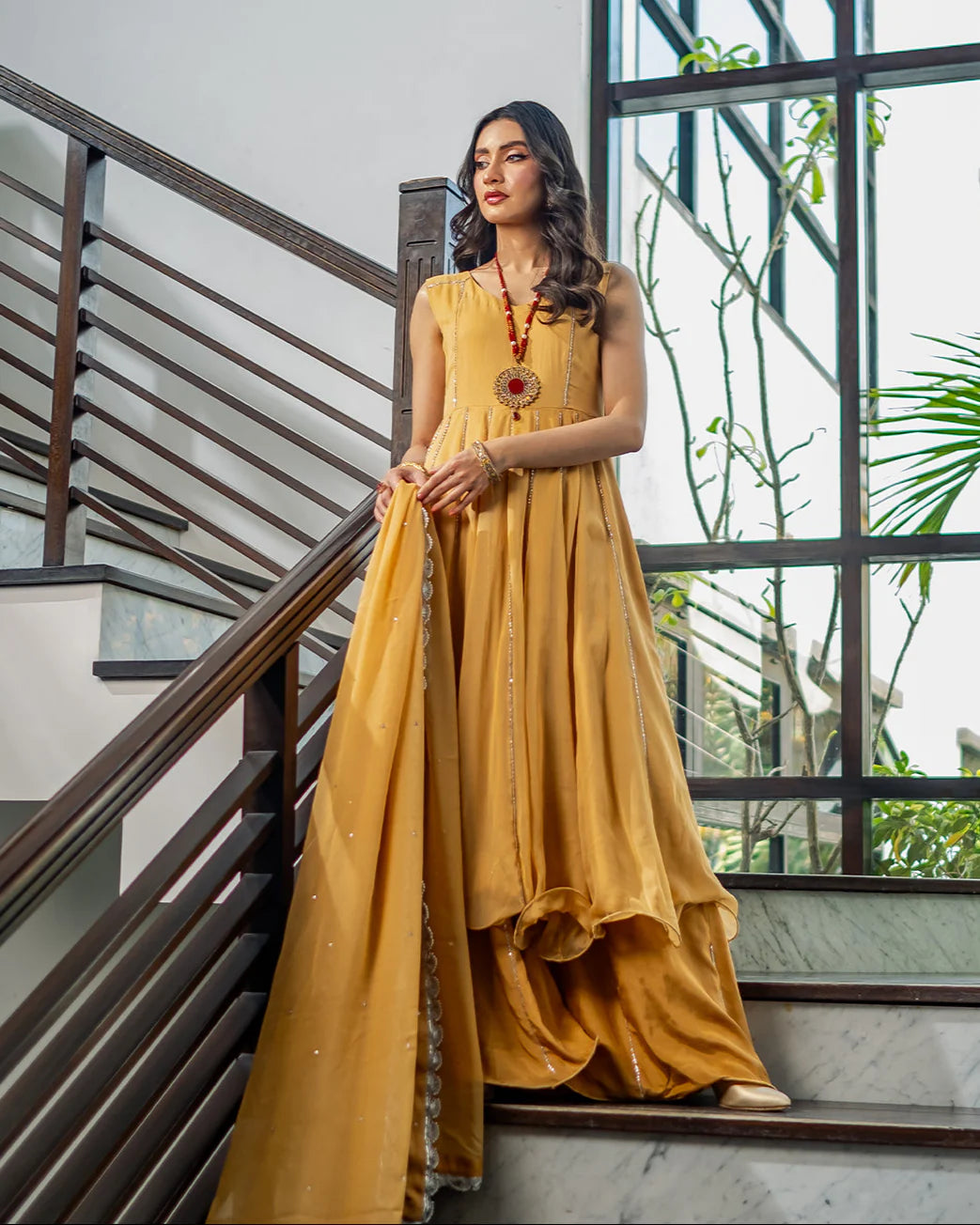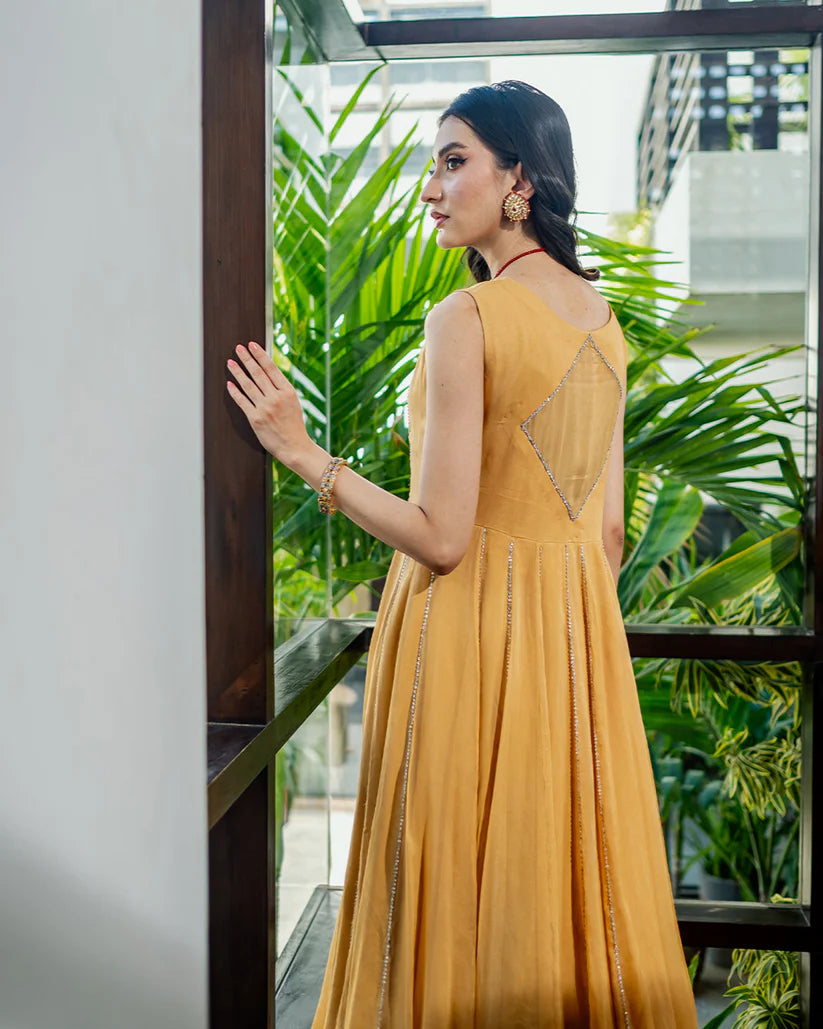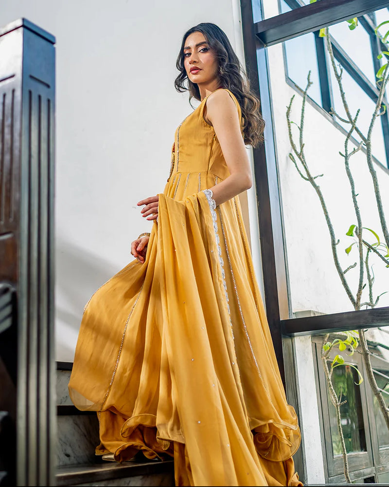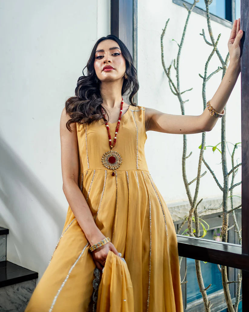 Radiating elegance, this deep champagne outfit in pure M’om chiffon features hand-embellished Tiky moonstones on each panel, complemented by a matching dupatta and plazo adorned with similar detailing.