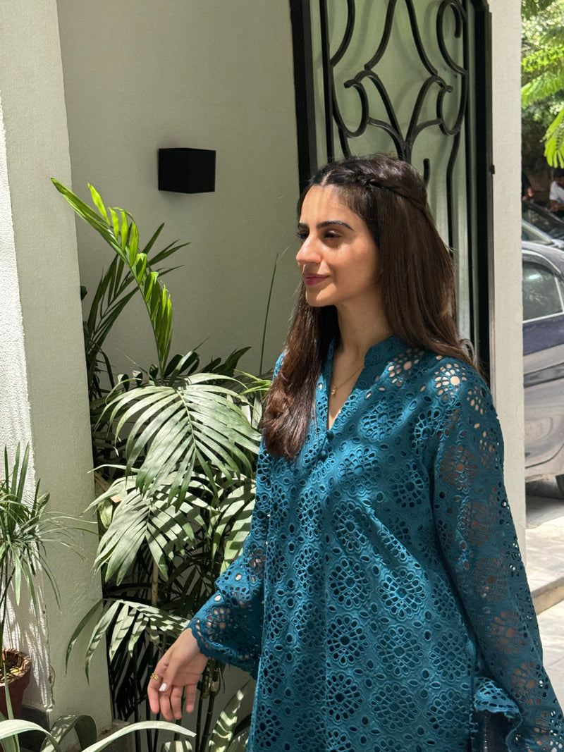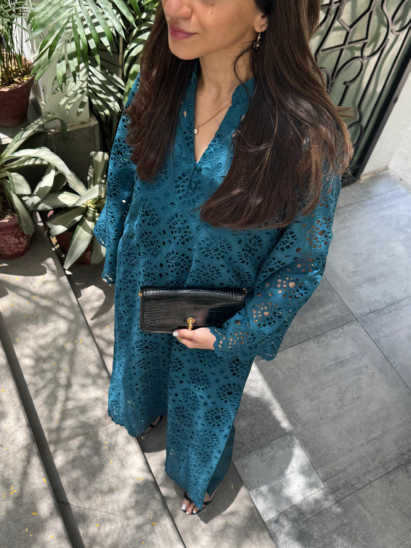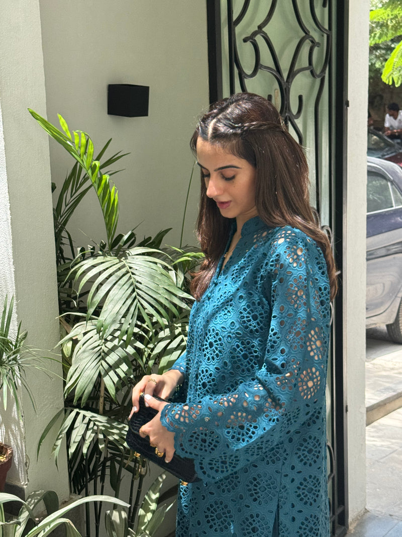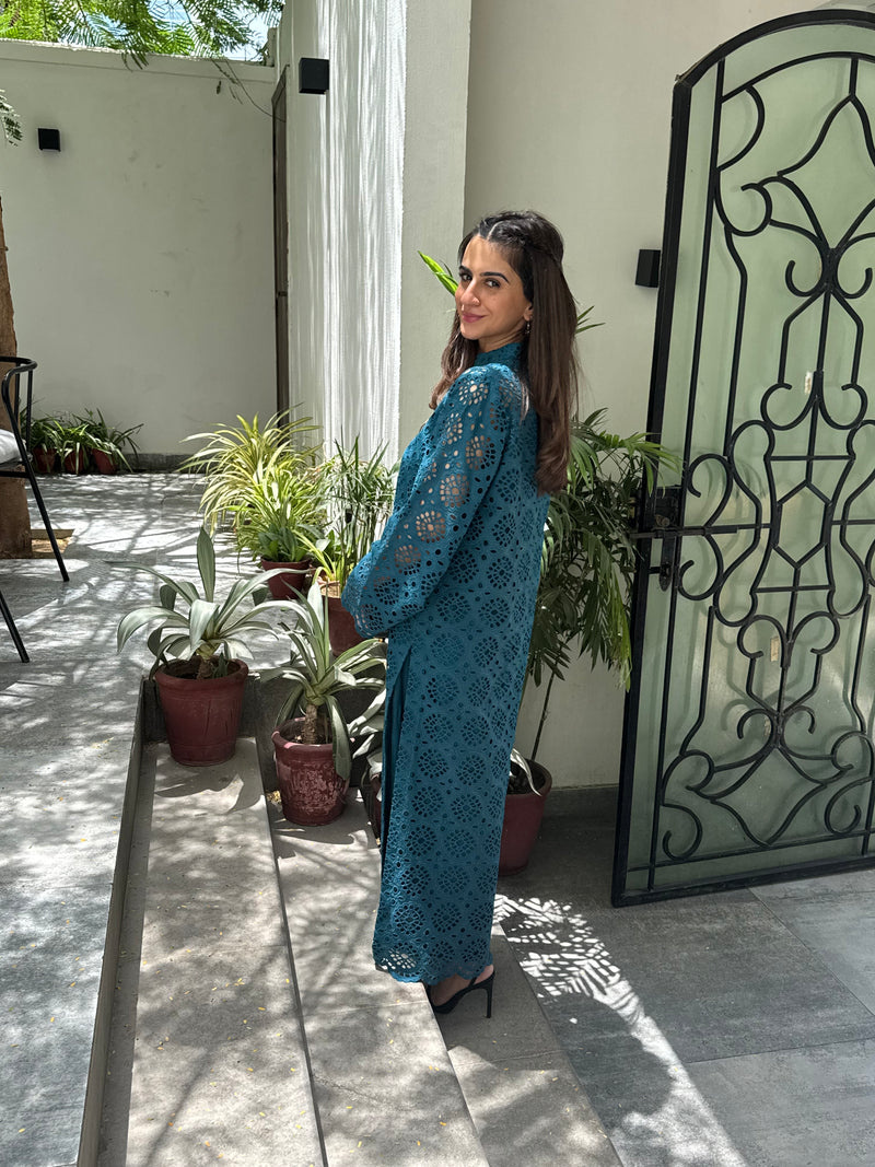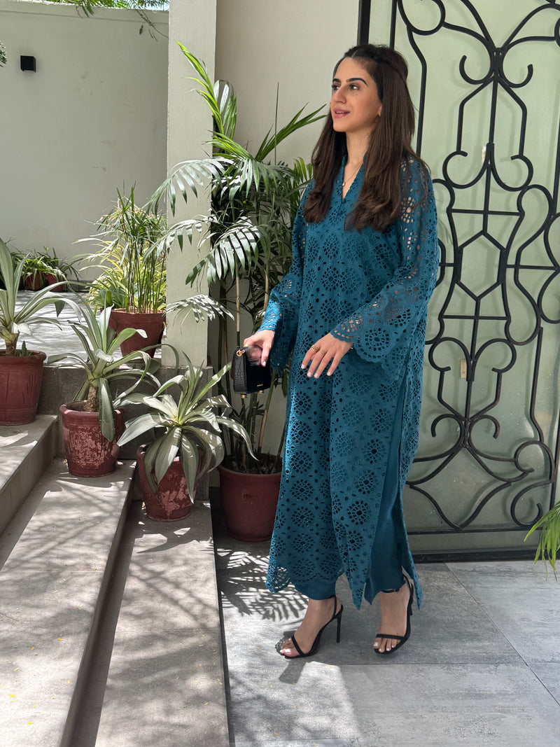 A timeless blue chickankari 2-piece with a flowing long shirt and matching trouser elegant, versatile, and easy to style.