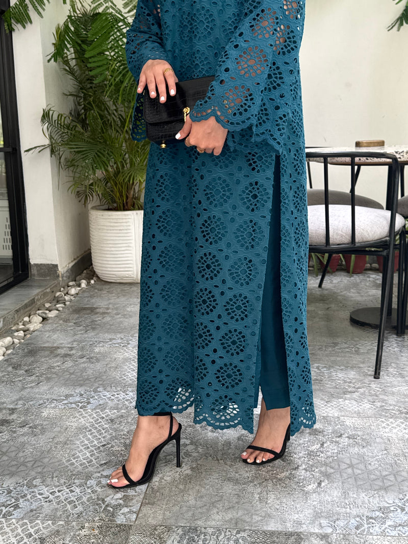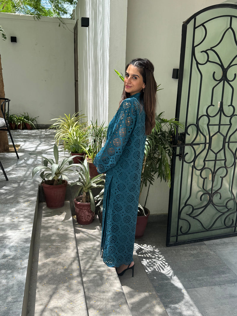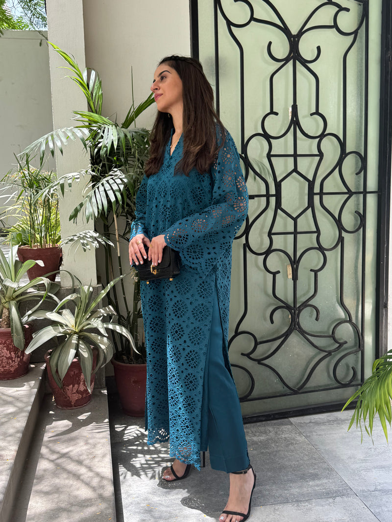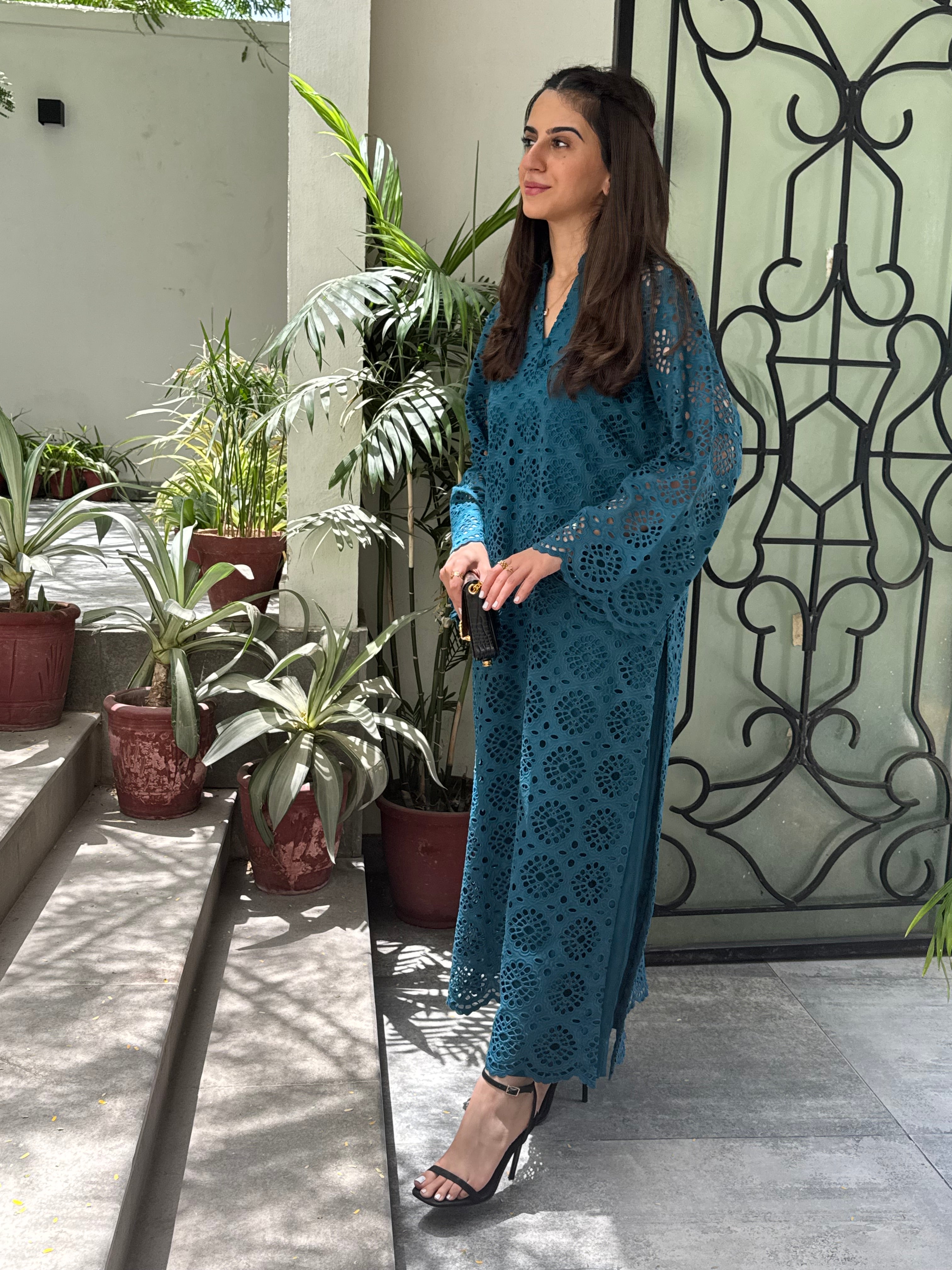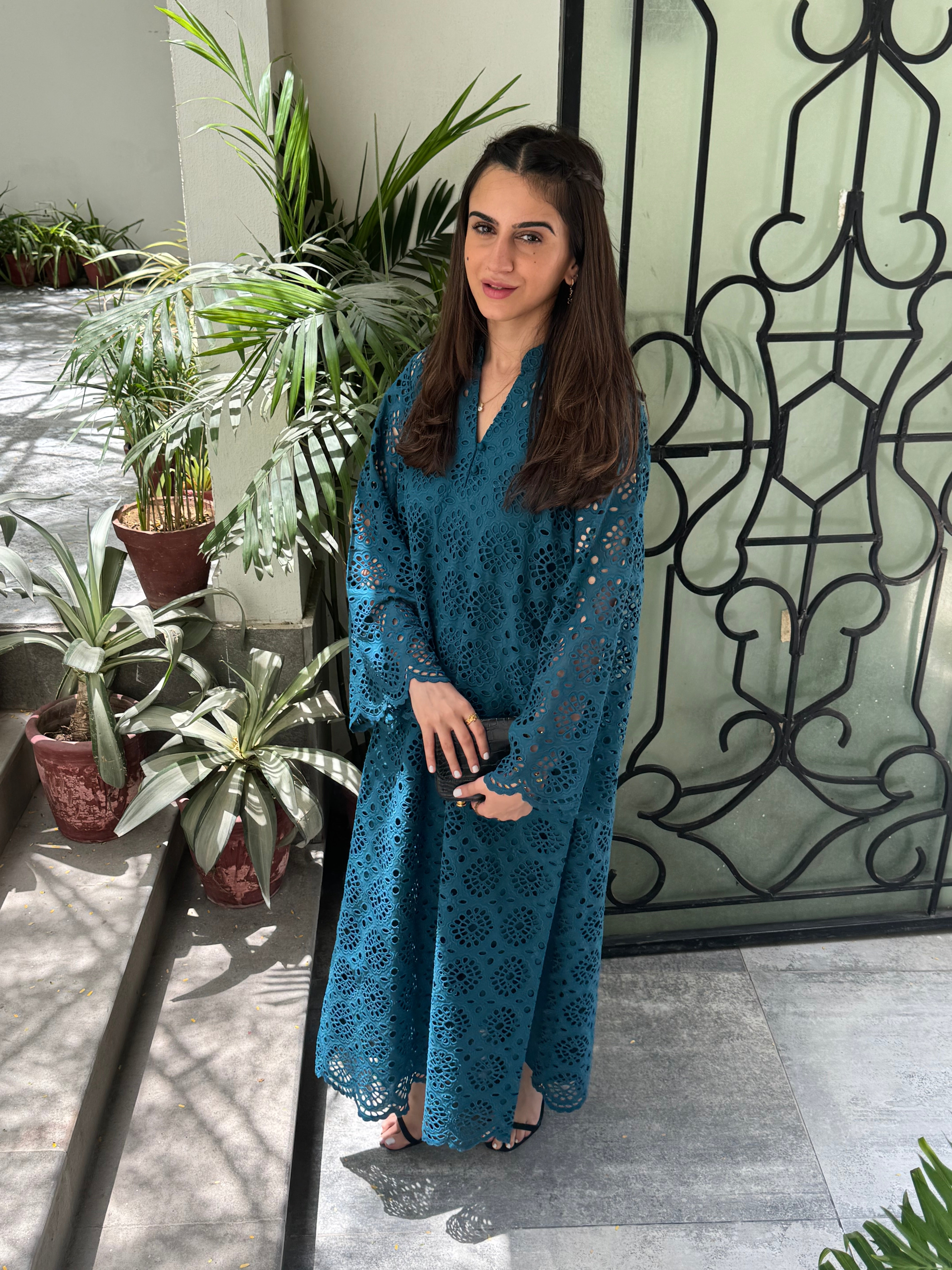 A timeless blue chickankari 2-piece with a flowing long shirt and matching trouser elegant, versatile, and easy to style.