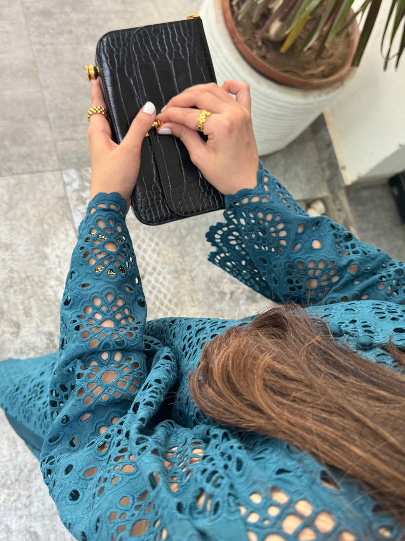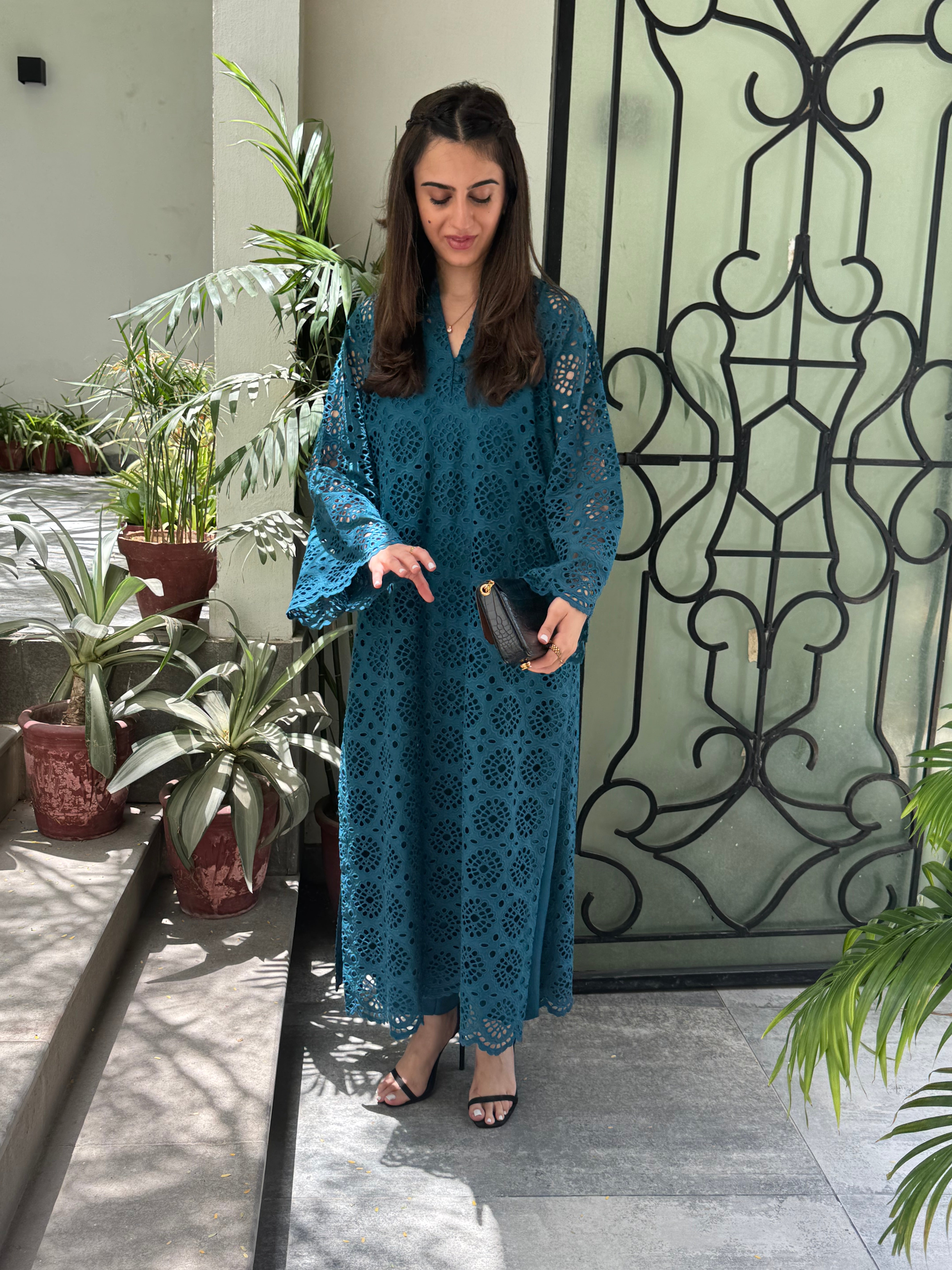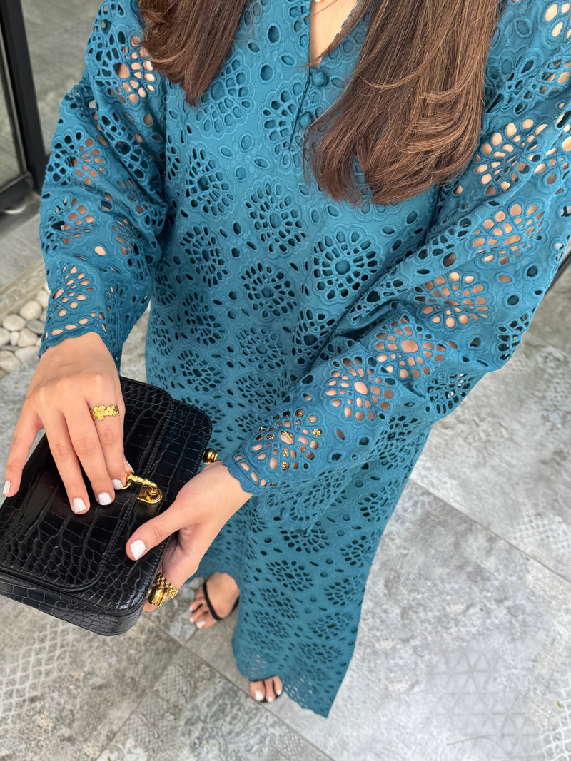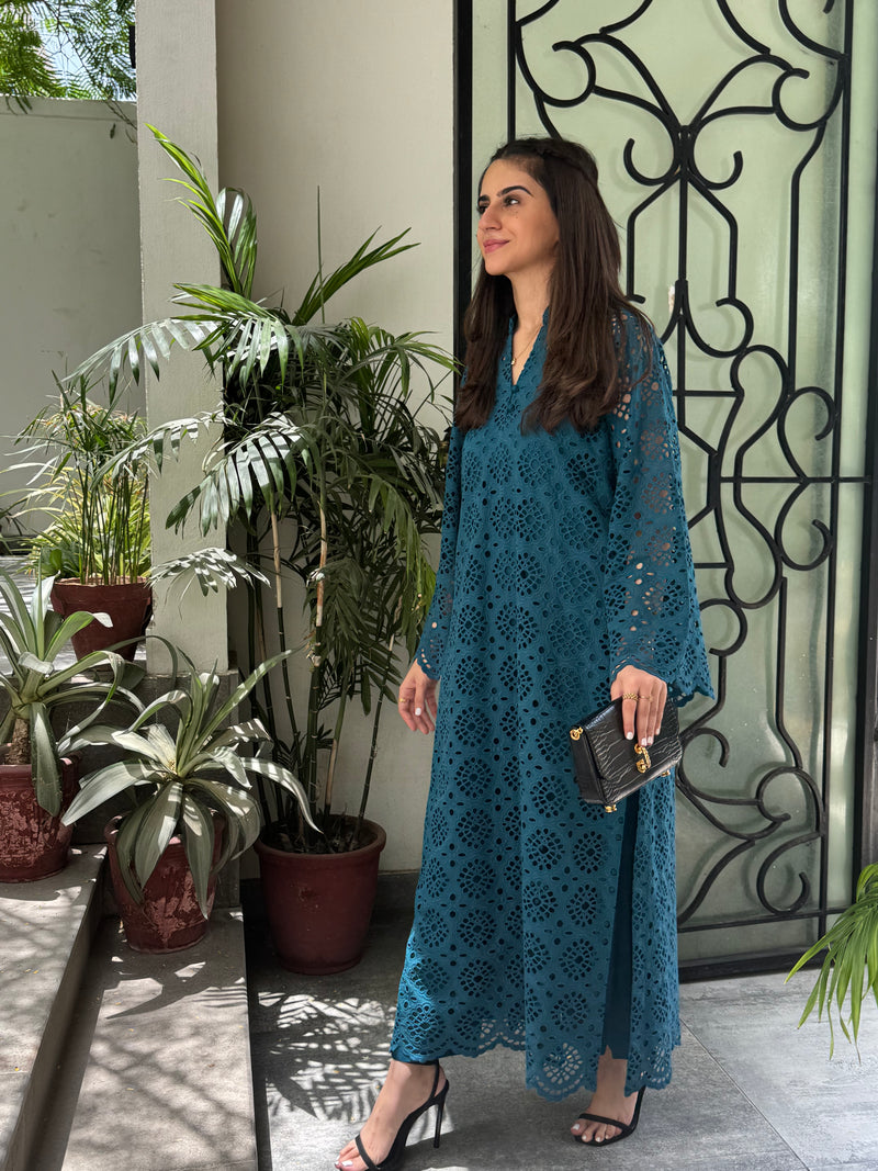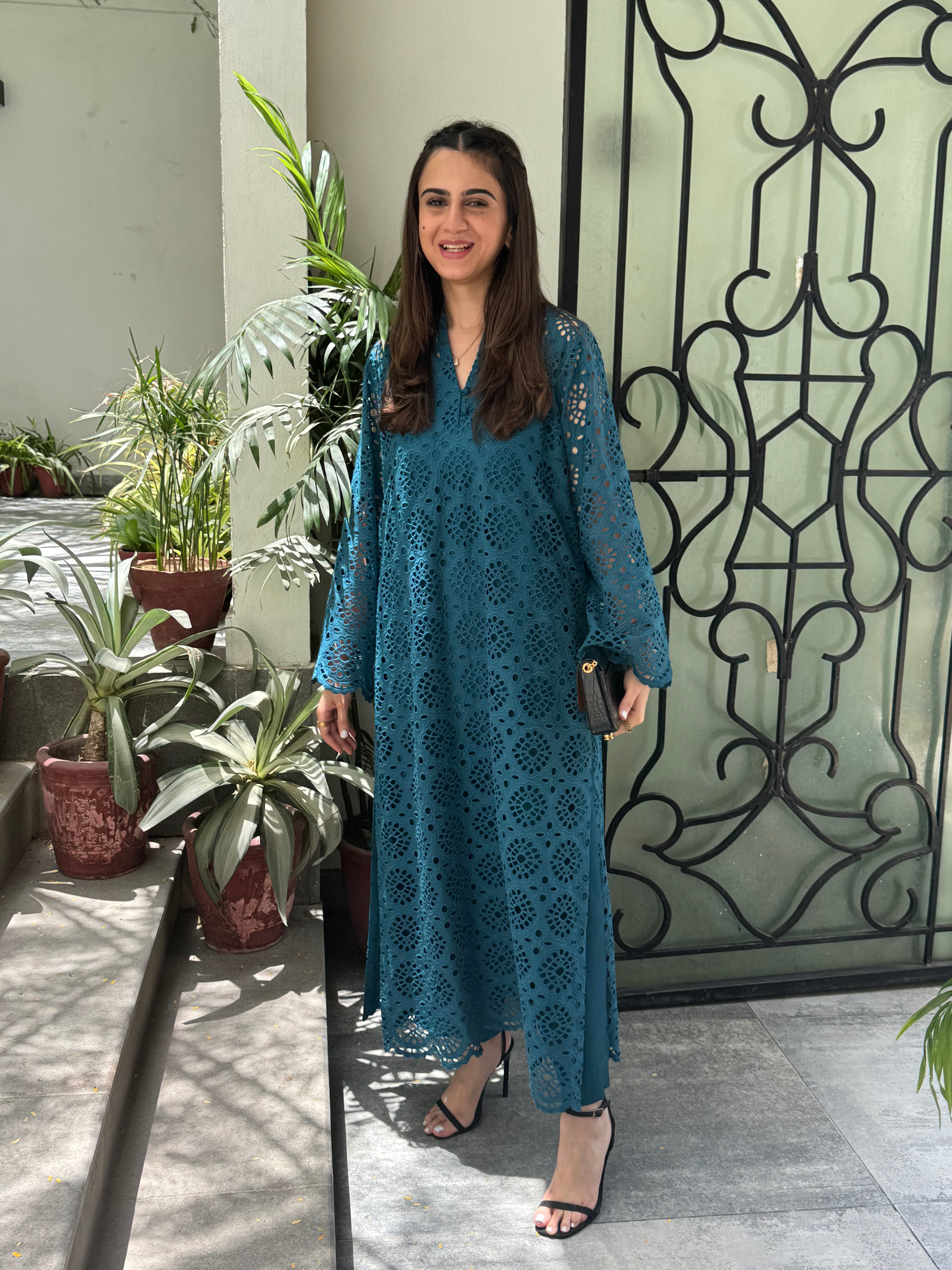 A timeless blue chickankari 2-piece with a flowing long shirt and matching trouser elegant, versatile, and easy to style.