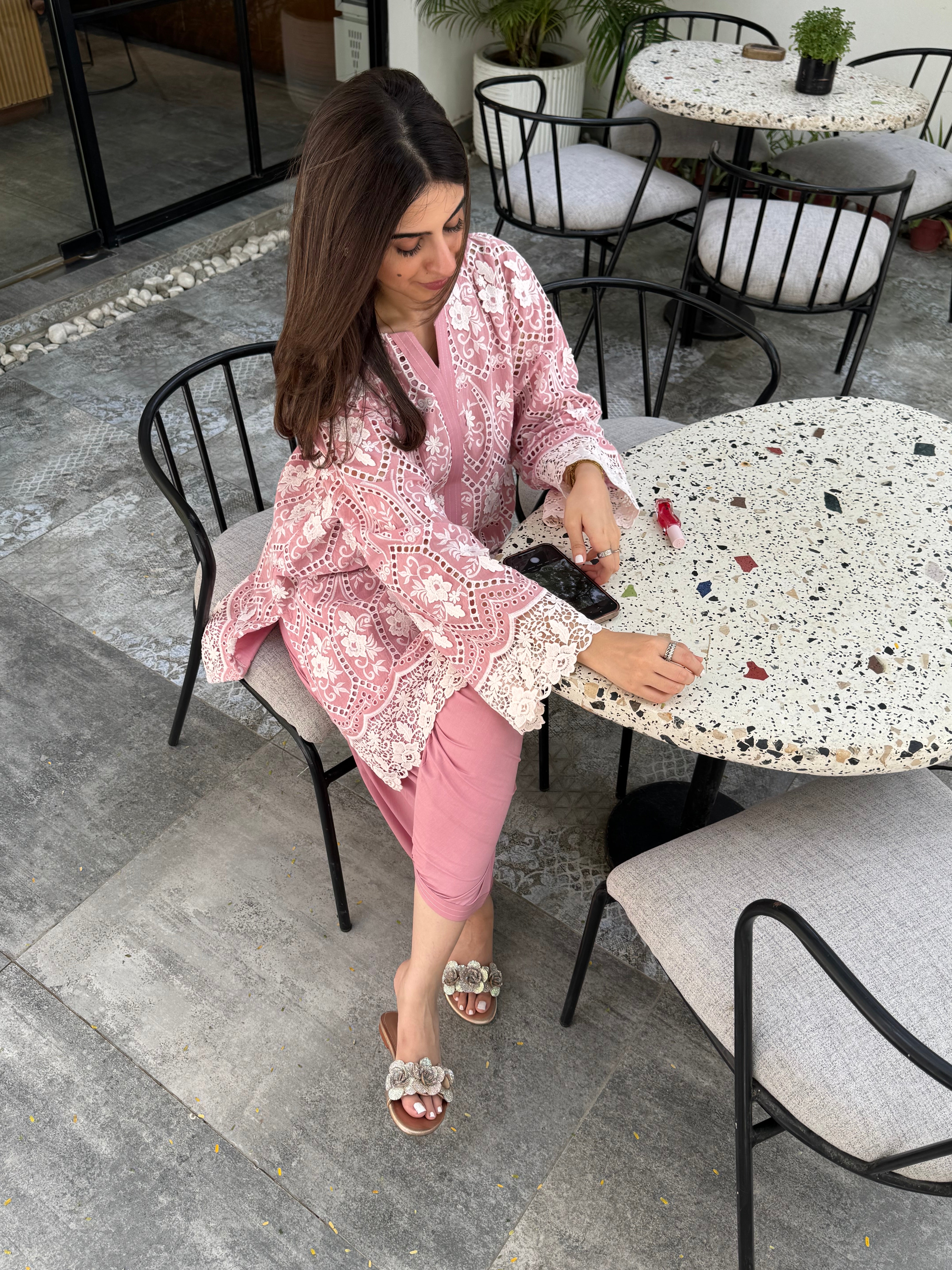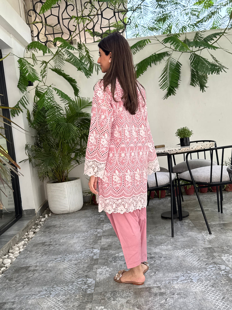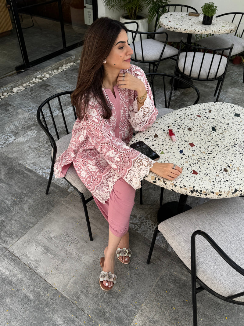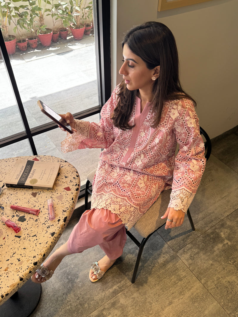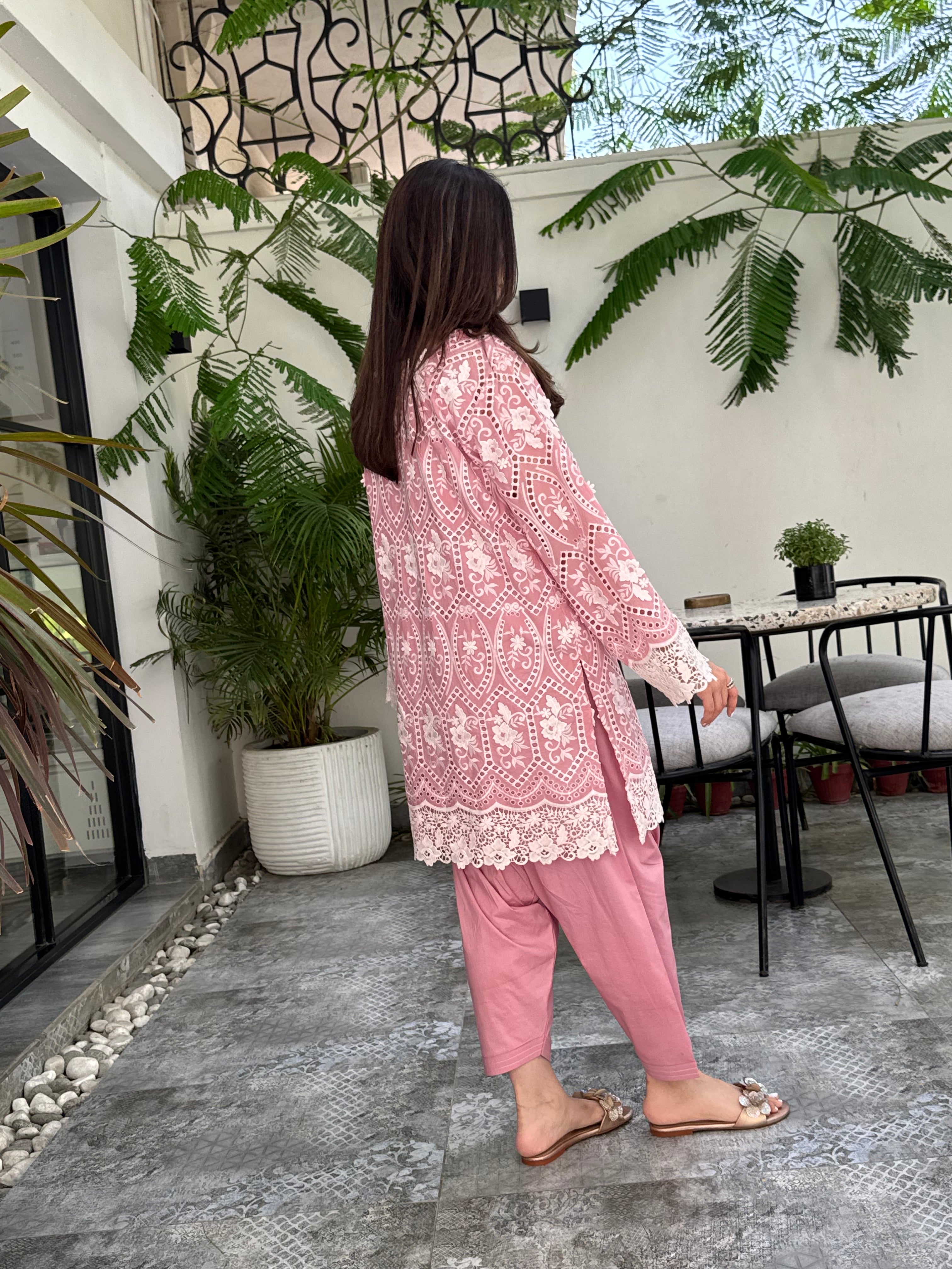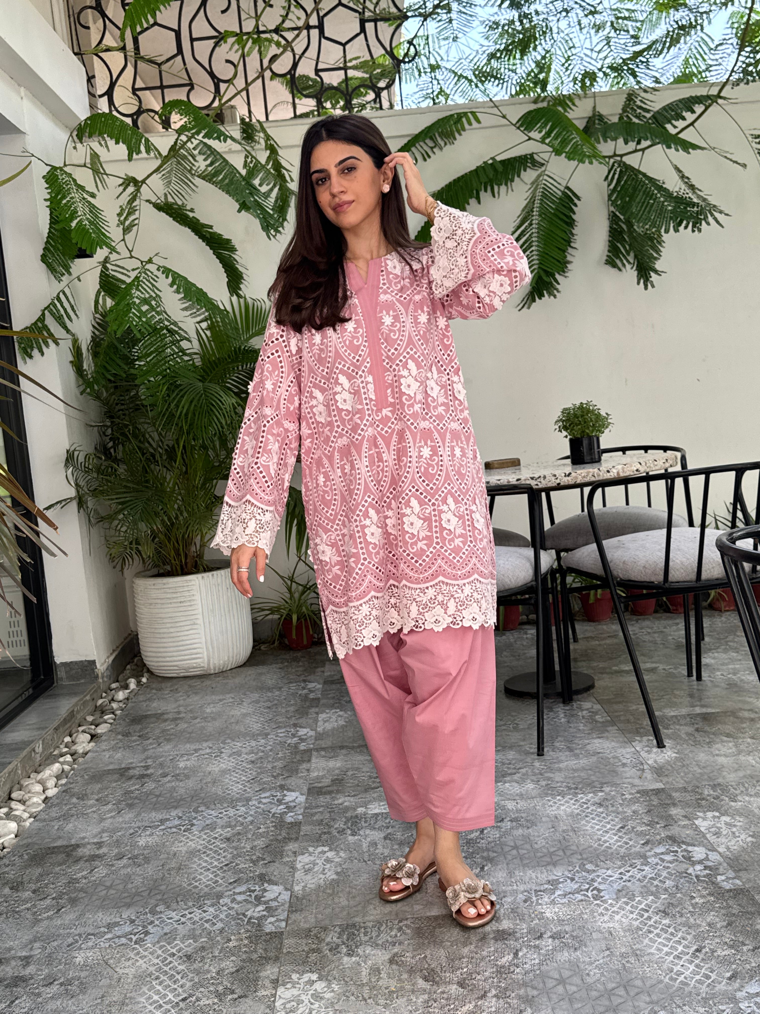 This powder pink 2-piece blends tradition and grace with a 3D motif on chikankari short shirt and classic shalwar creating a soft, elegant statement.