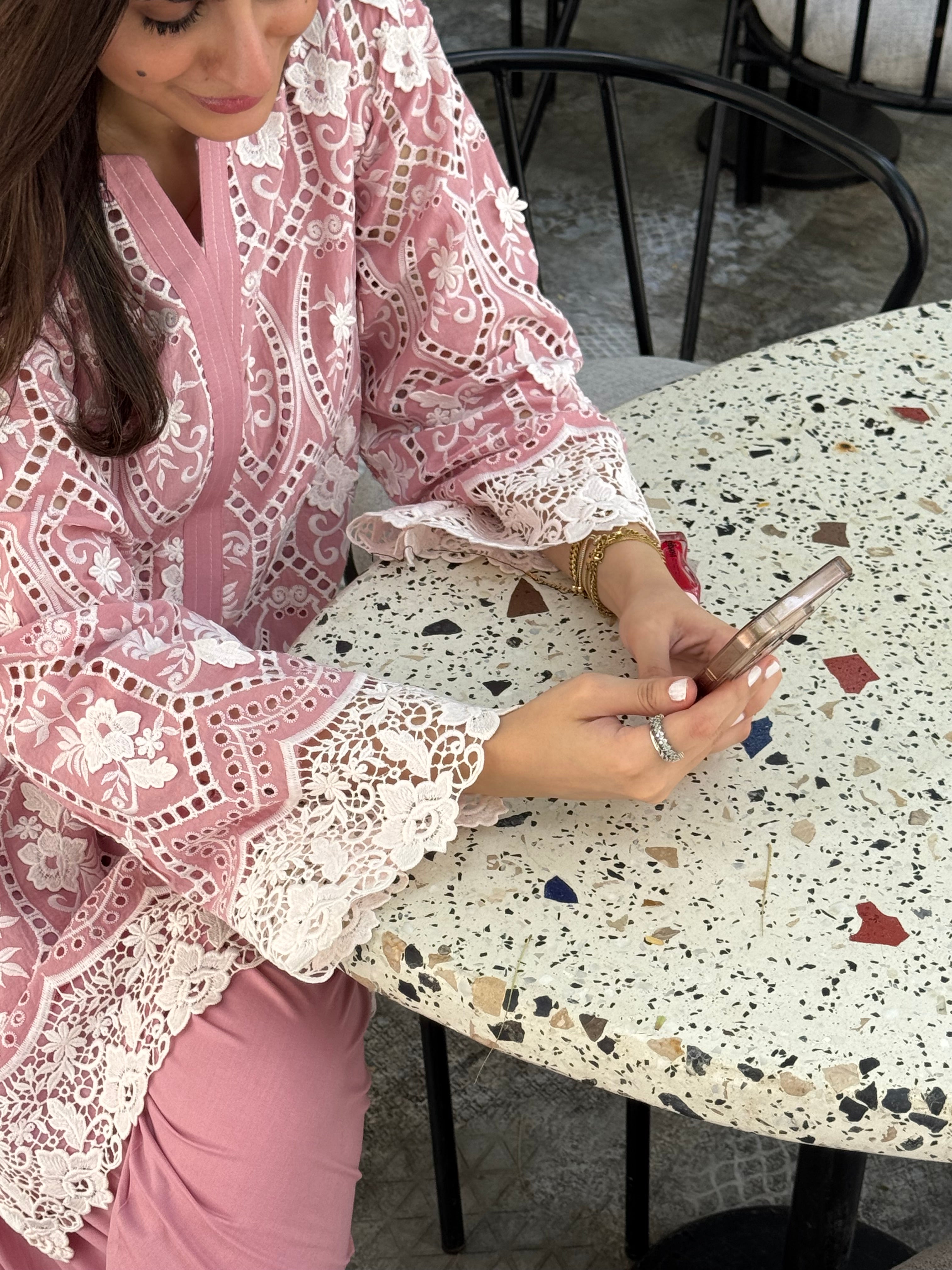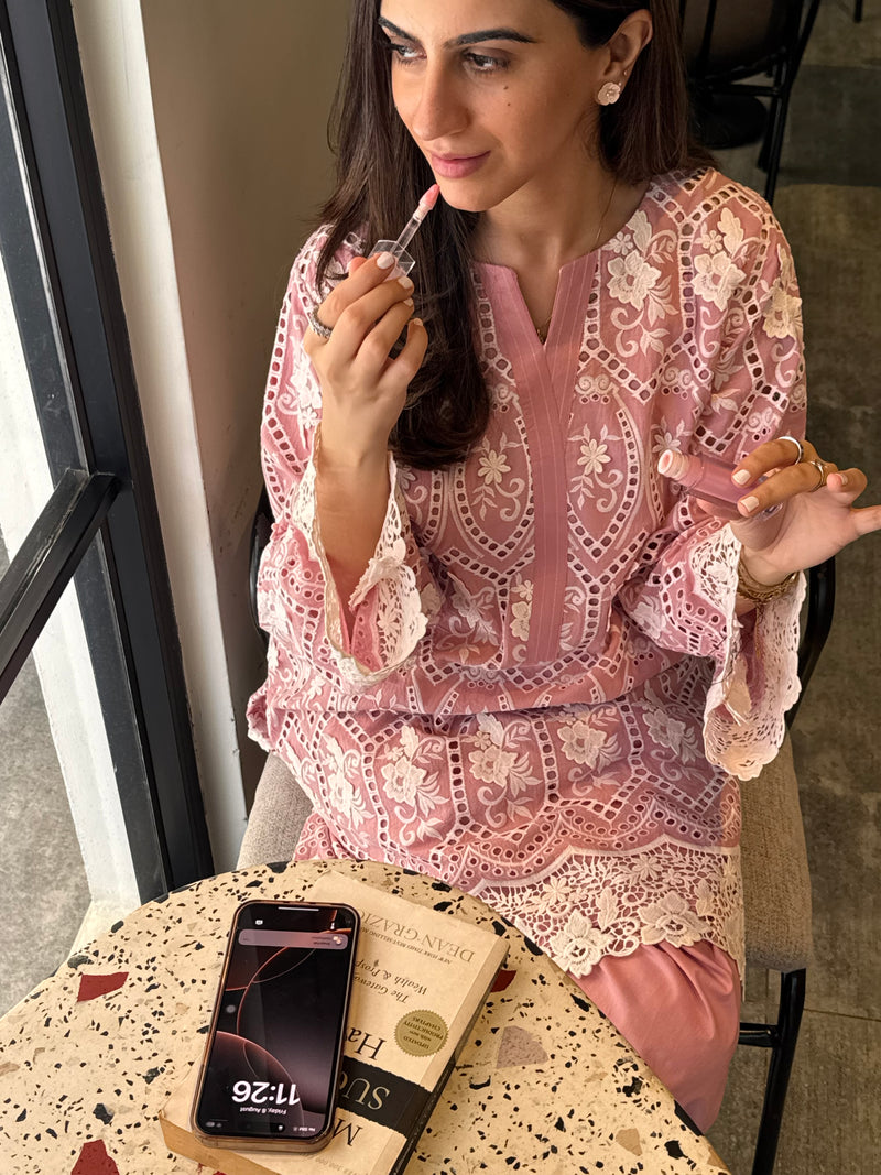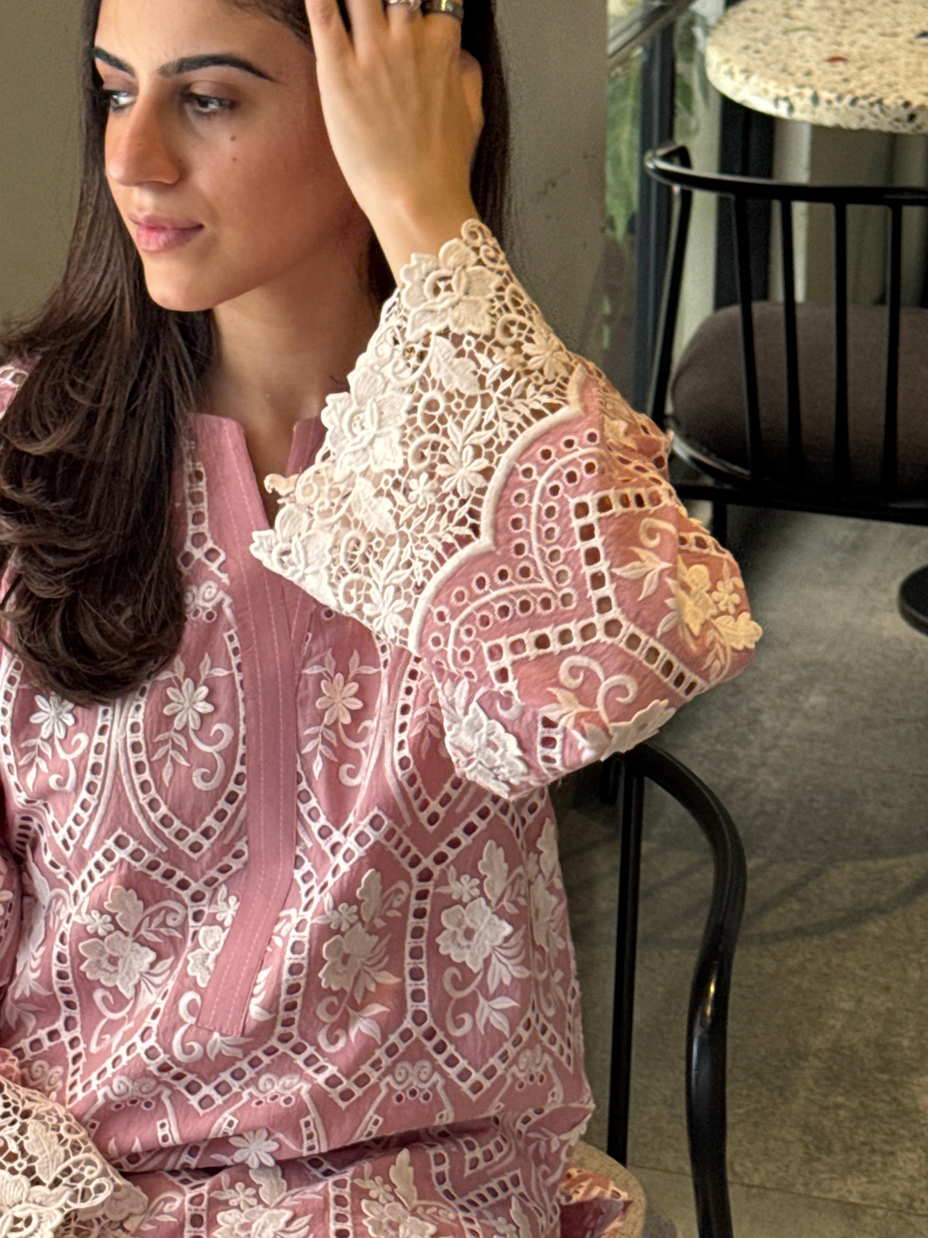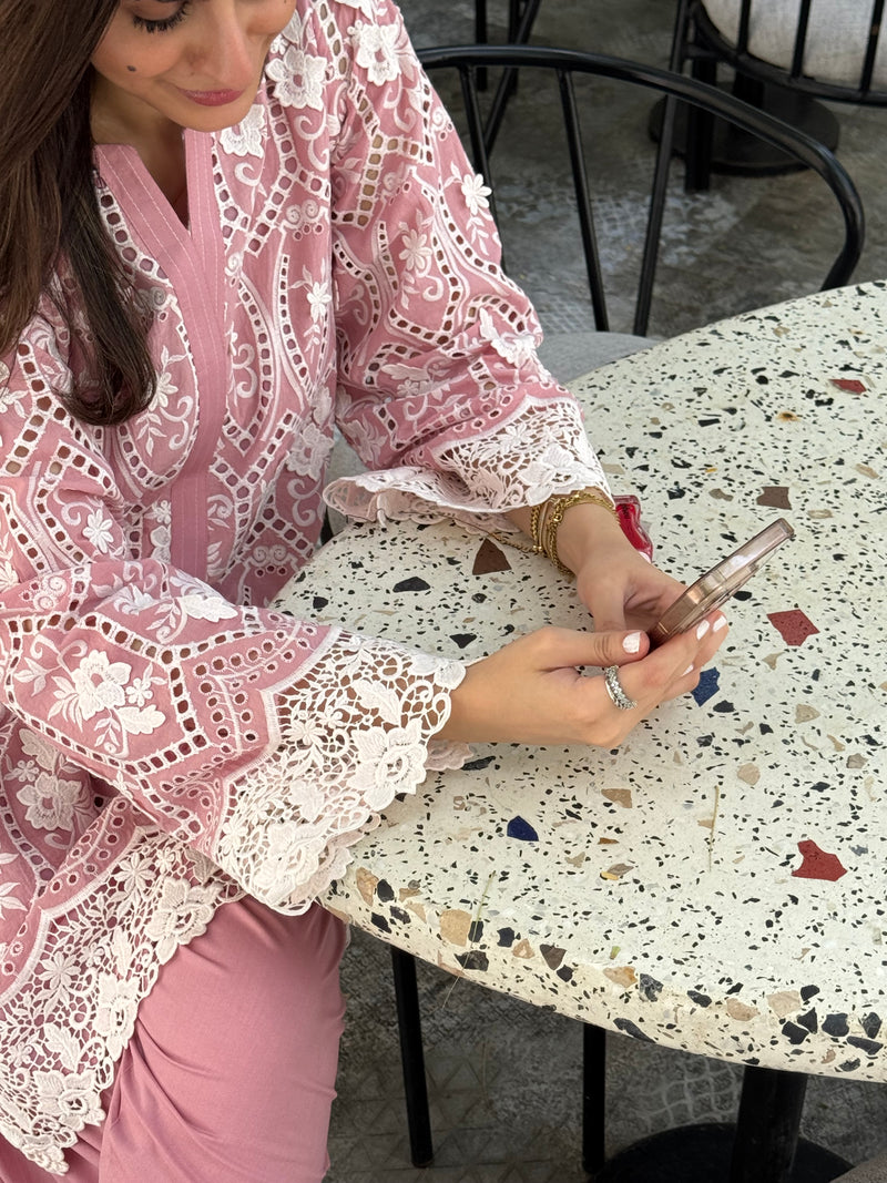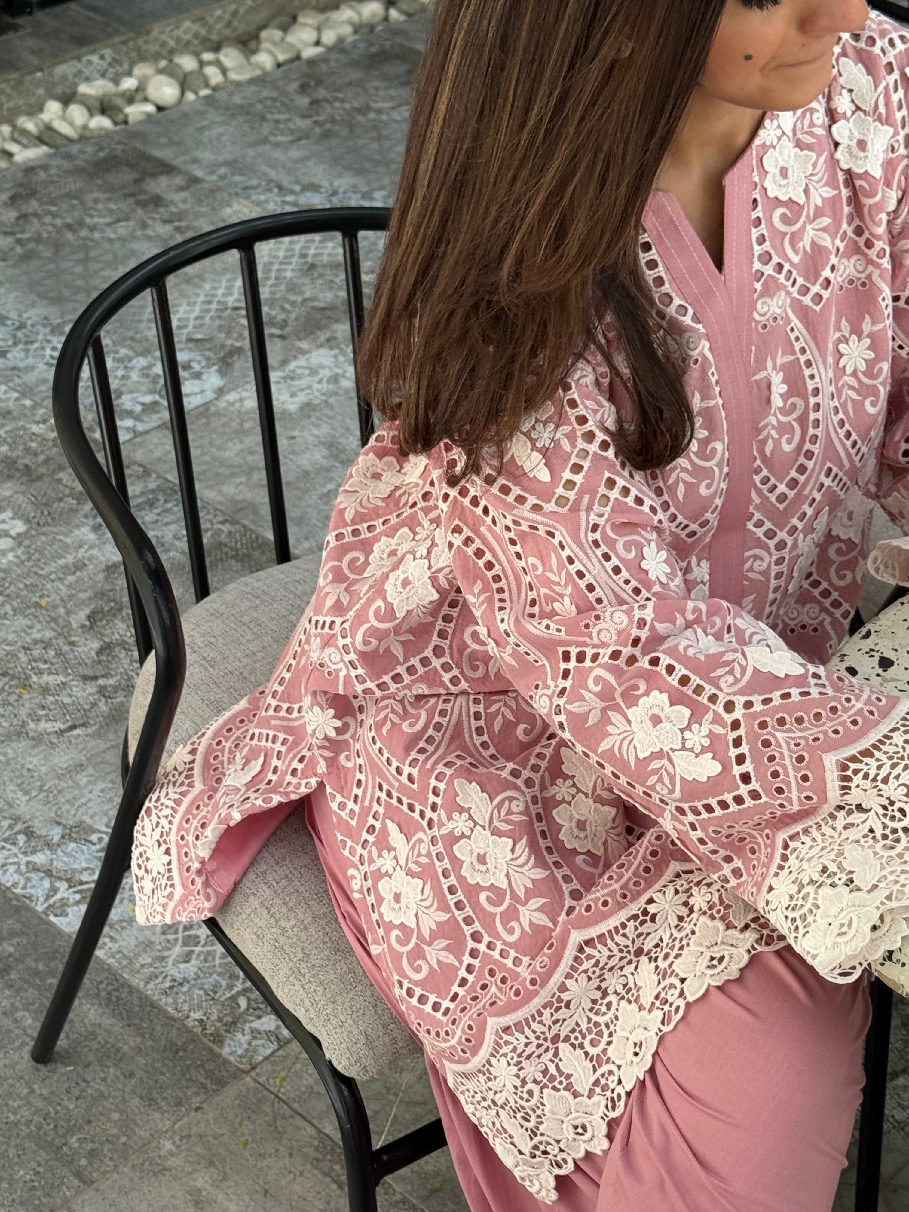 This powder pink 2-piece blends tradition and grace with a 3D motif on chikankari short shirt and classic shalwar creating a soft, elegant statement.