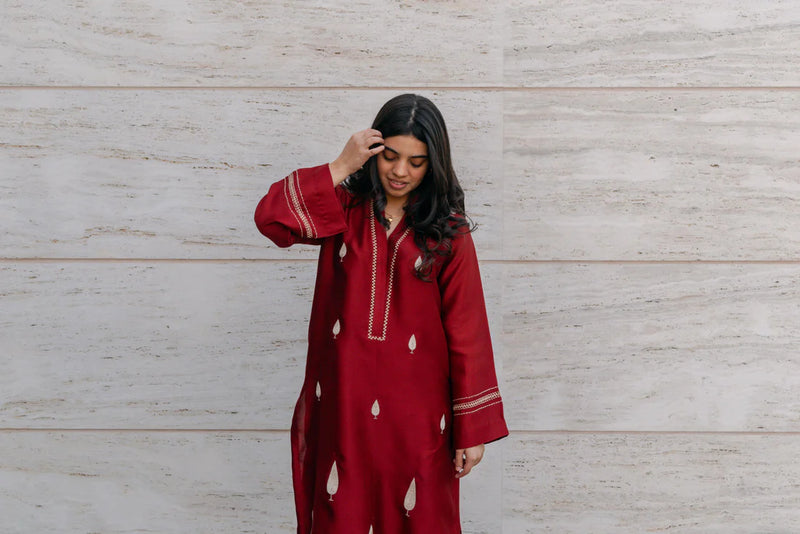 Inspired by the enduring Sarro (Cypress) tree, Surkh Sarro is a refined silk ensemble adorned with intricate hand embroidery. The deep surkh hue reflects tradition and elegance, while the embroidered cypress motifs add a cultural touch. Designed for those who appreciate timeless craftsmanship, this ensemble is perfect for both formal and festive occasions.